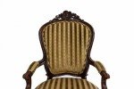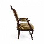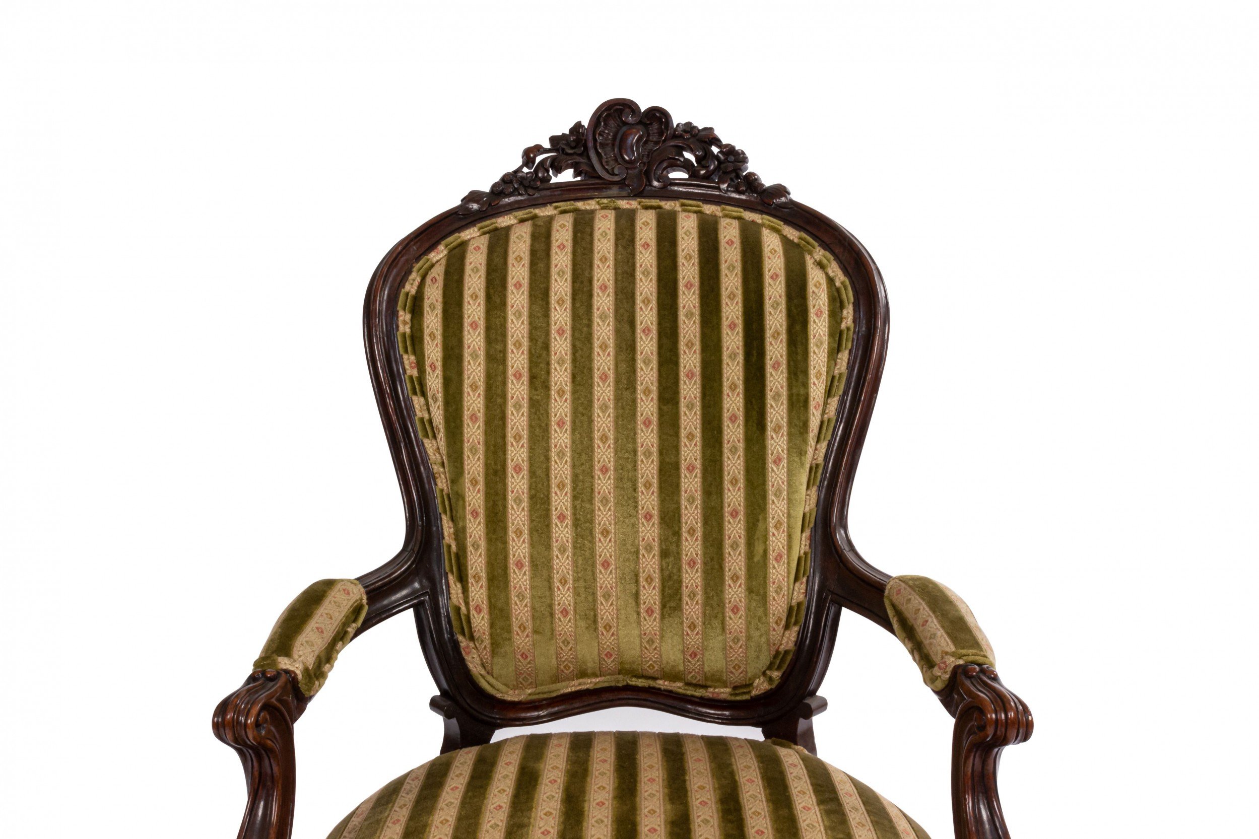 PAIR of French Victorian rosewood armchairs with carved back crest rail and striped velvet upholstery (similar to #038110)