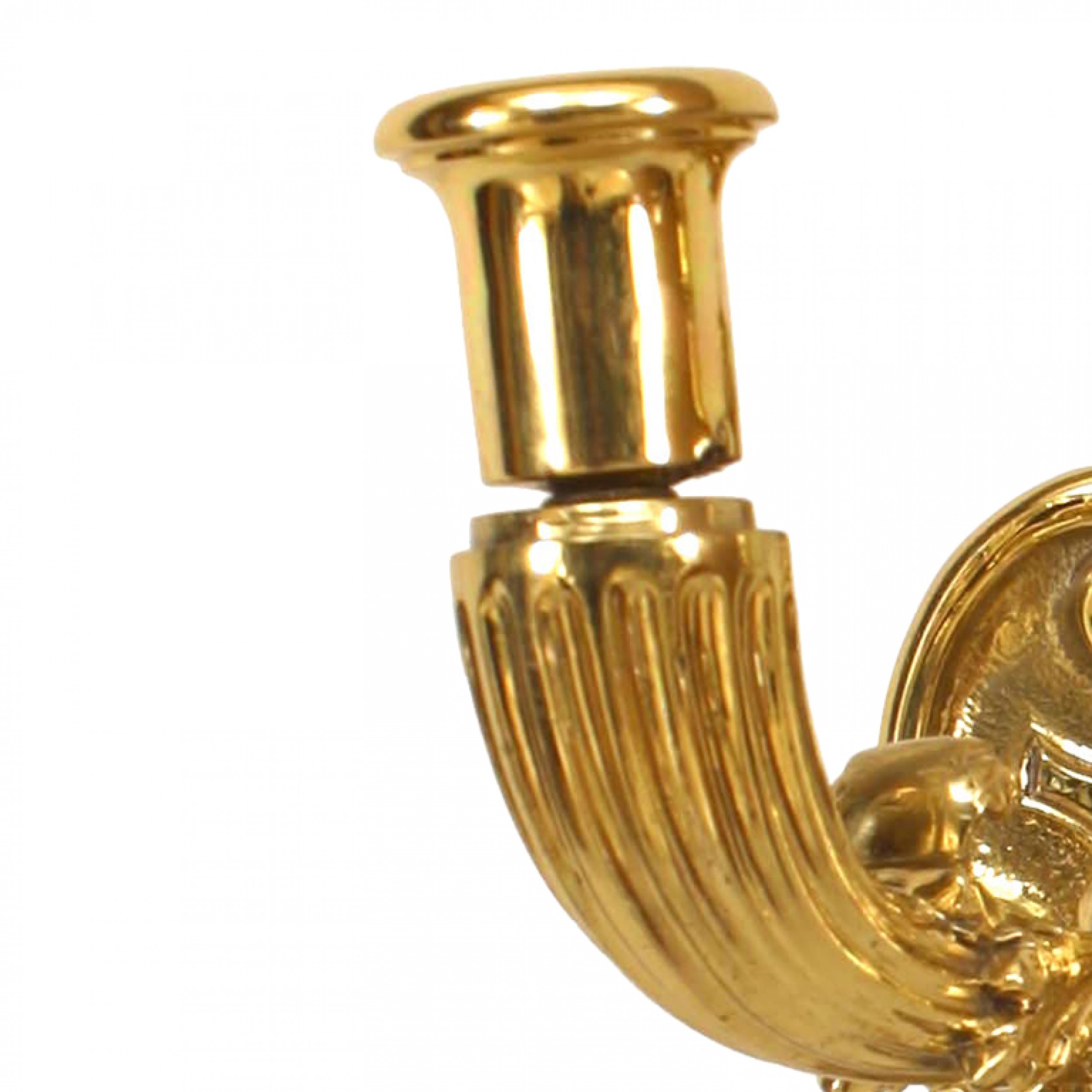 French Victorian-Style brass 2 light sconce with fluted scrolling foliate arms mounted on wall plaque..