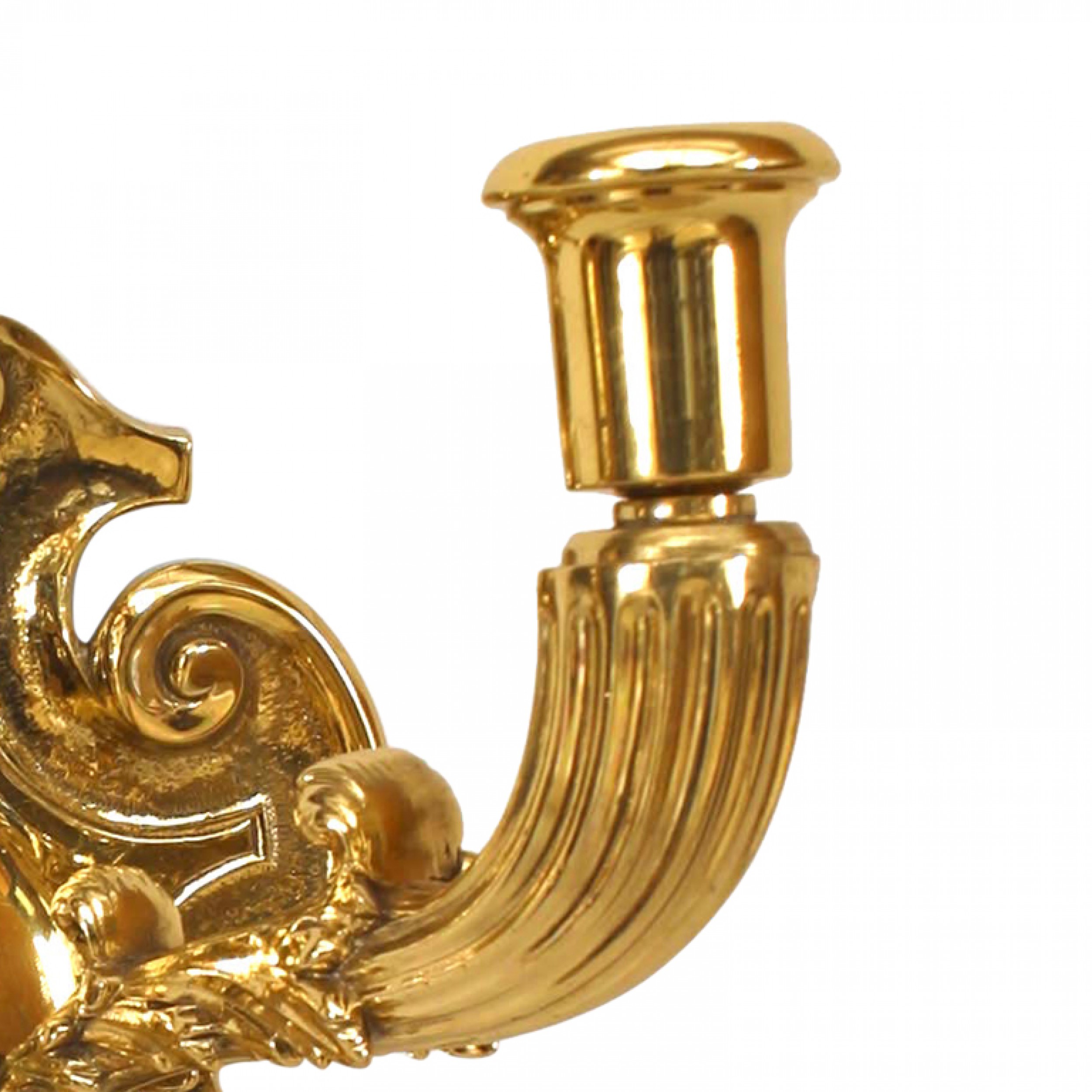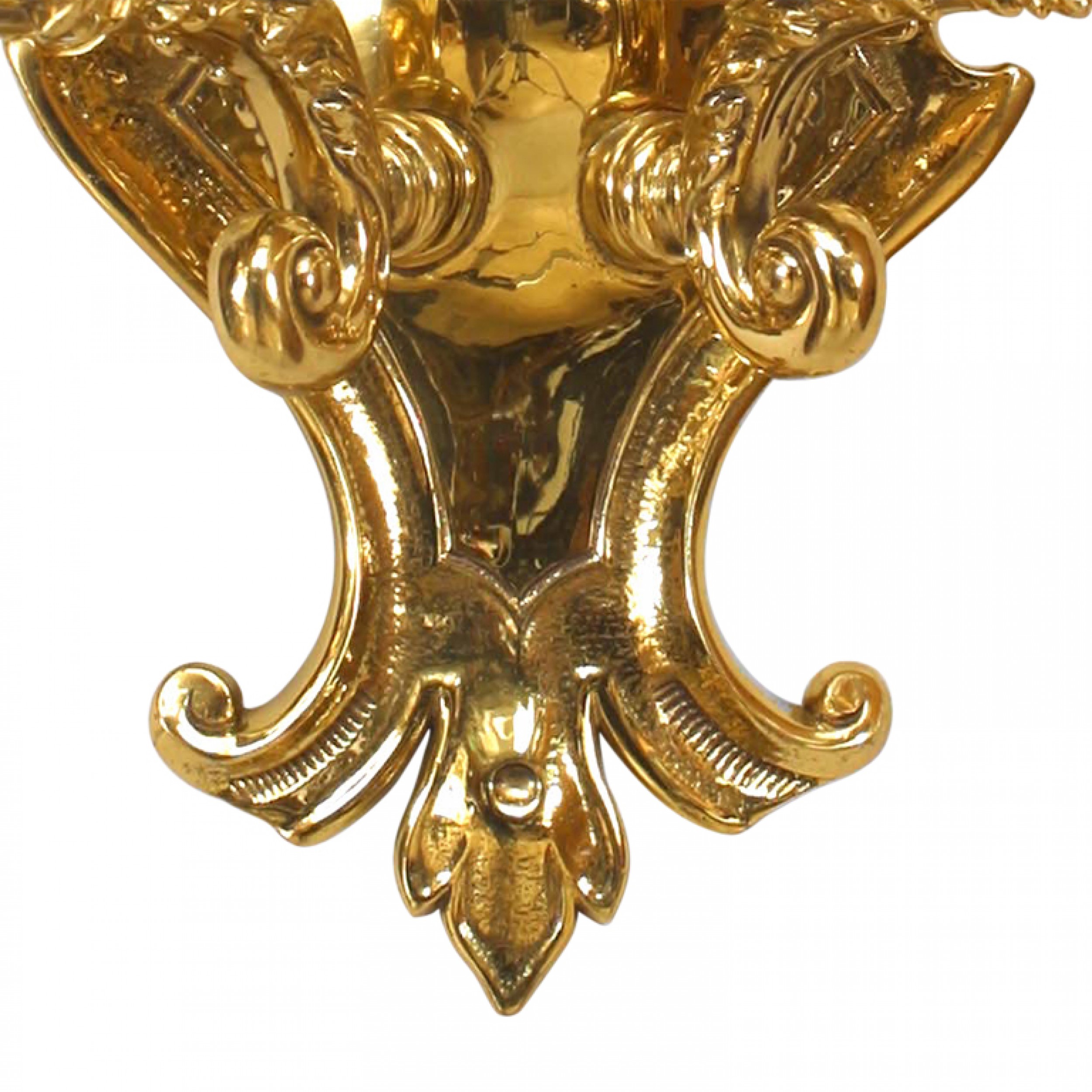 French Victorian-Style brass 2 light sconce with fluted scrolling foliate arms mounted on wall plaque.