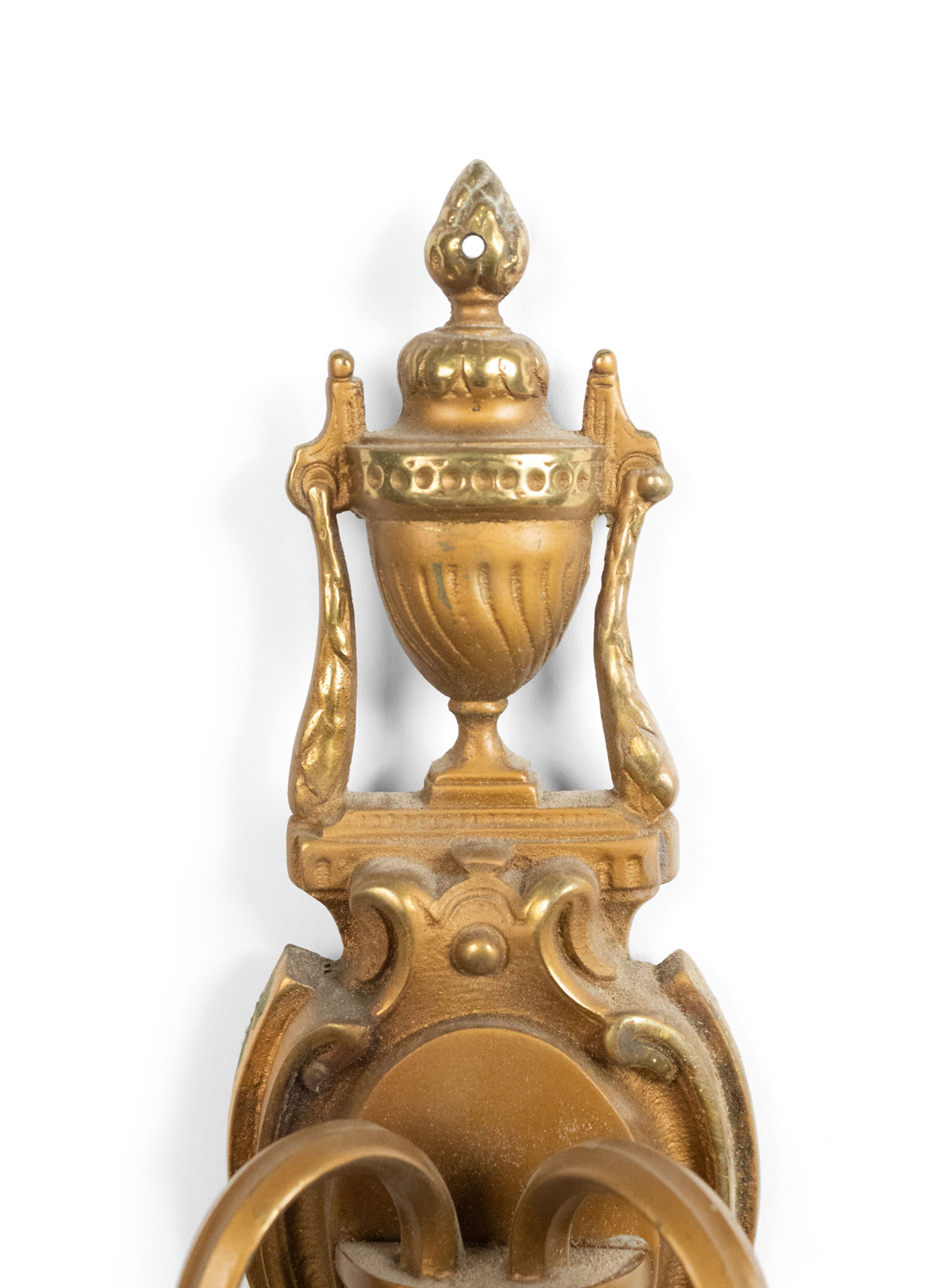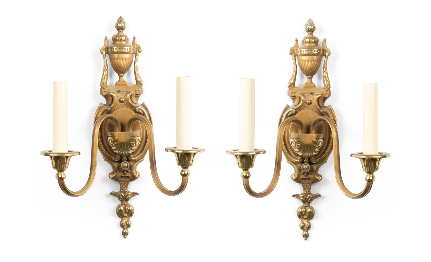 PAIR of French Victorian style (19/20th Century) bronze and copper patina wall sconces with two arms and decorative urn tops (PRICED AS PAIR)
