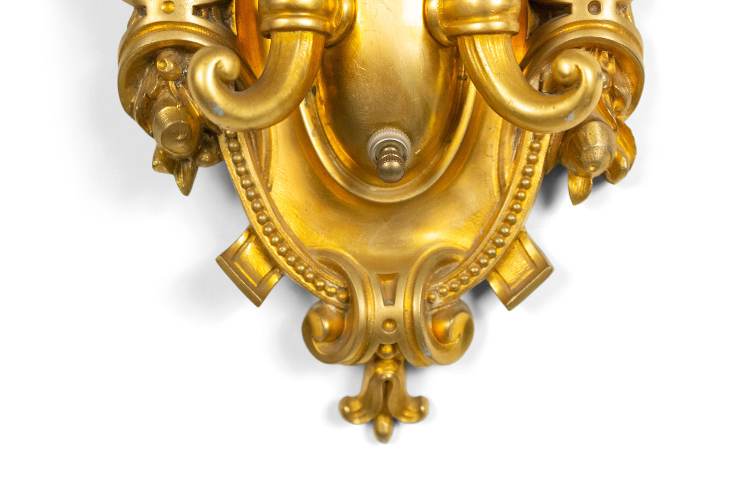 French Victorian-style (19/20th Century) bronze dore wall sconce with two arms, a cornucopia motif, and an oval scroll design backplate..