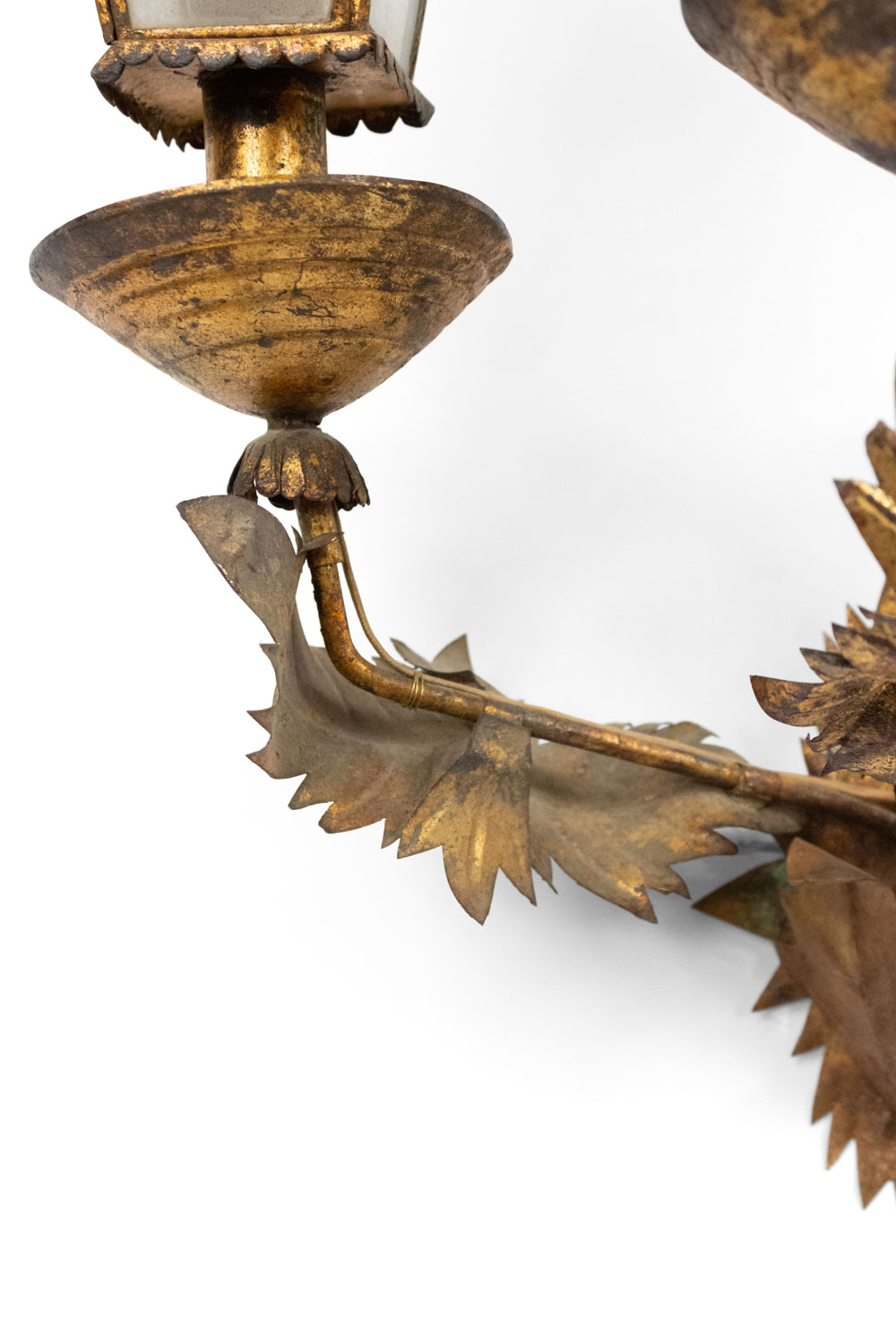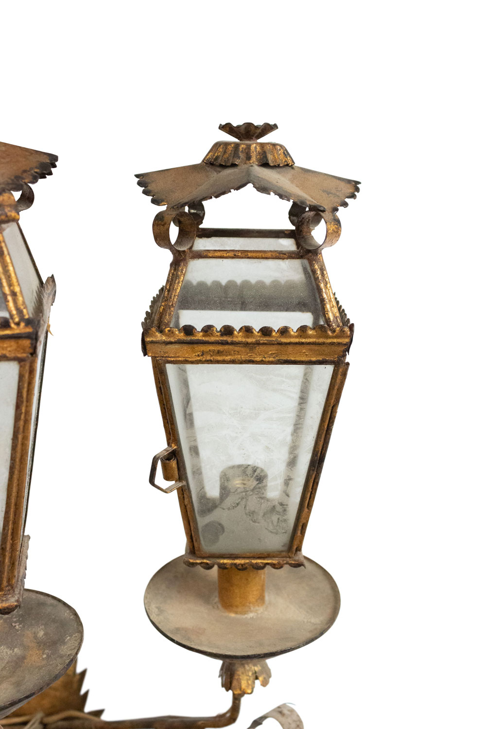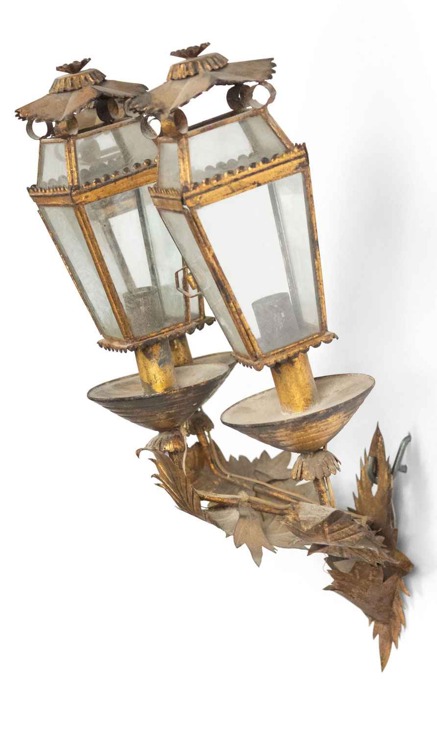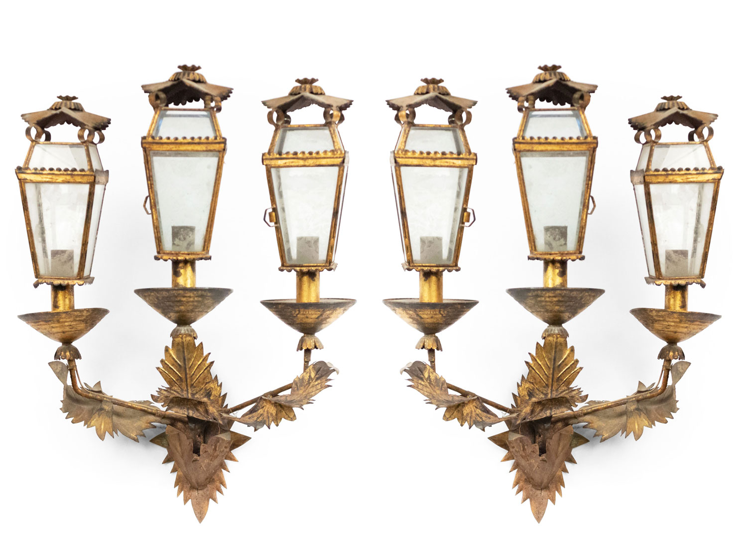 PAIR of French Victorian-style (20th Century) gilt metal triple lantern wall sconces with leaf design. (PRICED AS PAIR).