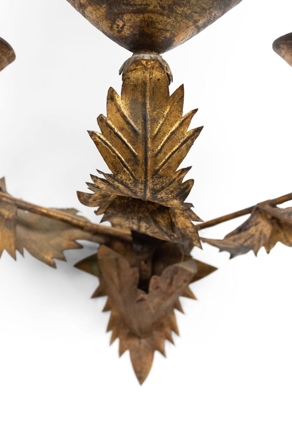 PAIR of French Victorian-style (20th Century) gilt metal triple lantern wall sconces with leaf design. (PRICED AS PAIR)