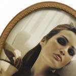 French Victorian-style oval gilt brass easel picture frame with narrow etched design with a brass backing..