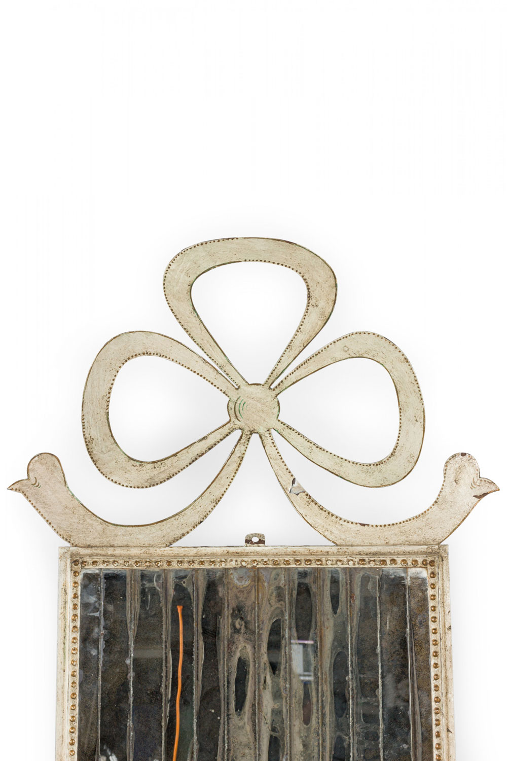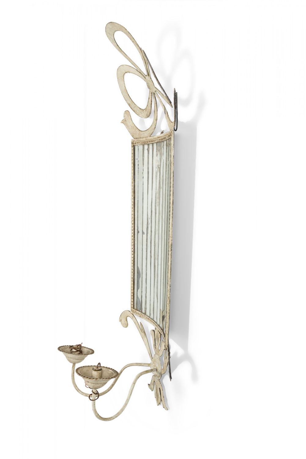 French Victorian-style (20th Century) white and gold tole wall mirror with vertical, slivered glass , a bow knot top, and side arms.