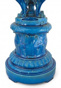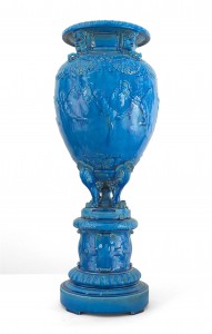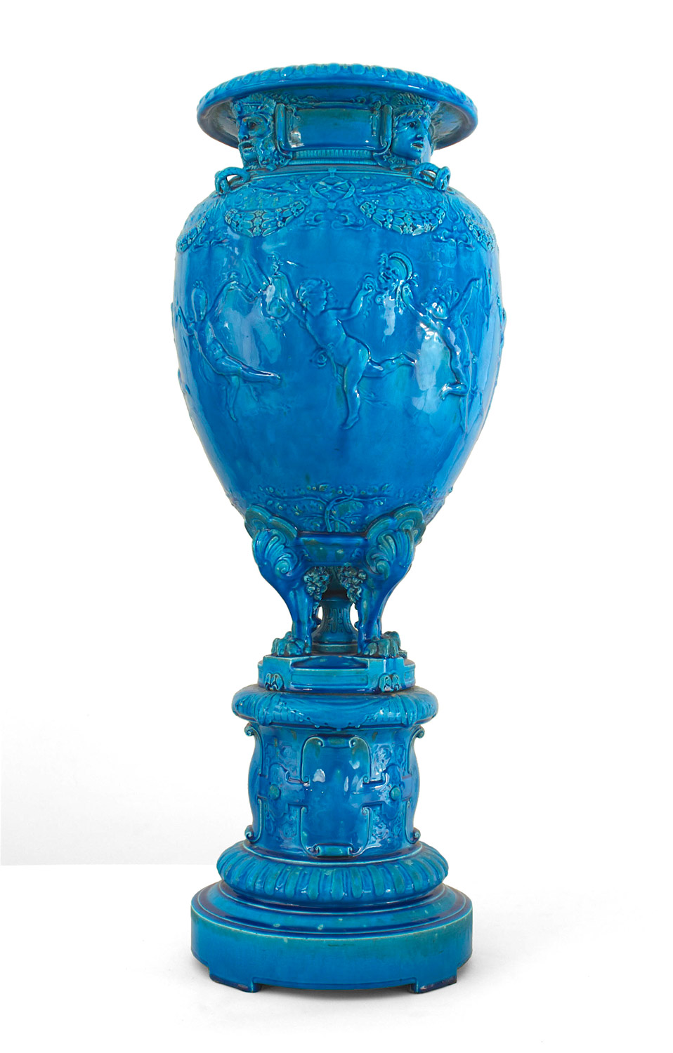 French Victorian monumental turquoise Sevres porcelain vase with cupids in relief on round pedestal base (signed JOSEPH CHERET)