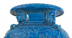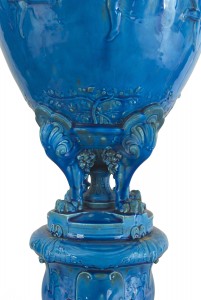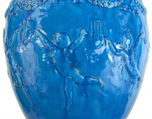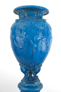 French Victorian monumental turquoise Sevres porcelain vase with cupids in relief on round pedestal base (signed JOSEPH CHERET).