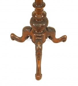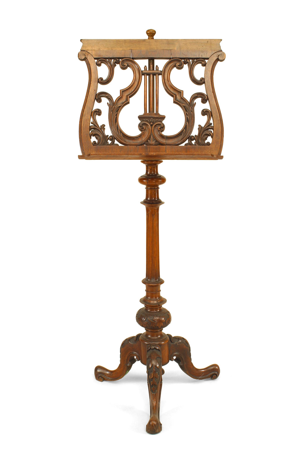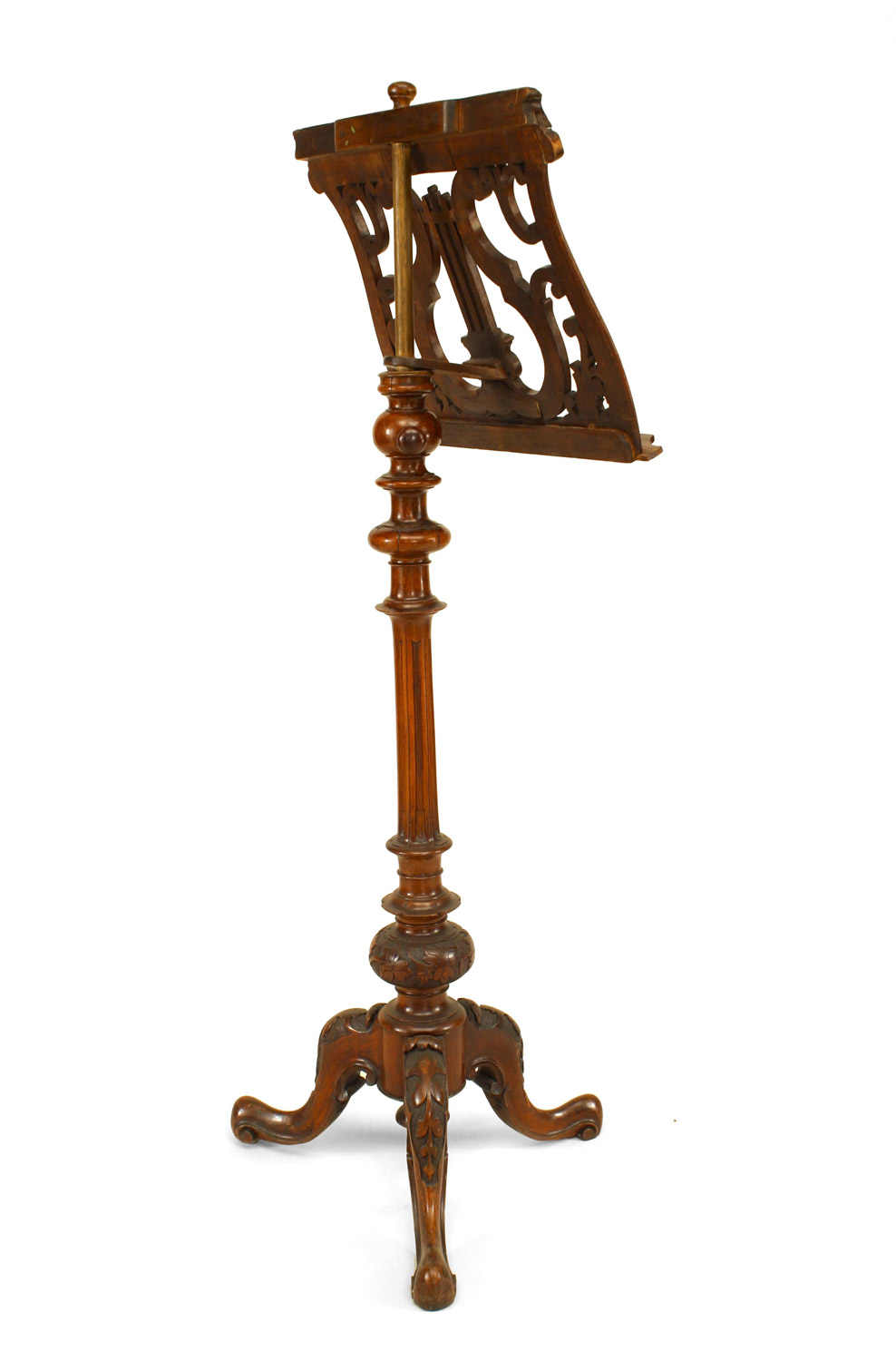 French Victorian carved walnut and filigree lyre top adjustable music stand with fluted acanthus leaf base..