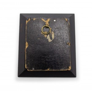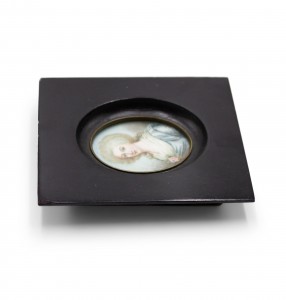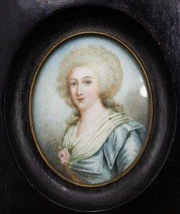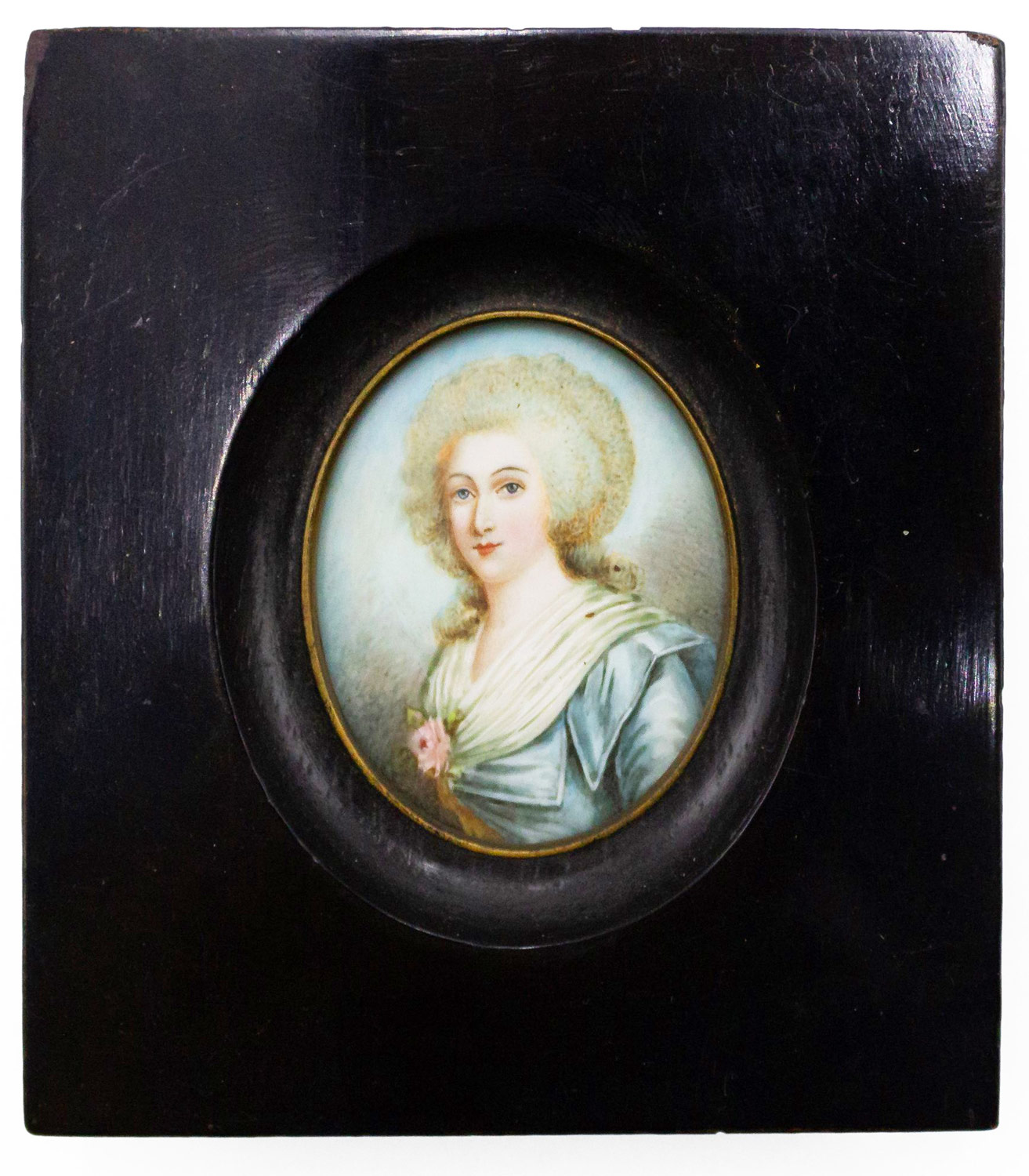 French Victorian oval miniature watercolor on vellum portrait of a woman with a light blue dress in an ebonized frame