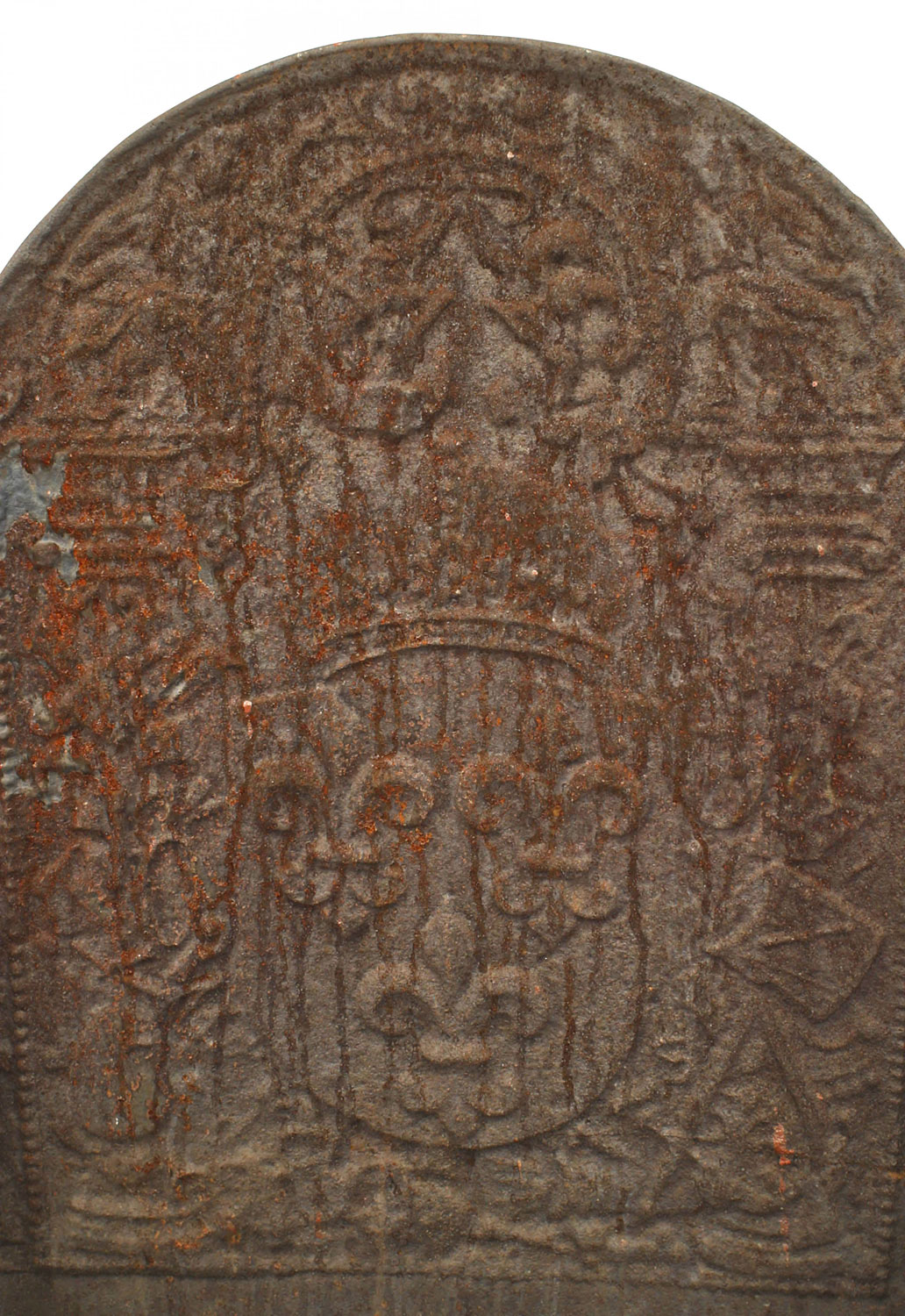 French Victorian wrought iron fire grate with arch design backing with fleur de lis design and sun flower finials on front.