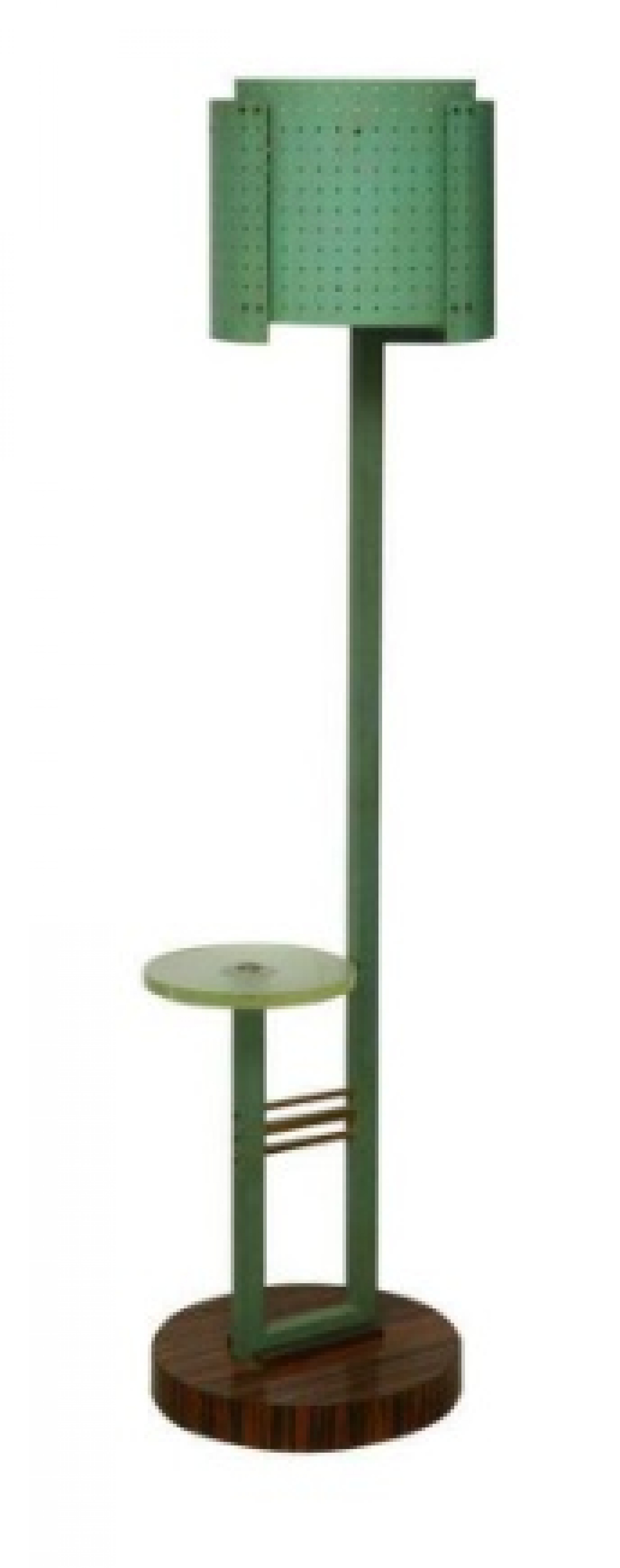 Art Deco floor lamp with a pierced metal shade above a square rod, which turns upward to create a circular glass tabletop, resting on an ebony de Macassar base. (GEORGES DJO-BOURGEOISE)