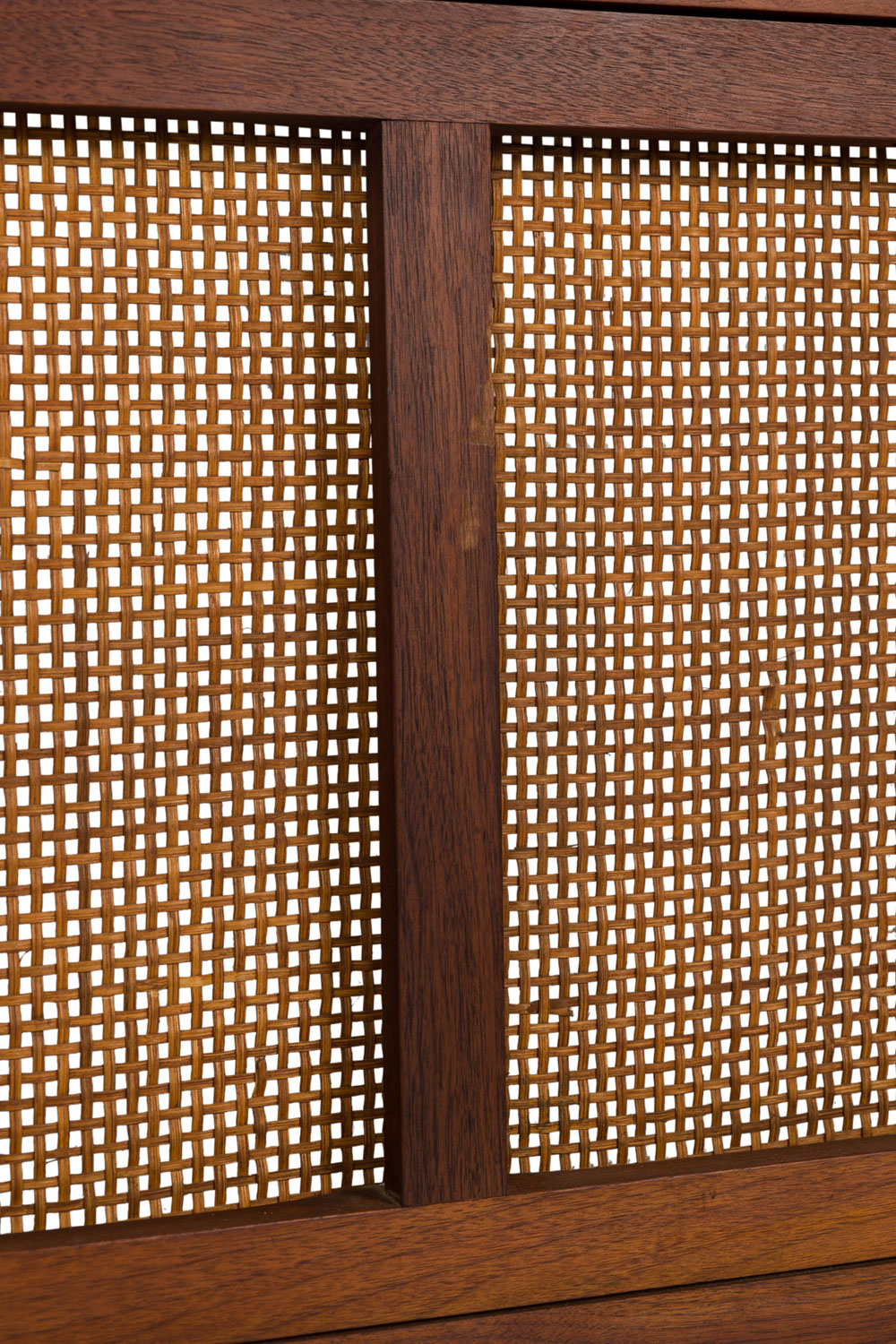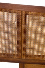 Style: Mid-Century Materials & Techniques: Caning, walnut, wood Category: Bedroom Condition: A caning loss on the first left section Good; Minor losses