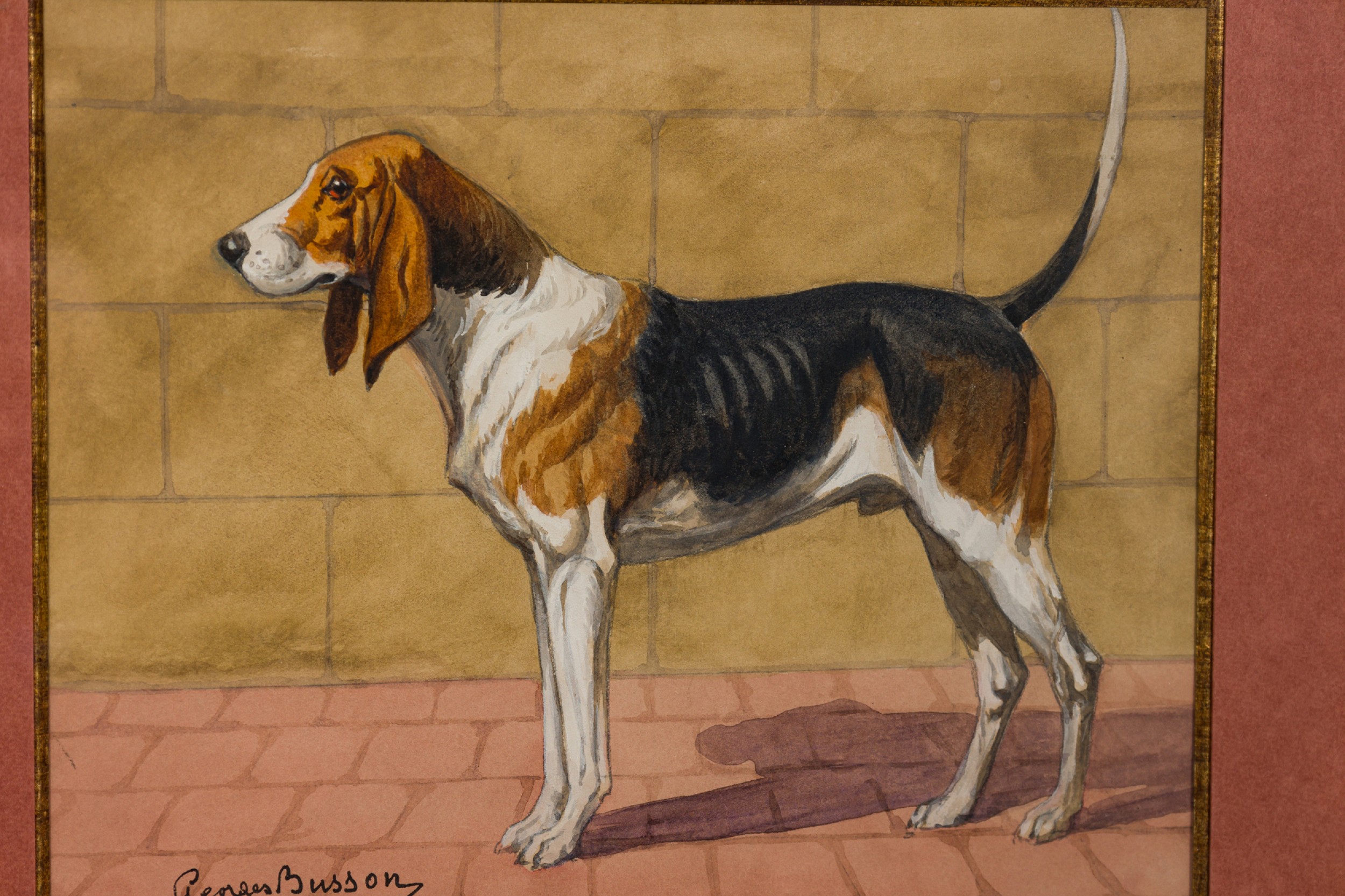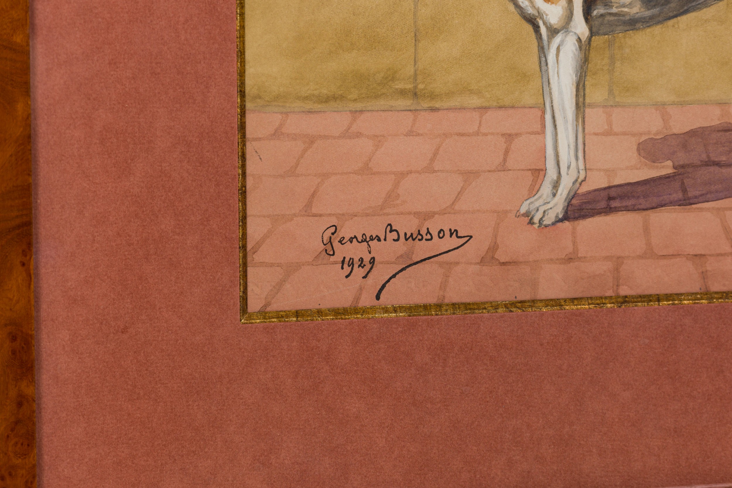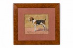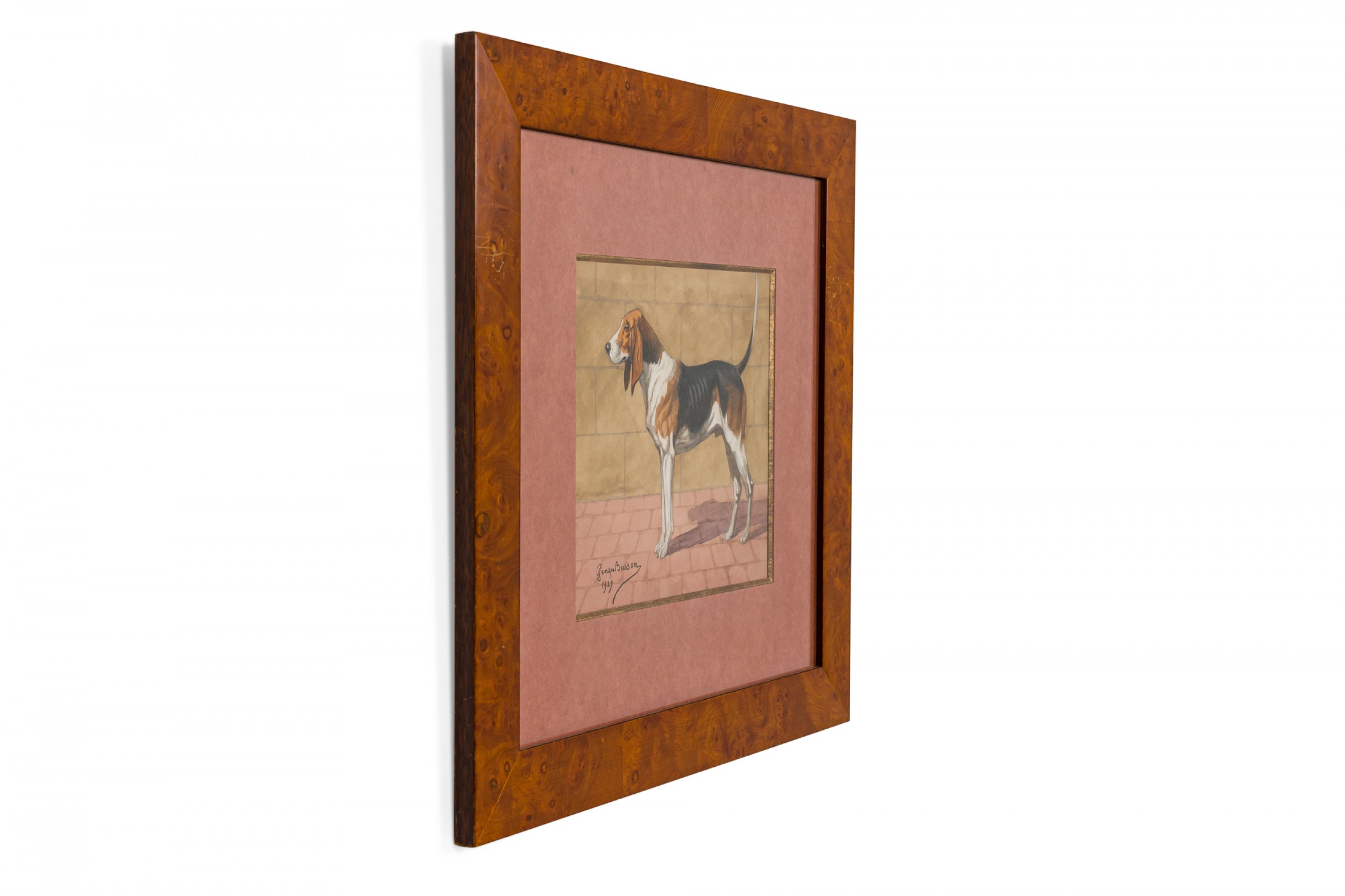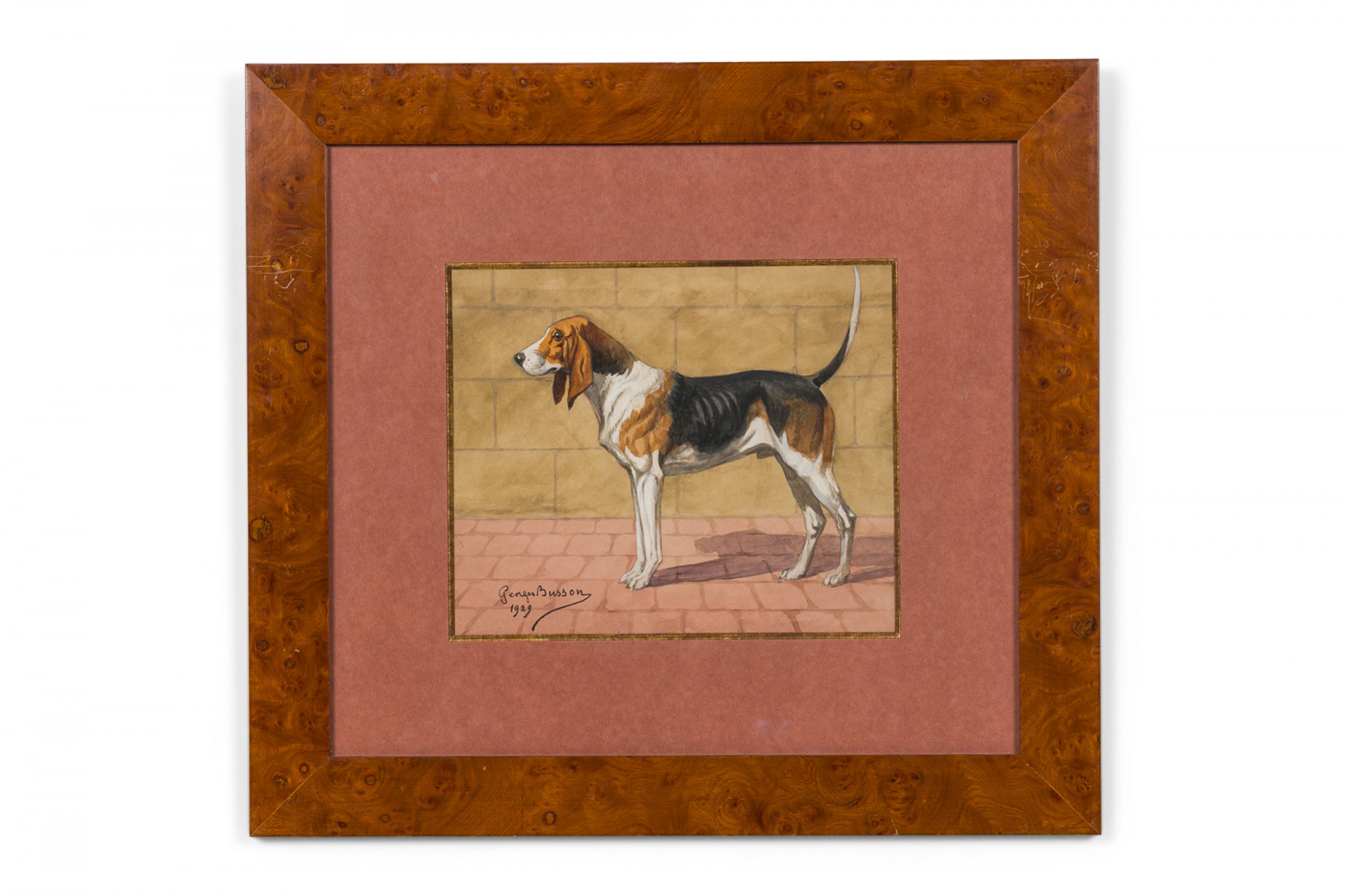French Art Deco watercolor of a brown, black and white foxhound, framed in a burl walnut frame. (signed GEORGES BUSSON, dated 1929)(Companion pieces: 058035A-B-C-D-F)