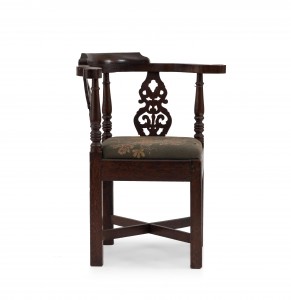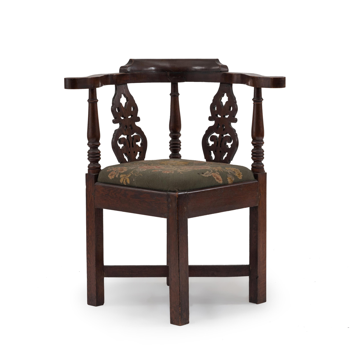 English Georgian Style Filigree Oak and Needlepoint Corner Armchair