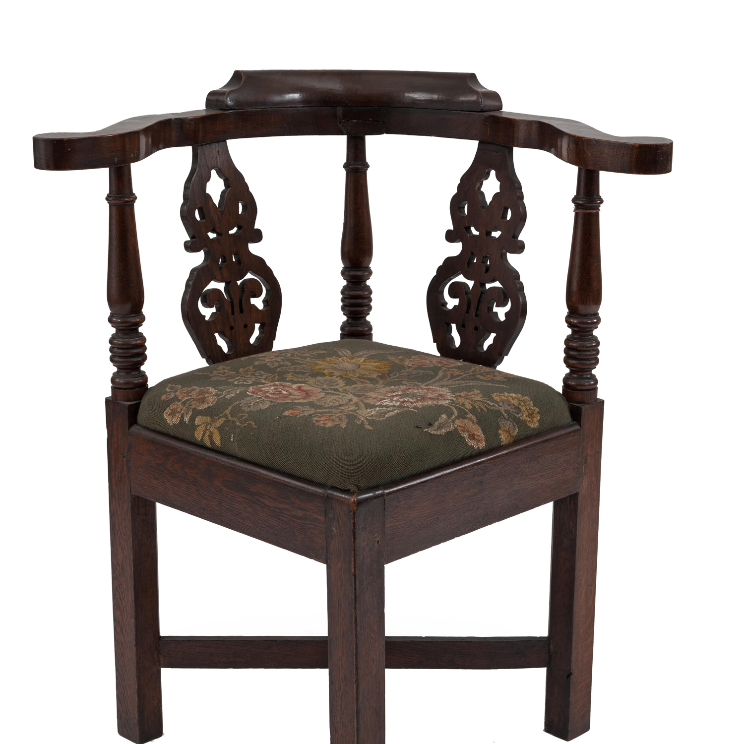 English Georgian-style (19th Century) oak corner armchair with filigree splat back and needlepoint seat.