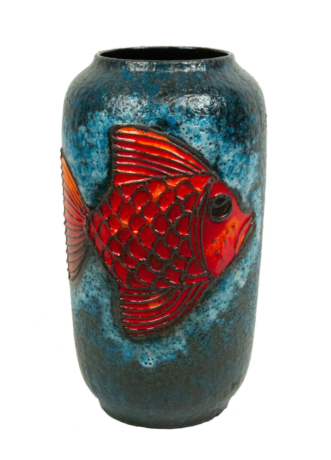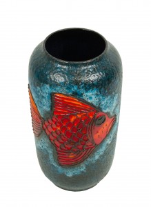 German mid-century tall cylindrical dark blue vase with large orange fish..
