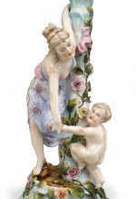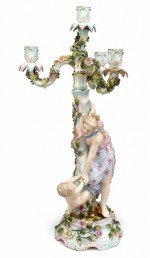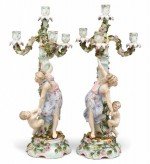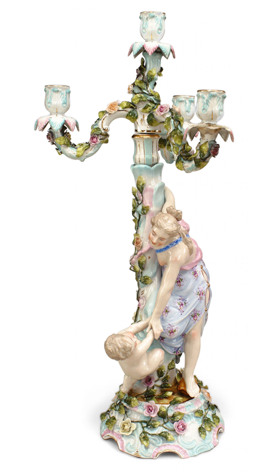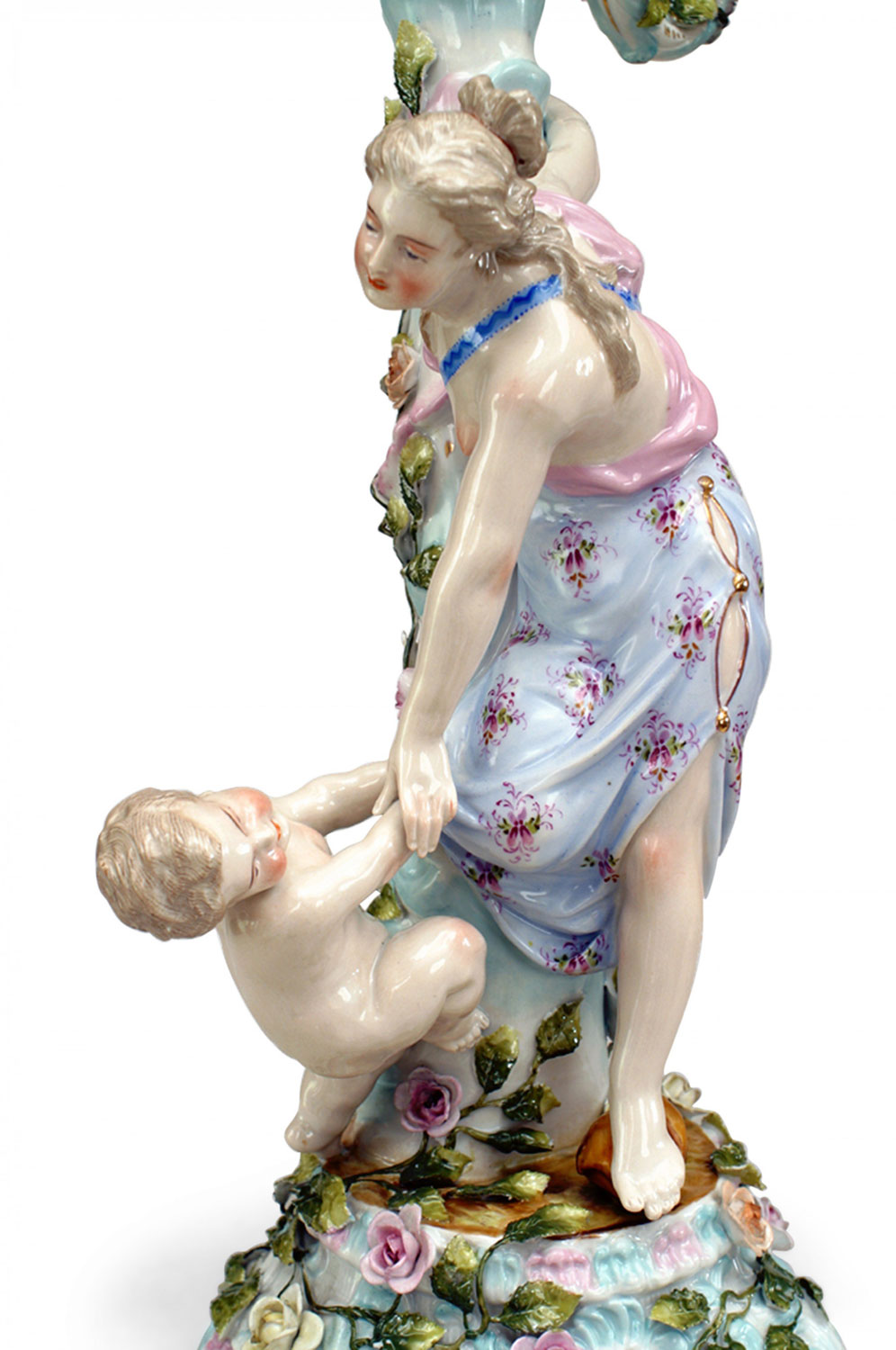 Pair of German Dresden Porcelain Candelabras with Lady and Child Figures