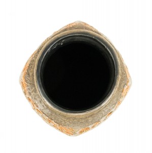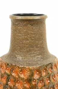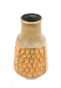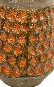 Germany mid-century olive green ceramic vase with an orange incised centered multiple shell form pattern (JASBA)..