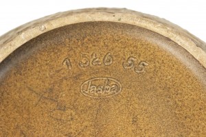 Germany mid-century olive green ceramic vase with an orange incised centered multiple shell form pattern (JASBA).