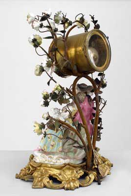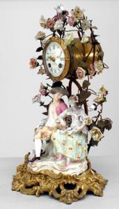 German Meissen (19th Century) porcelain group of men and women with floral and bronze branches around mantel clock (not working).