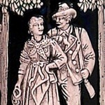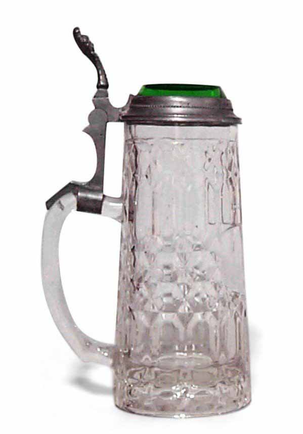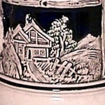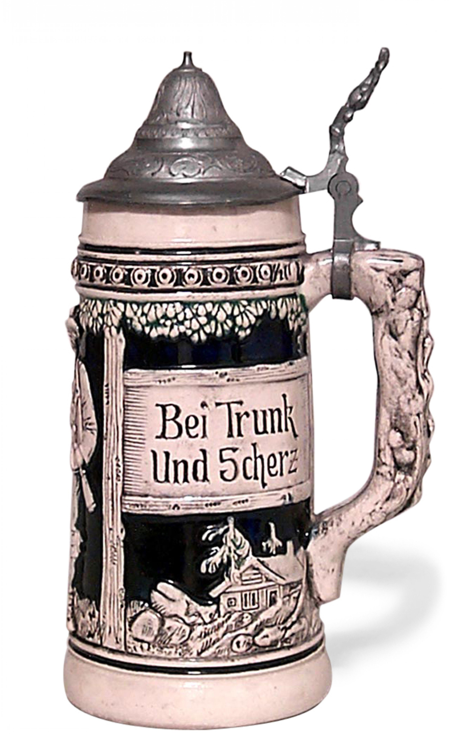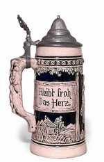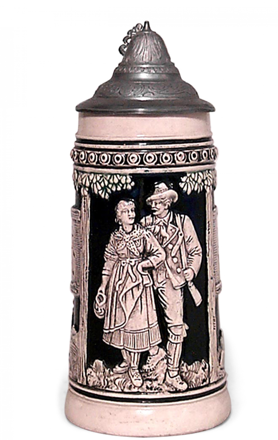 German (late 19th Century-possibly by ADOLF DIESINGER) beige and blue porcelain beer stein with scene of hunter and wife with pewter cover (Estate of Robert Ripley).
