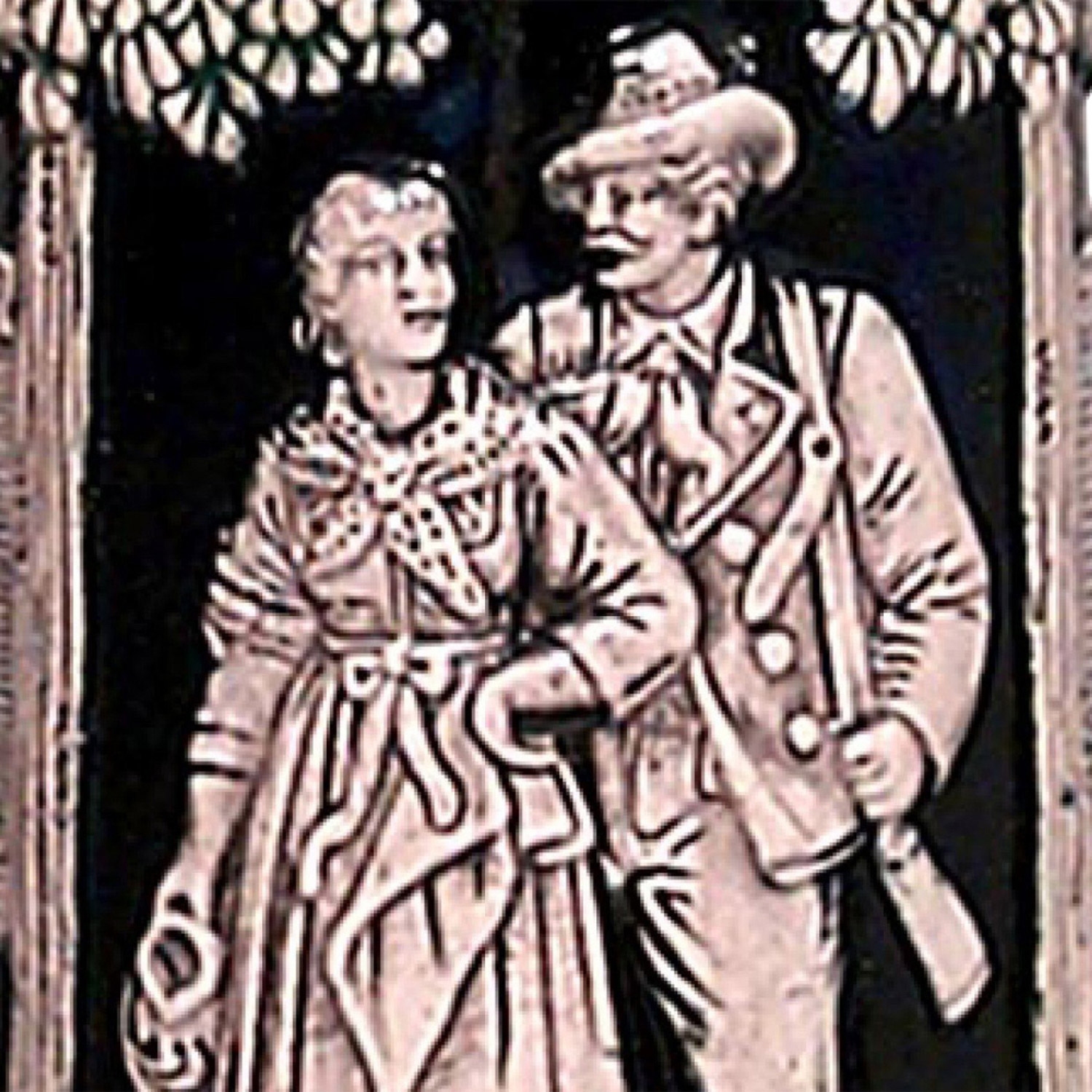 German (late 19th Century-possibly by ADOLF DIESINGER) beige and blue porcelain beer stein with scene of hunter and wife with pewter cover (Estate of Robert Ripley)