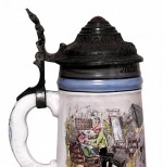 German (20th Century) porclain beer stein with barber scene and pewter cover with yellow jewel top (with1888 on base).