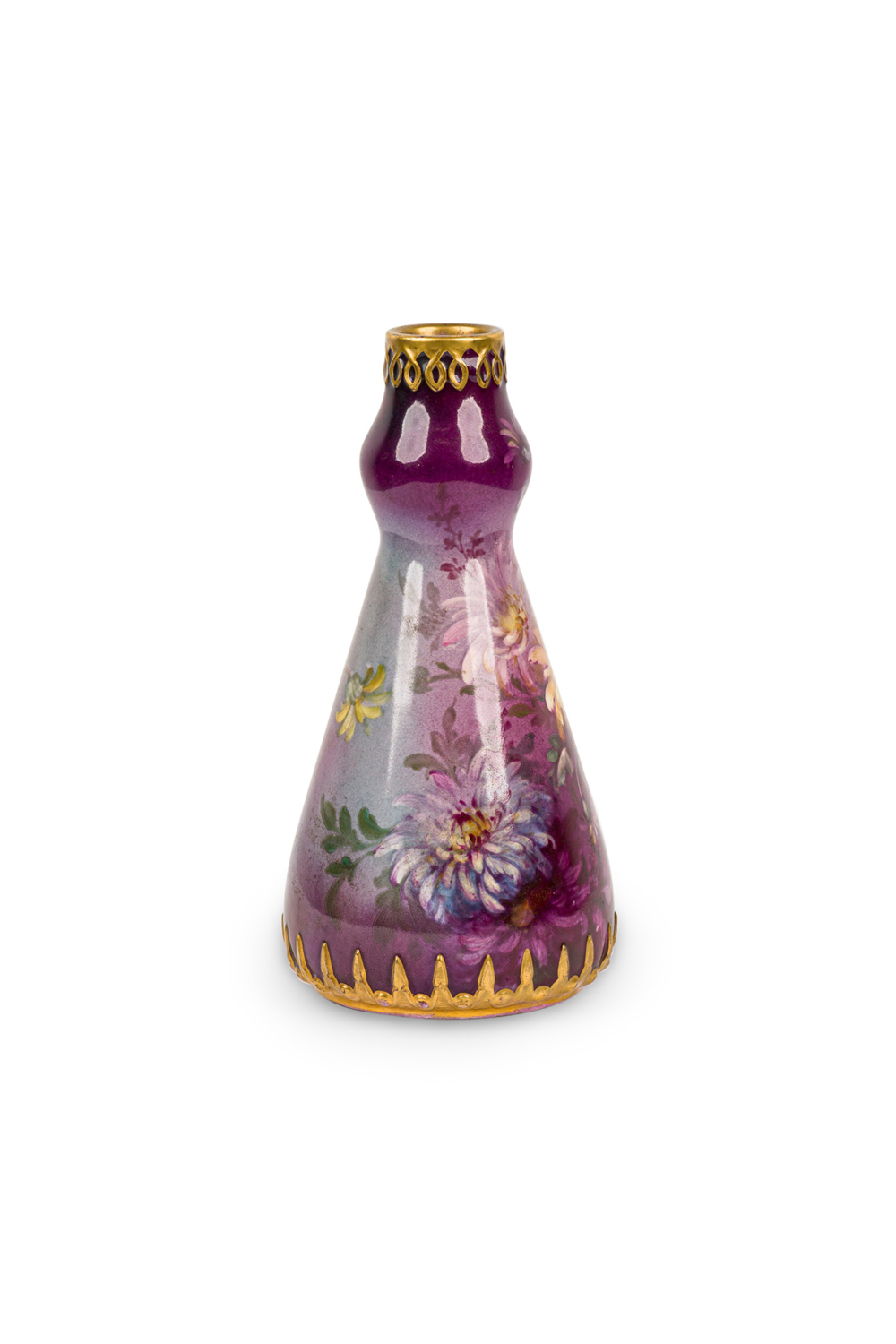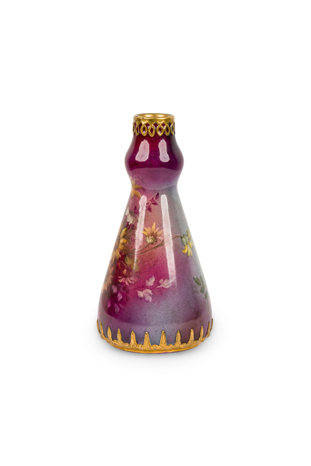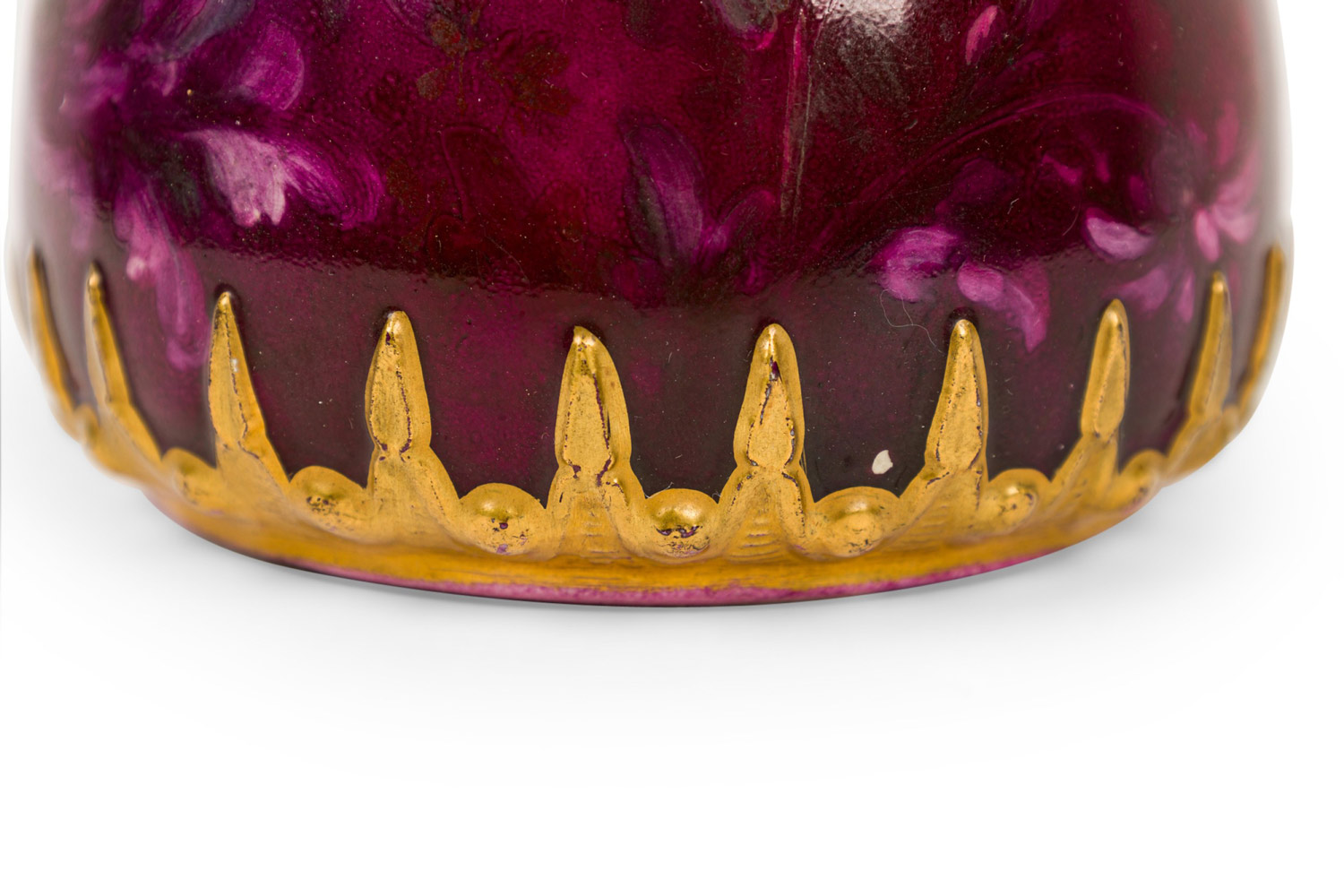 German (19th Cent) Royal Bonn red porcelain shaped vase with floral design and gilt trimmed top and bottom