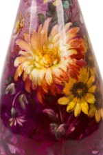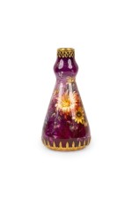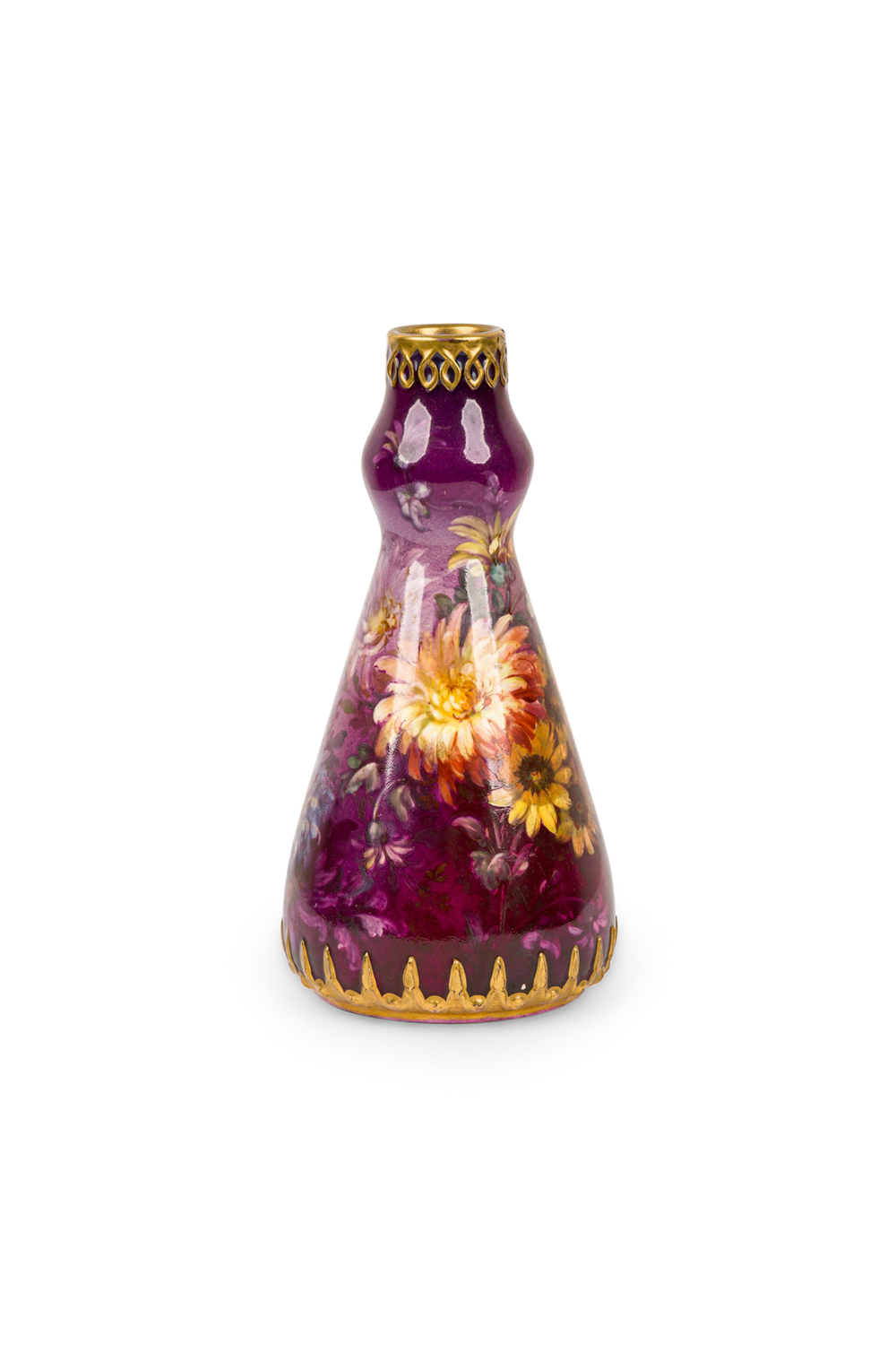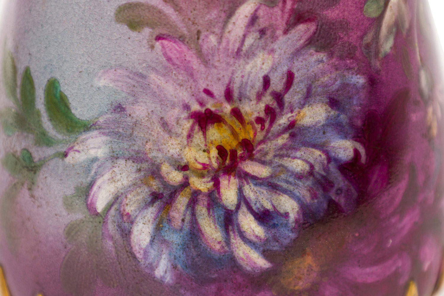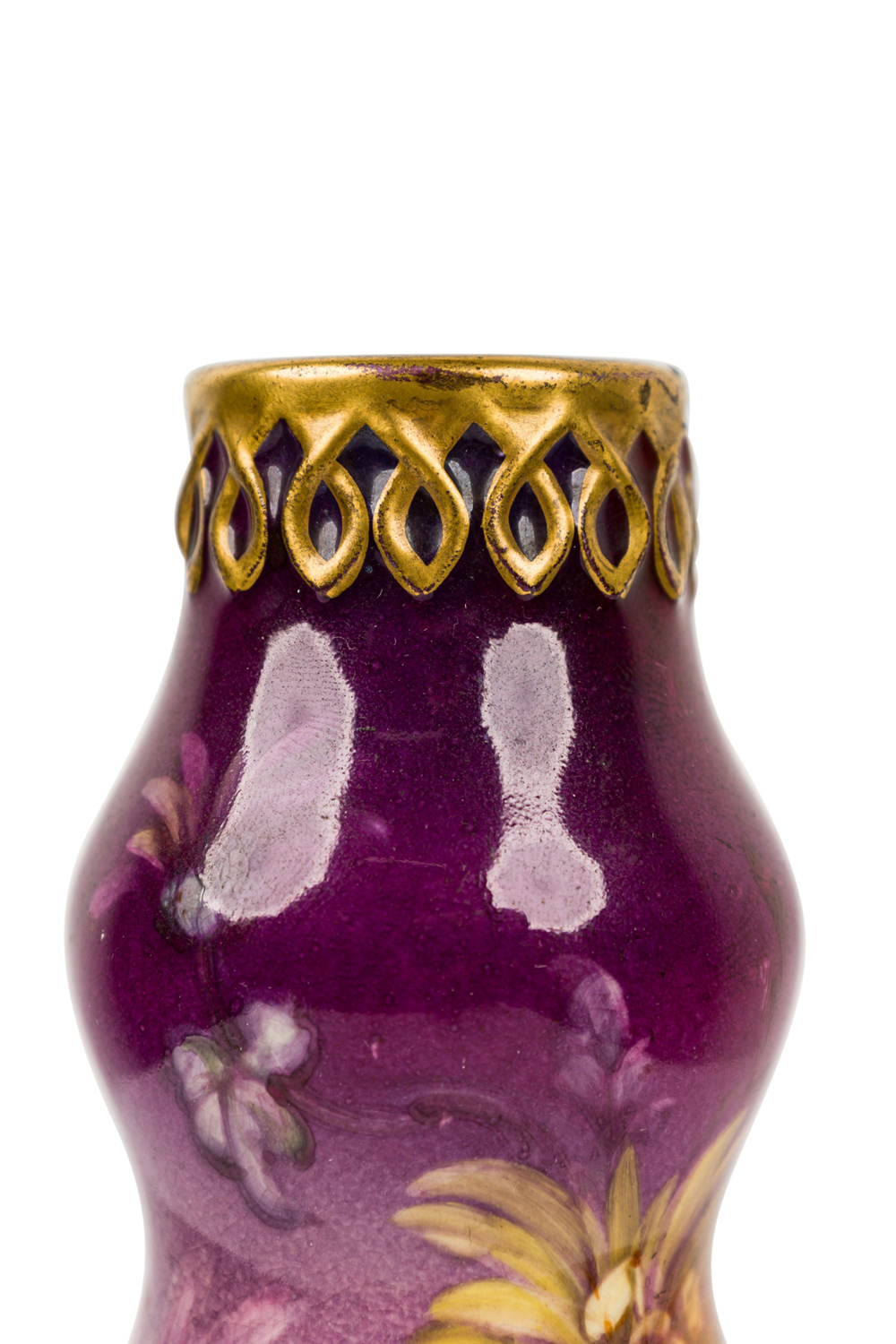 German (19th Cent) Royal Bonn red porcelain shaped vase with floral design and gilt trimmed top and bottom