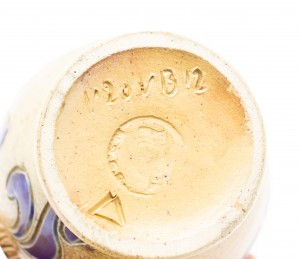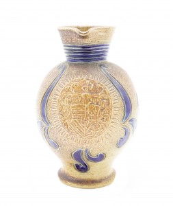 German (19th Century) stoneware pitcher with handle and incised navy floral decorations with a coat of arms impressed on front (Signed on base)