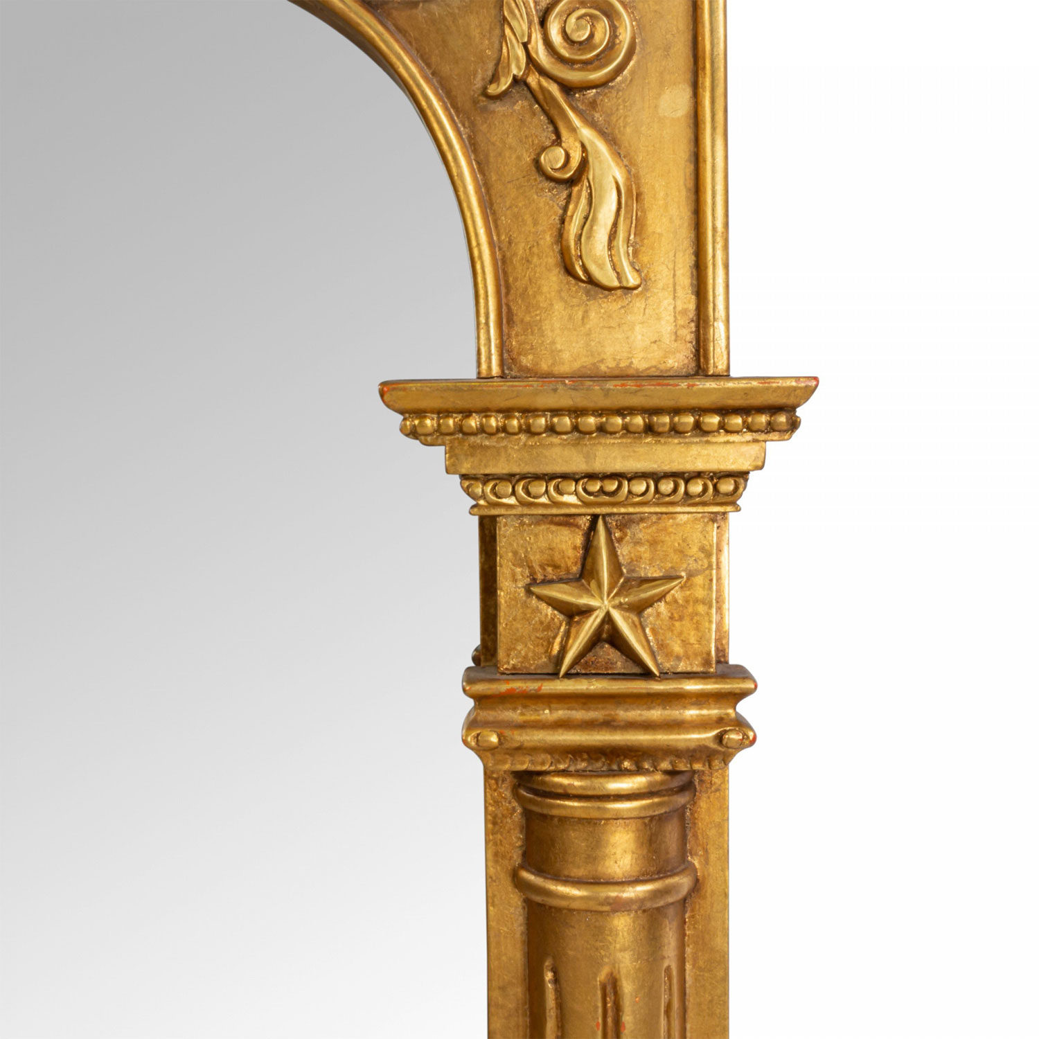 American Federal style (20th Century) large carved giltwood wall mirror with carved eagle pediment, scroll detail, and two decorative columns featuring five-pointed stars.