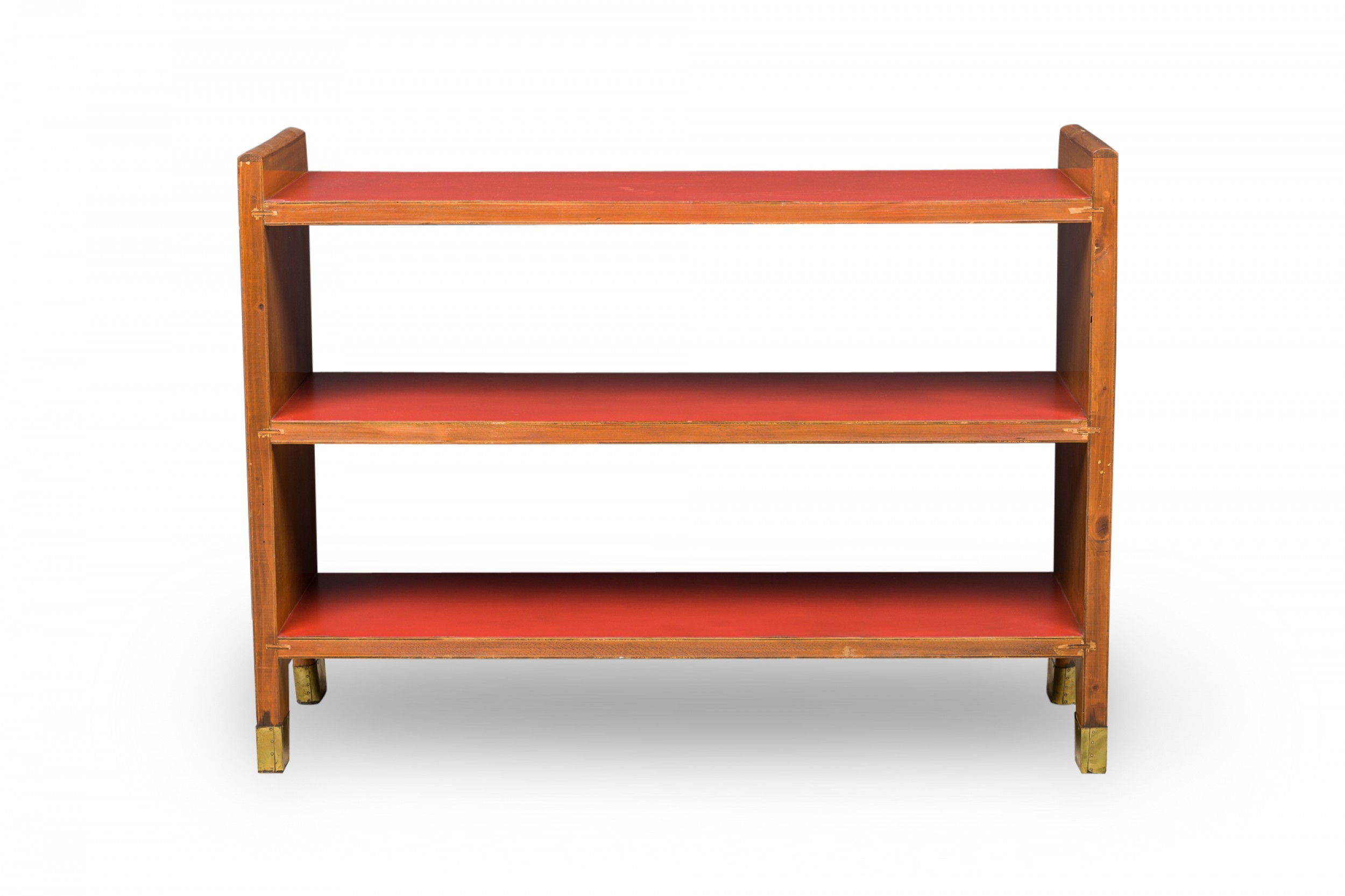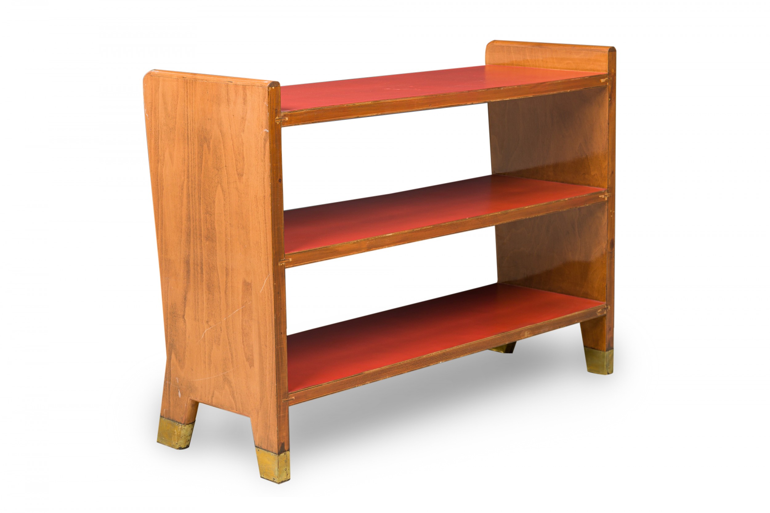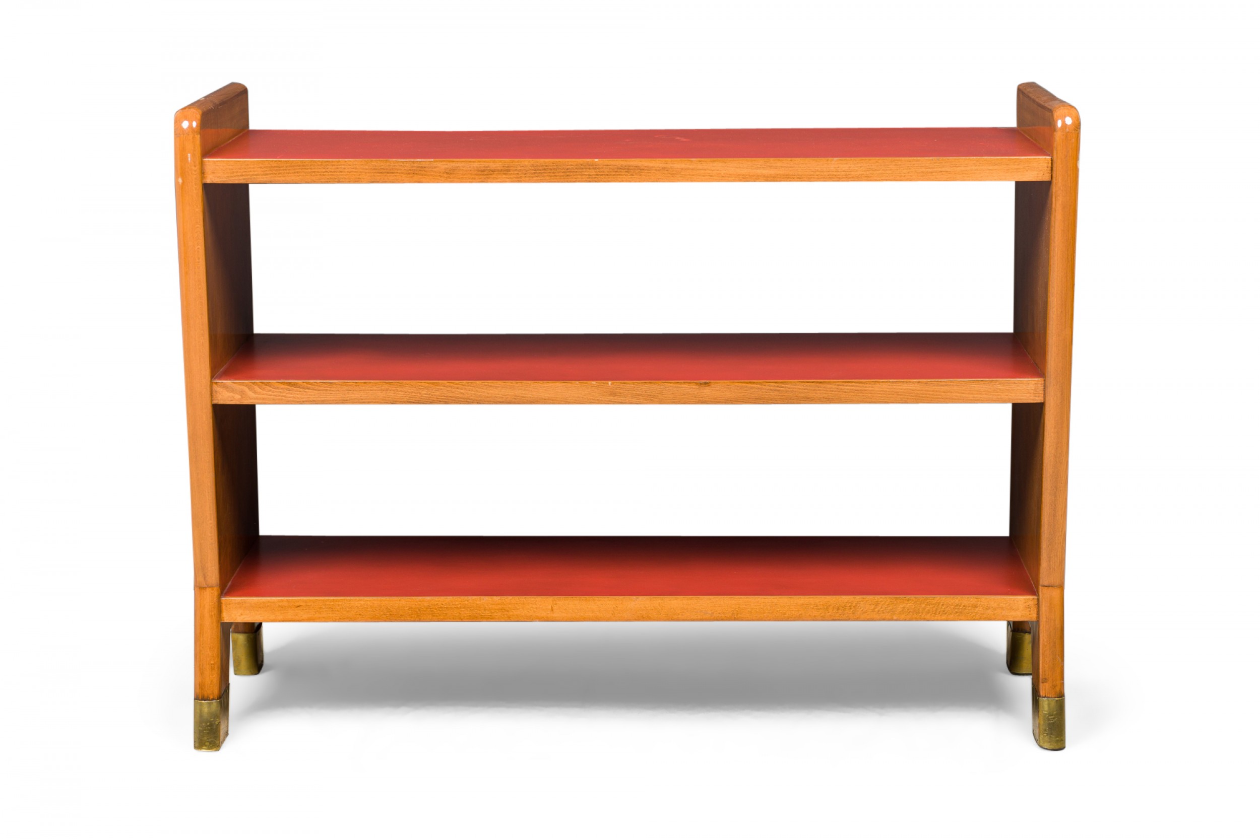 Italian Mid-Century (1950s) small 3-shelf fruitwood bookcase with red leather shelf covers. (GIO PONTI).