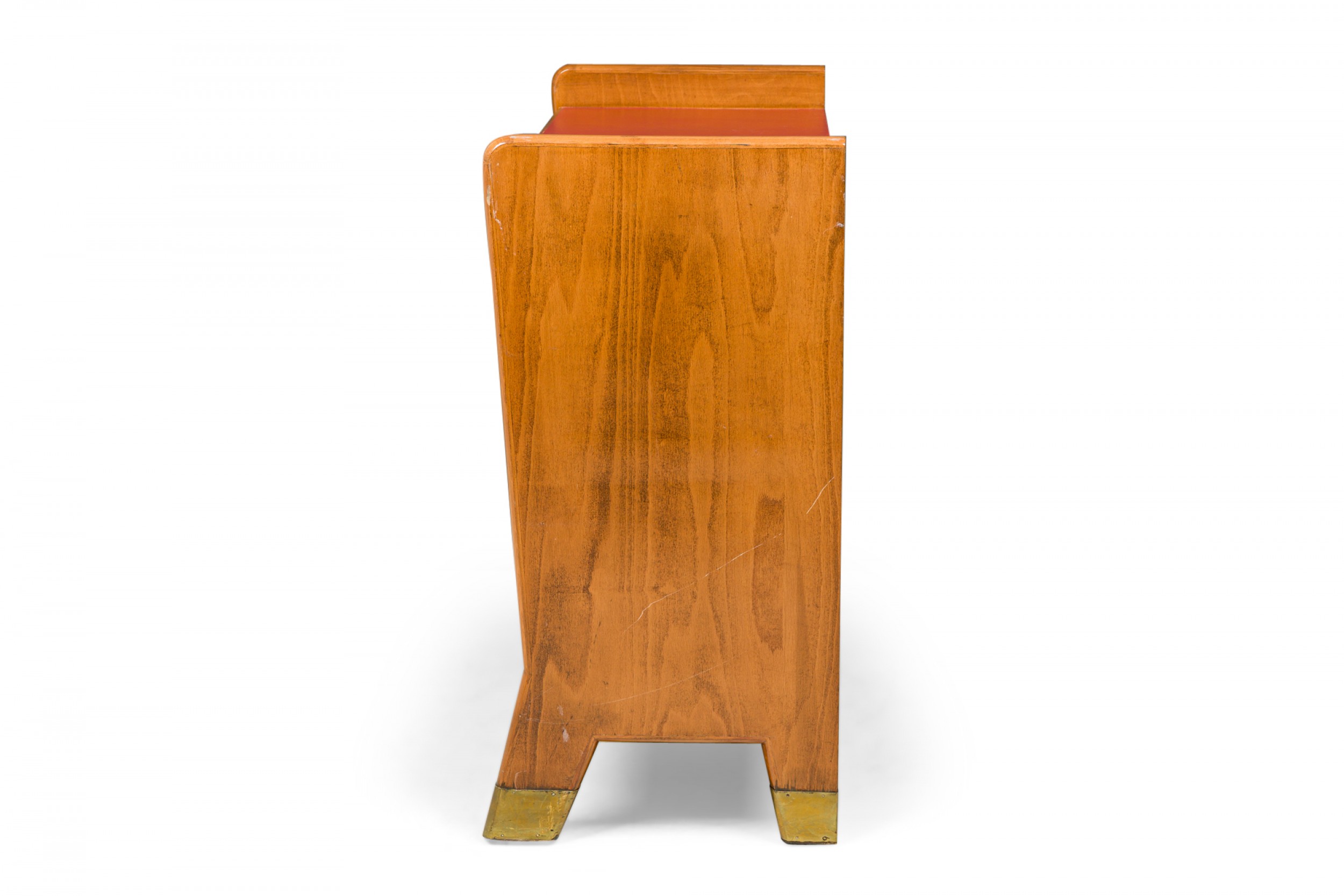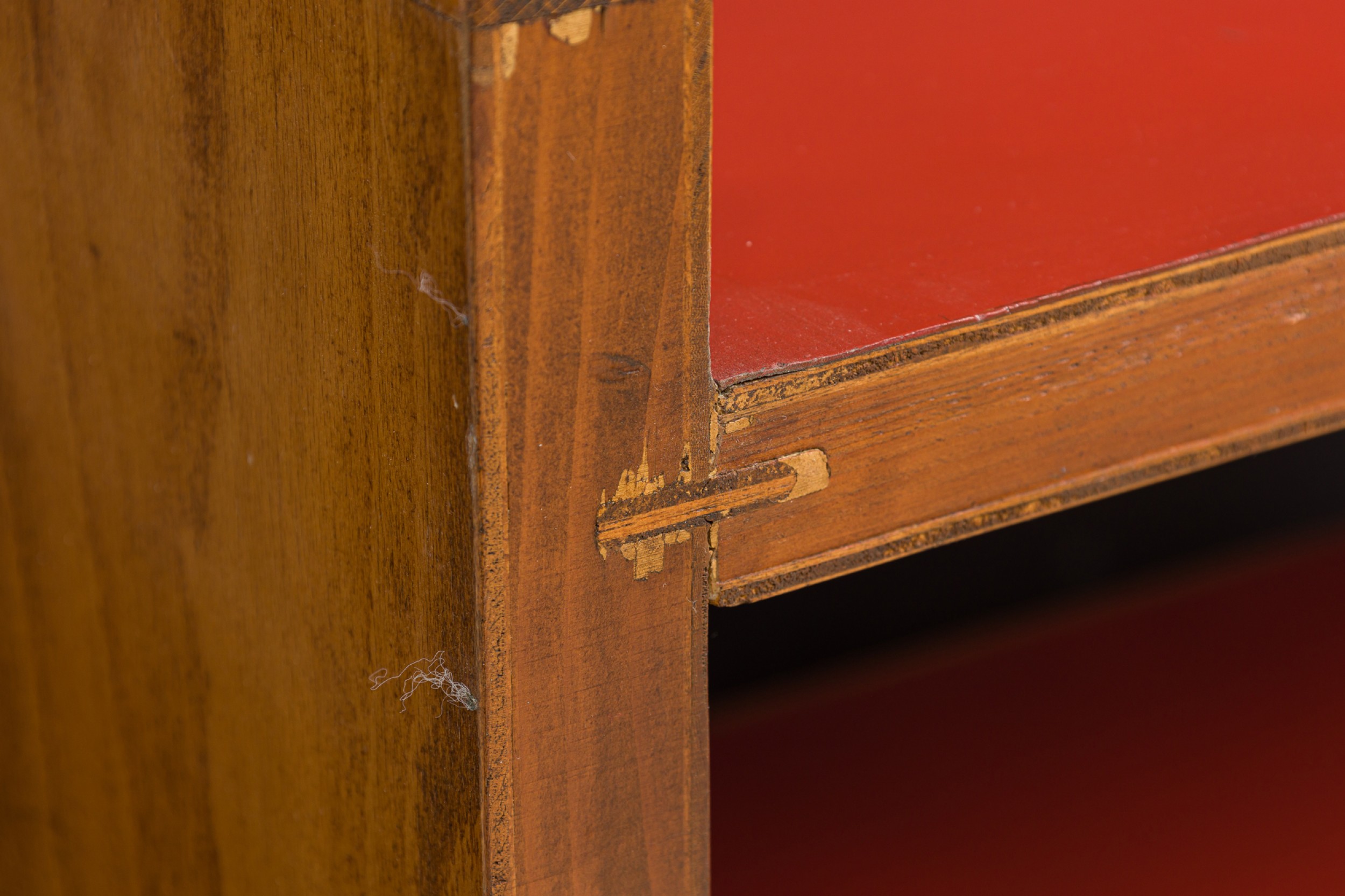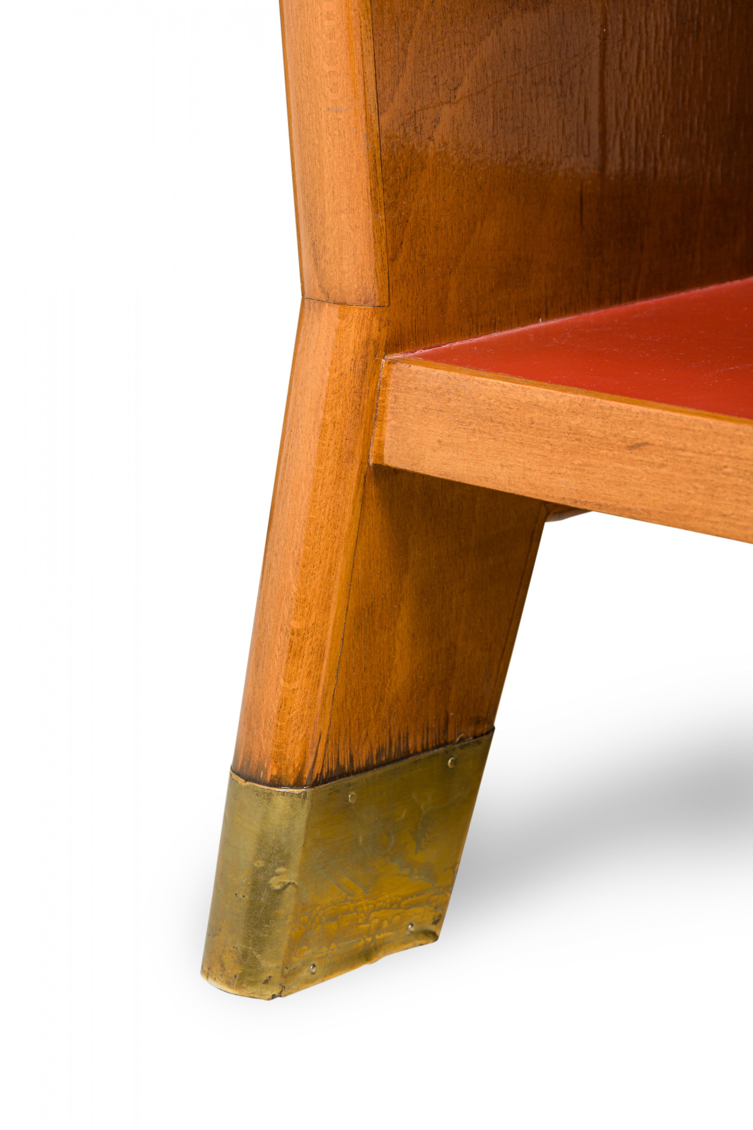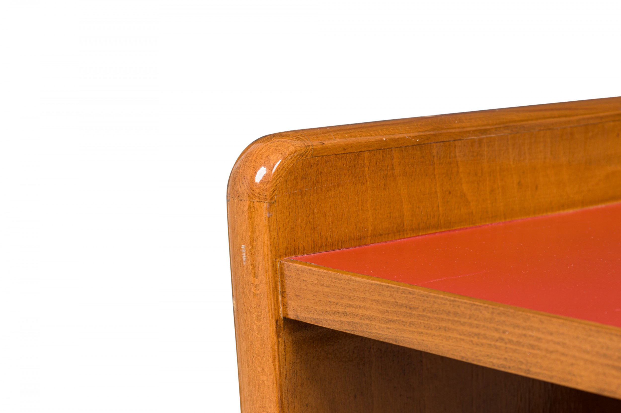 Italian Mid-Century (1950s) small 3-shelf fruitwood bookcase with red leather shelf covers. (GIO PONTI).