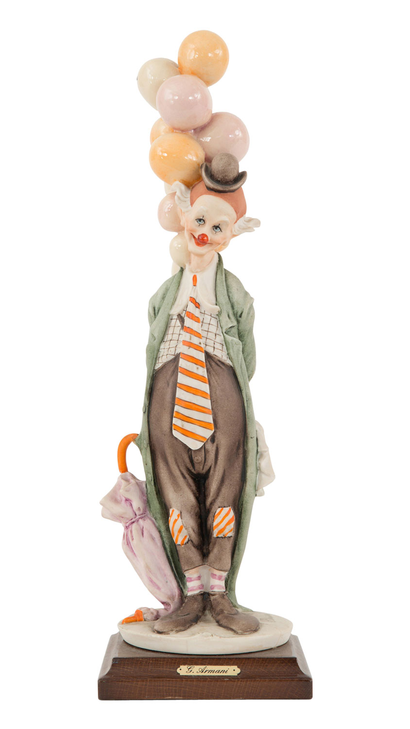 Giuseppe Armani ceramic statue of a clown with balloons and an umbrella on a square wooden base.