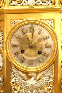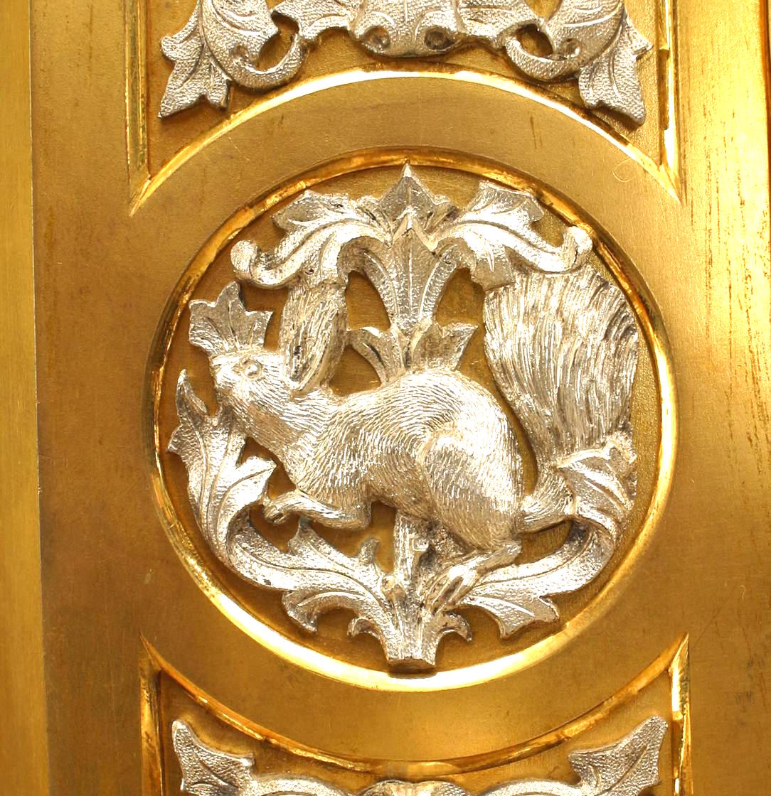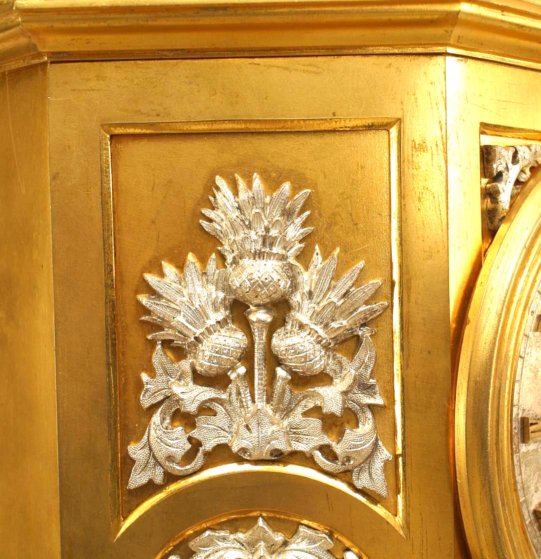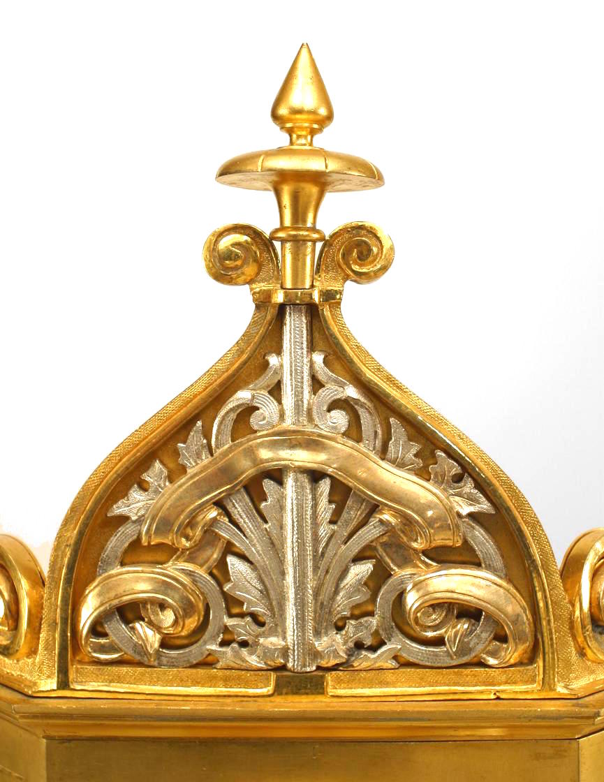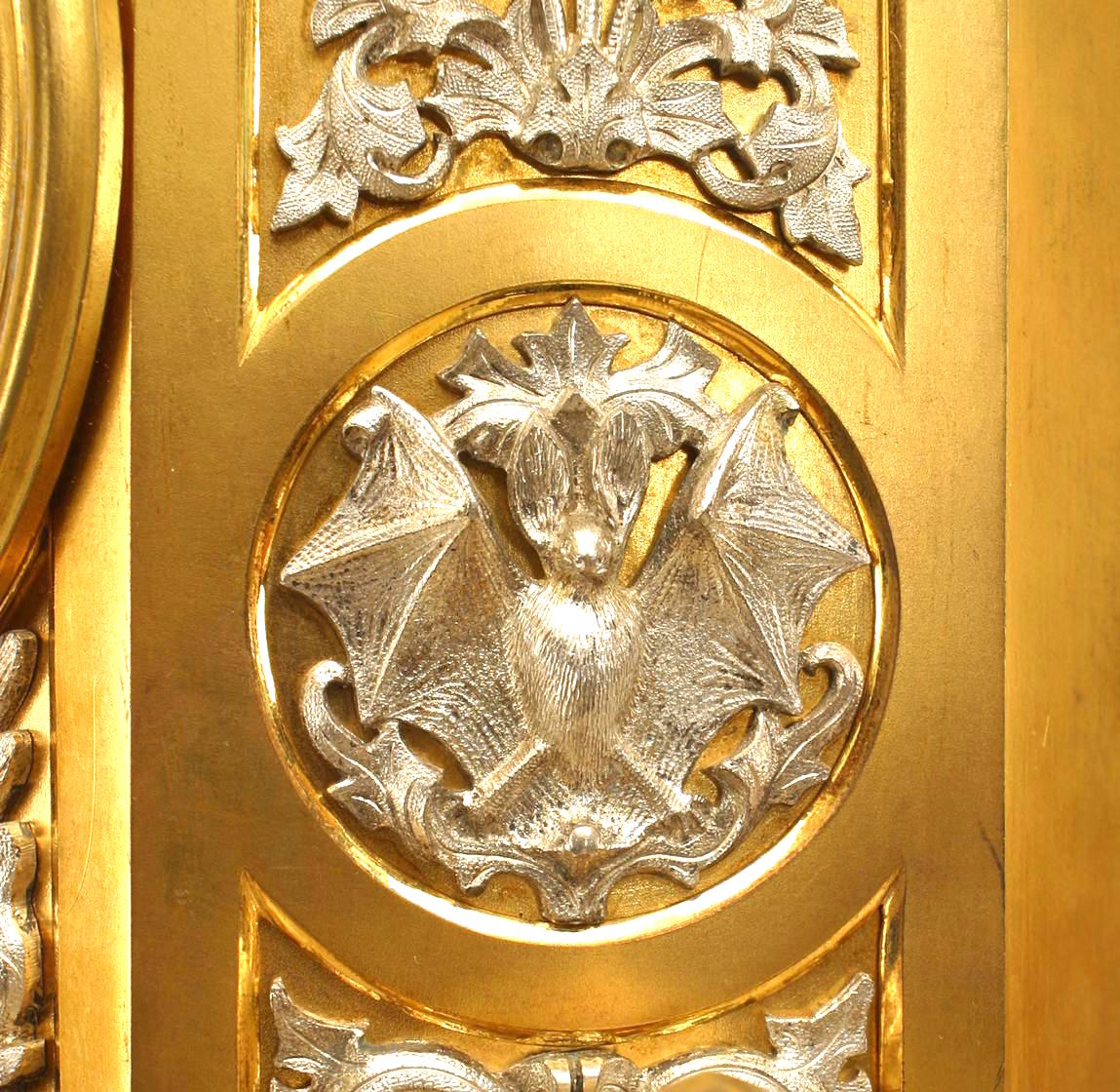 English Gothic Revival style (19th Cent) gilt mantle clock with silver plate decoration and supported by 2 gnome figures with a pediment having a finial top. *Not working