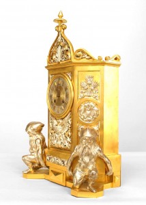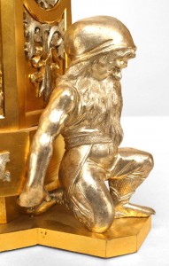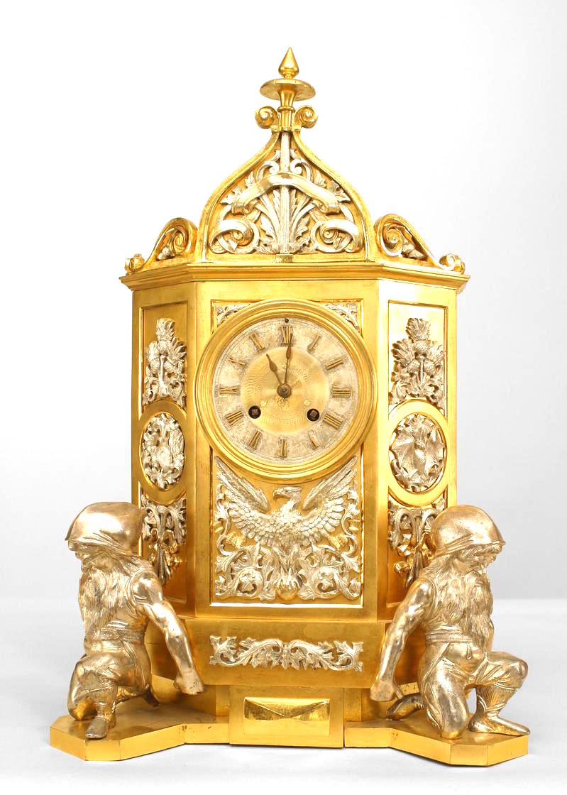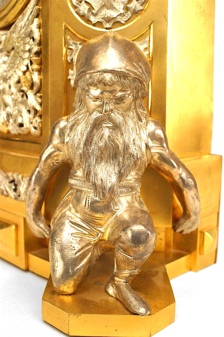 English Gothic Revival style (19th Cent) gilt mantle clock with silver plate decoration and supported by 2 gnome figures with a pediment having a finial top. *Not working.
