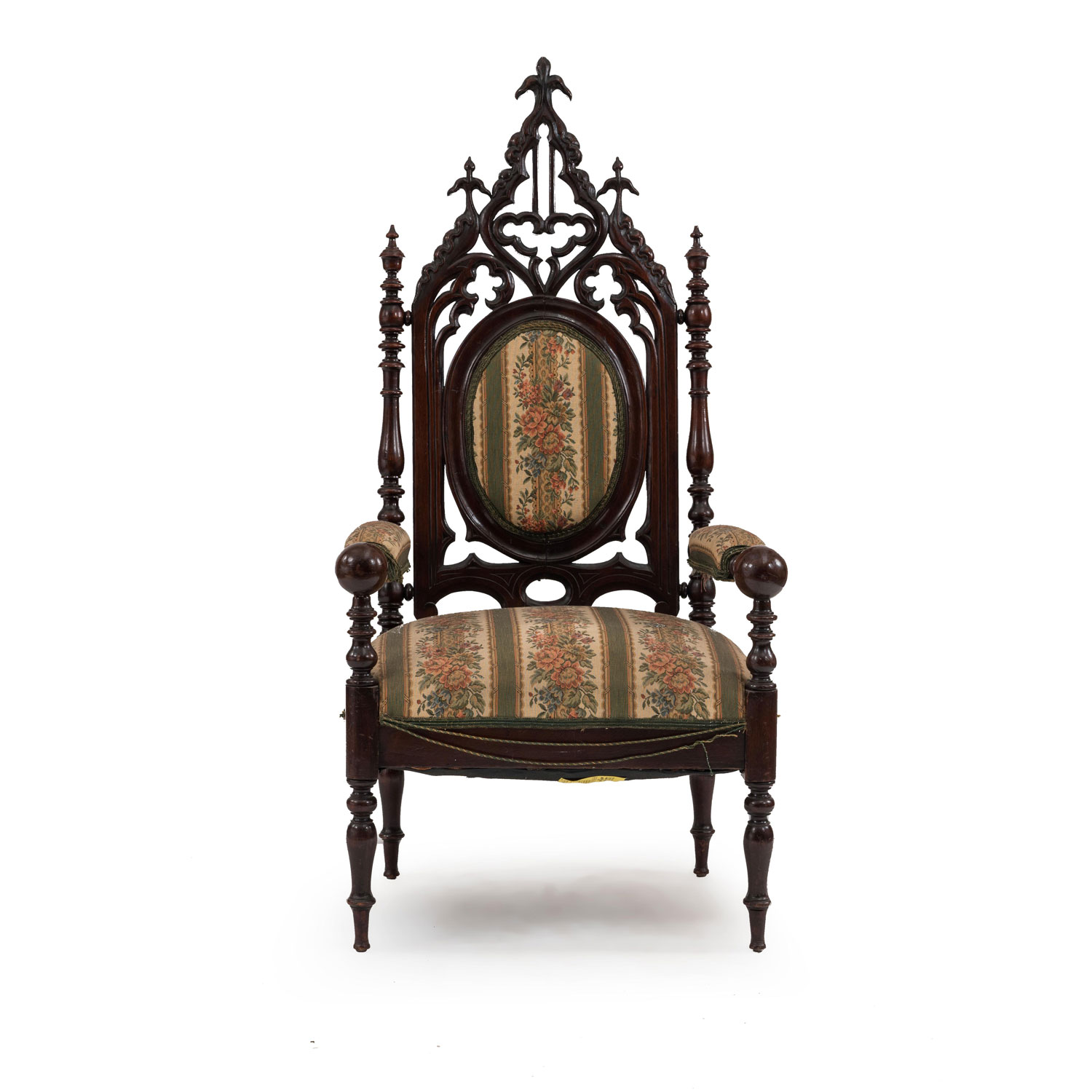 American Victorian Gothic Revival mahogany arm chair with ogee arched back & green striped seat. (late 19th Cent)