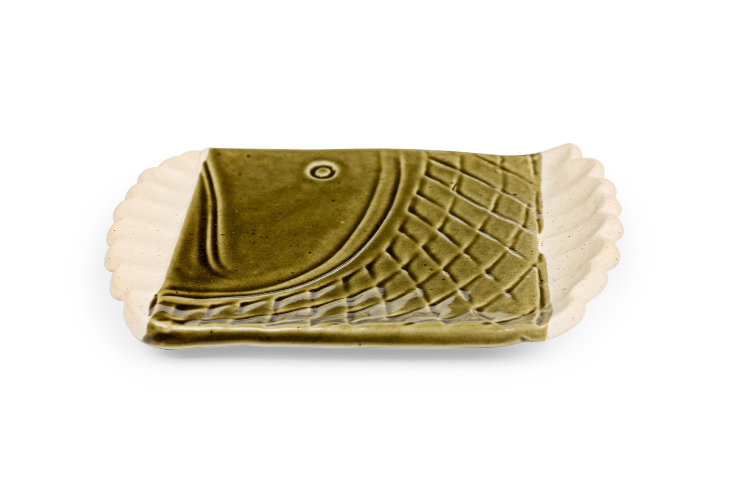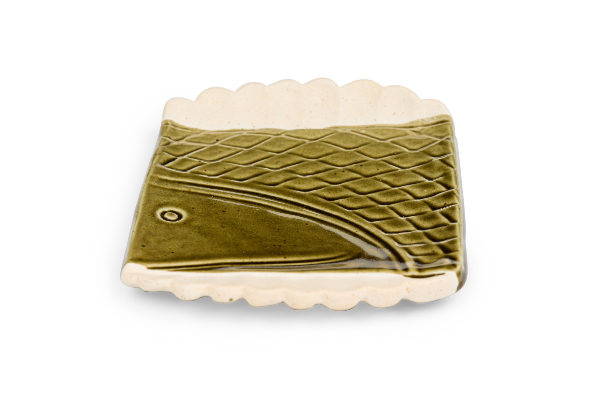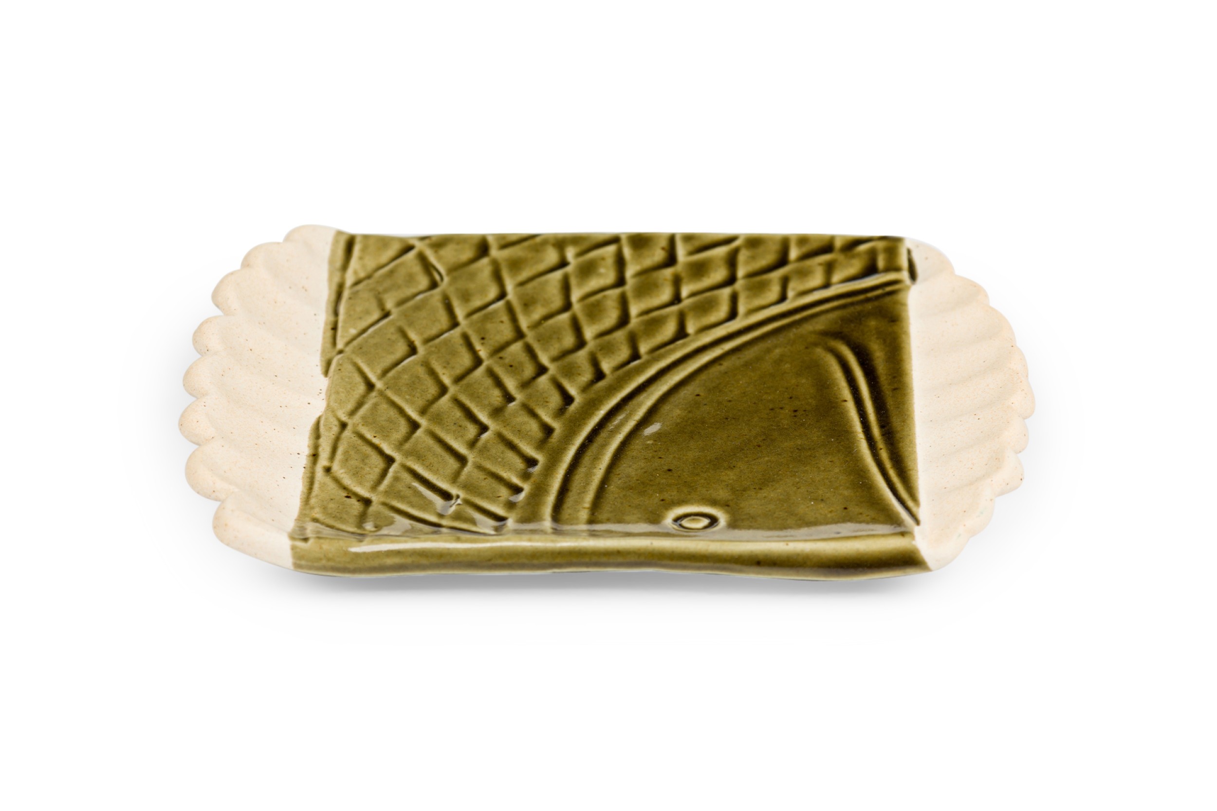 Mid-Century rectangular green glazed plate / ashtry with a fish head and geometric design having 2 off-white scalloped sides (impressed YPIA 2004 on bottom).