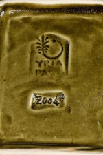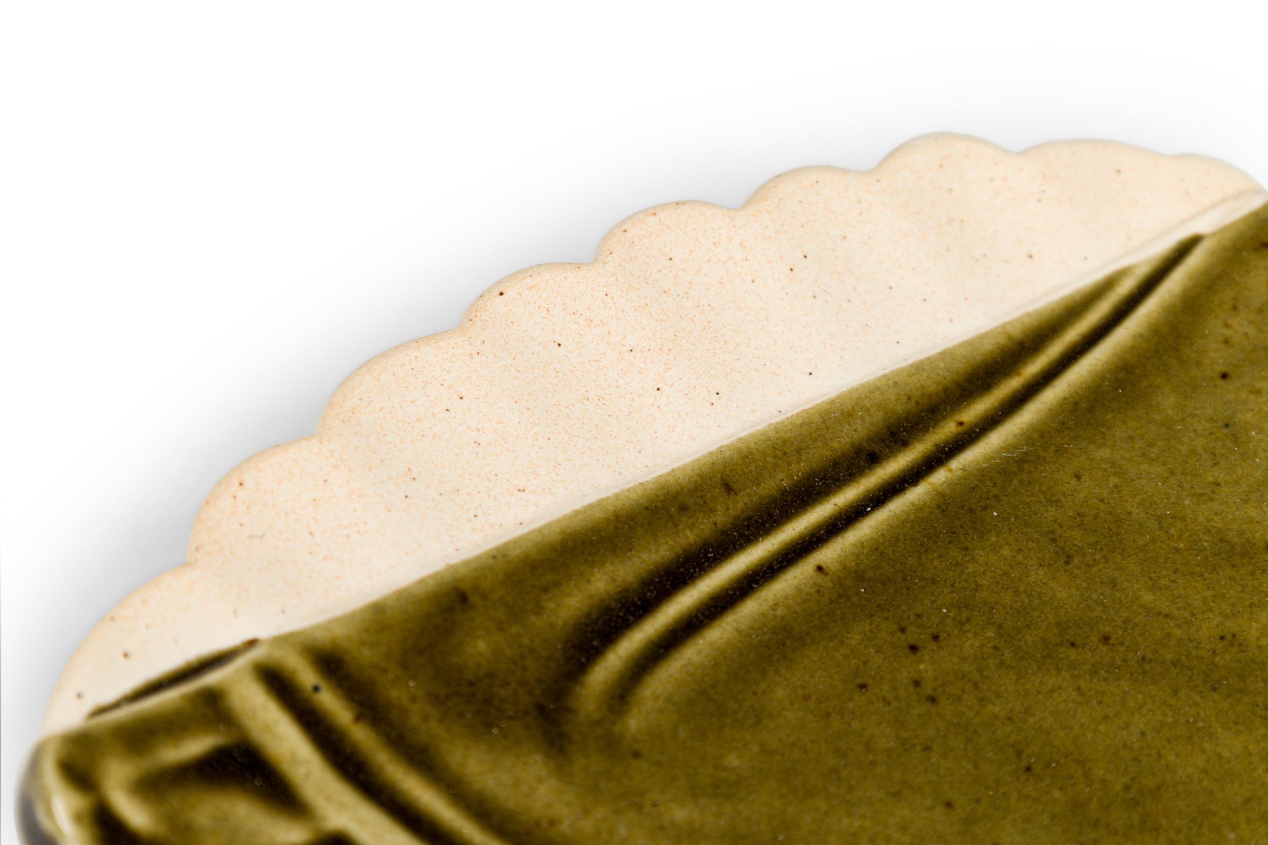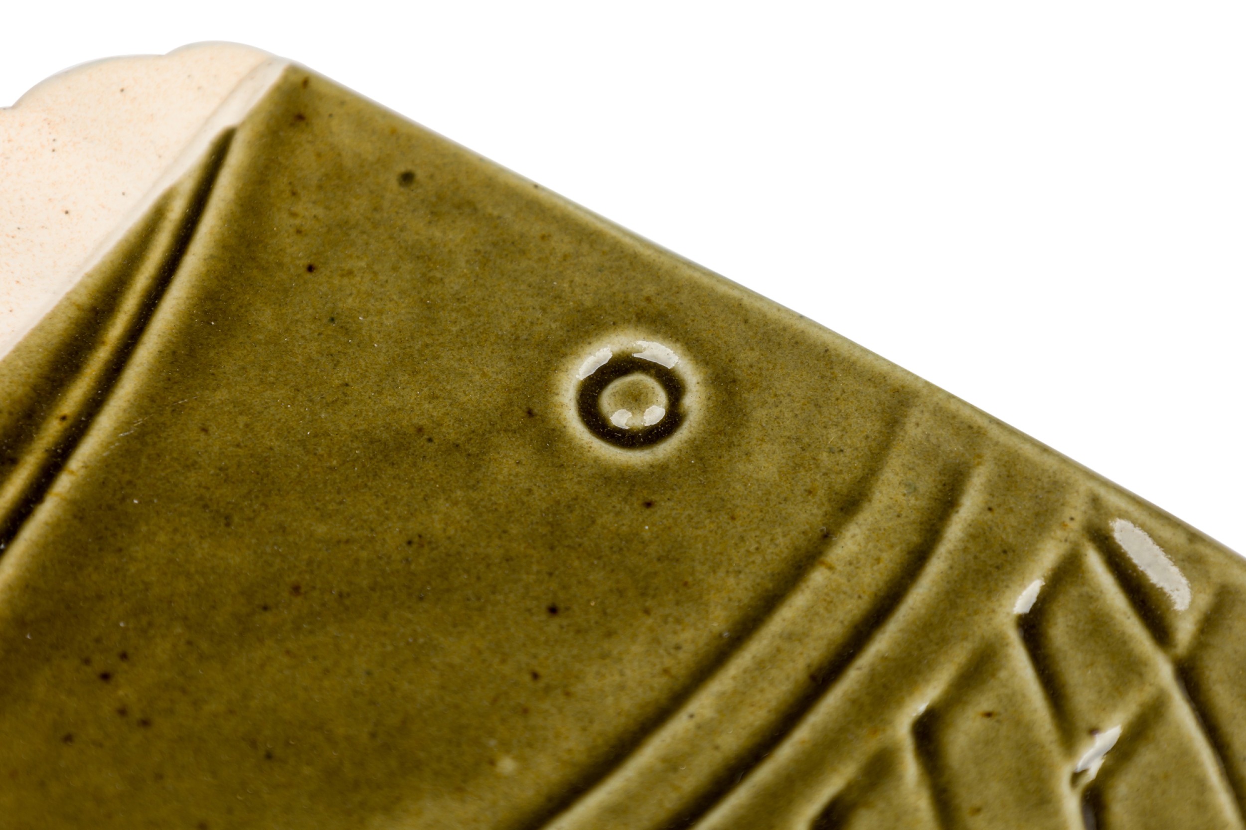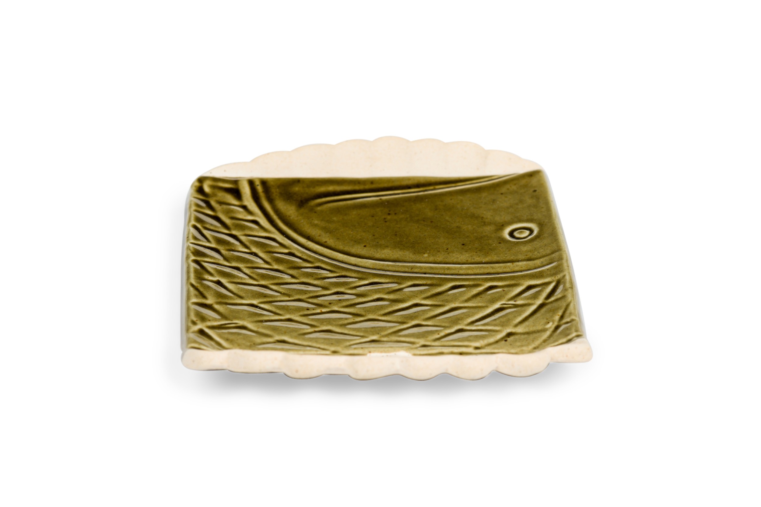 Mid-Century rectangular green glazed plate / ashtry with a fish head and geometric design having 2 off-white scalloped sides (impressed YPIA 2004 on bottom).