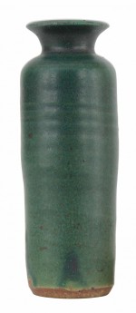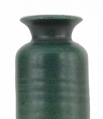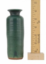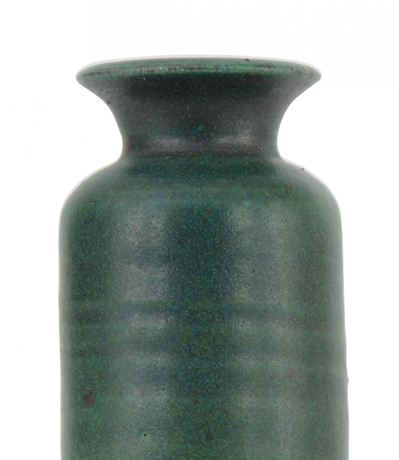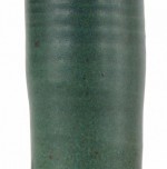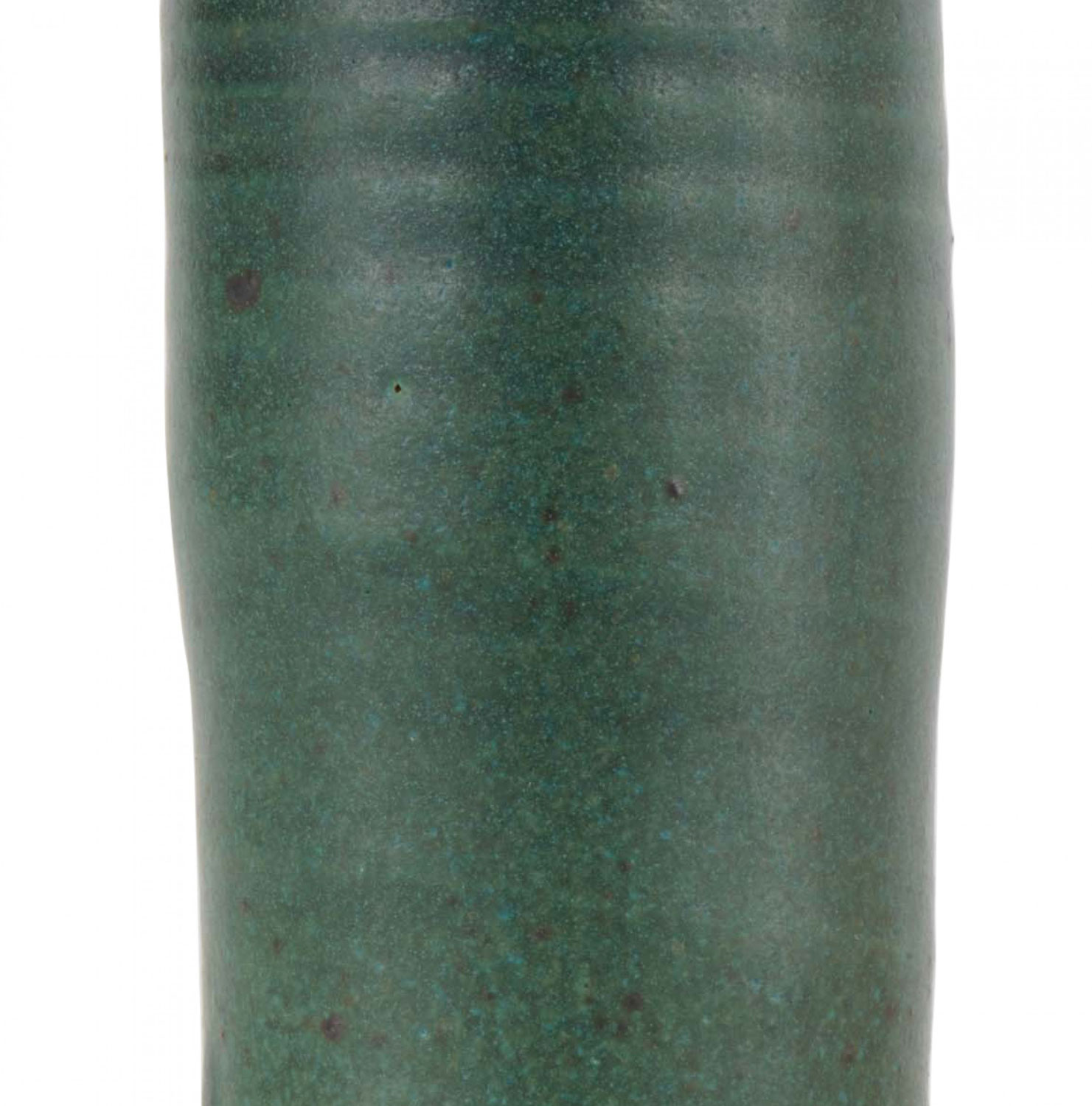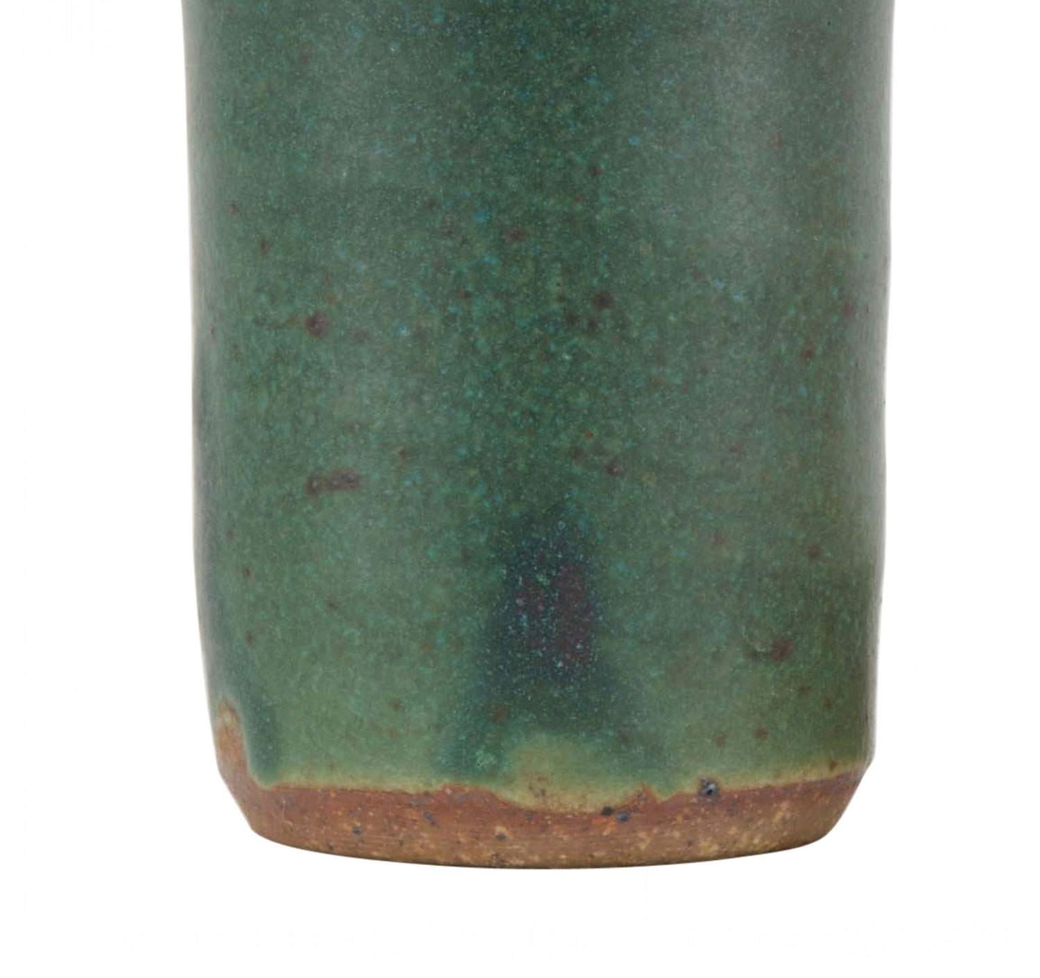 7 Long-bodied bottle-shaped ceramic bud vase with uneven glaze in green, black and blue (PRICED EACH)