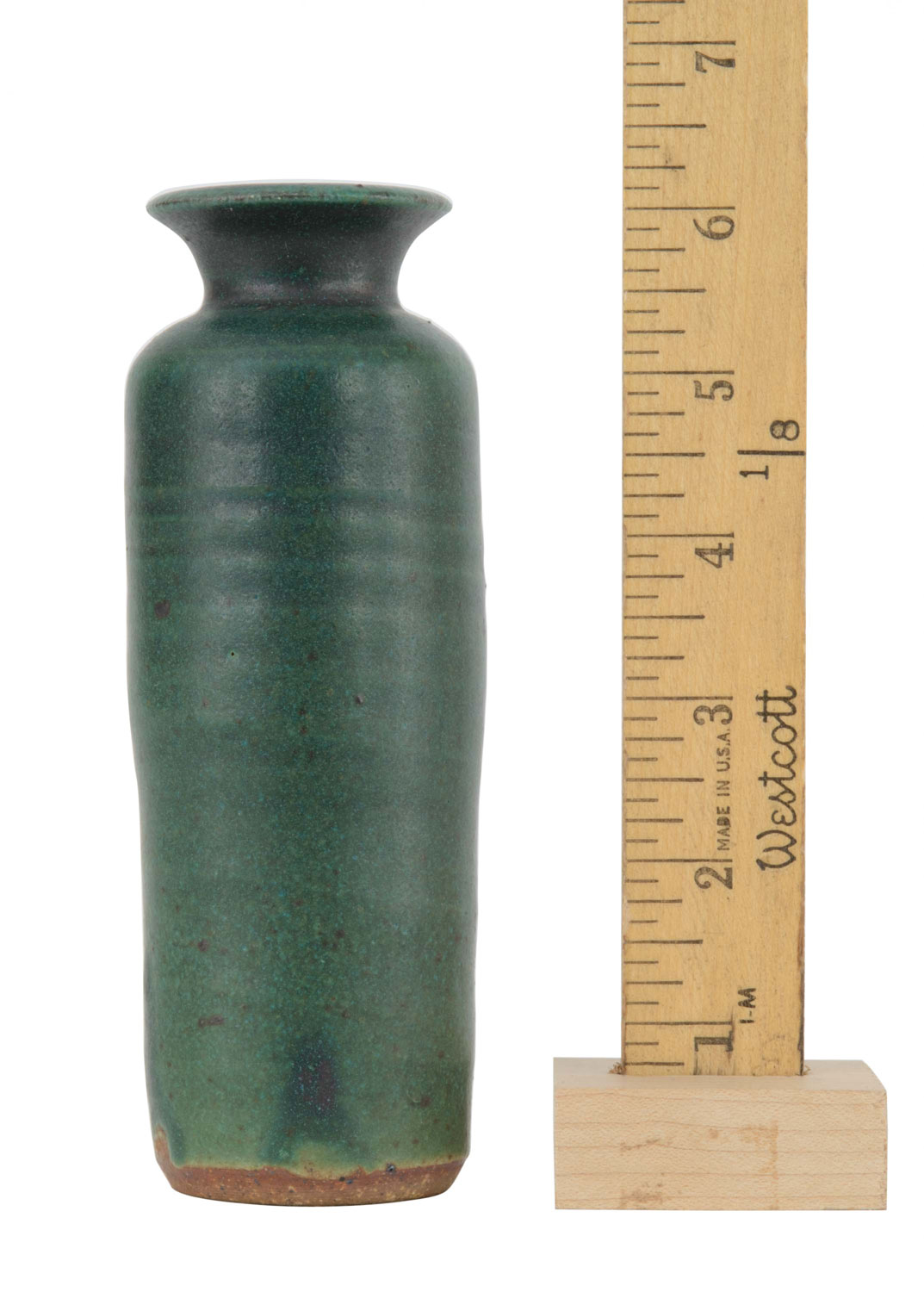 7 Long-bodied bottle-shaped ceramic bud vase with uneven glaze in green, black and blue (PRICED EACH).