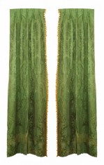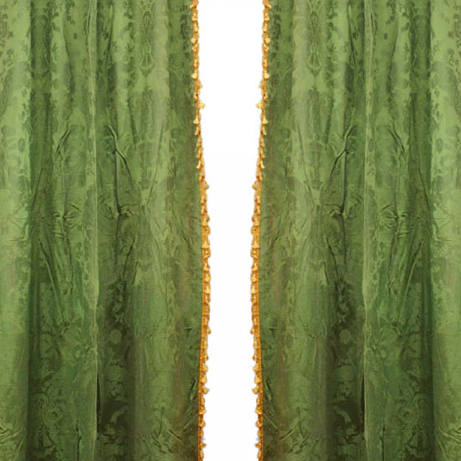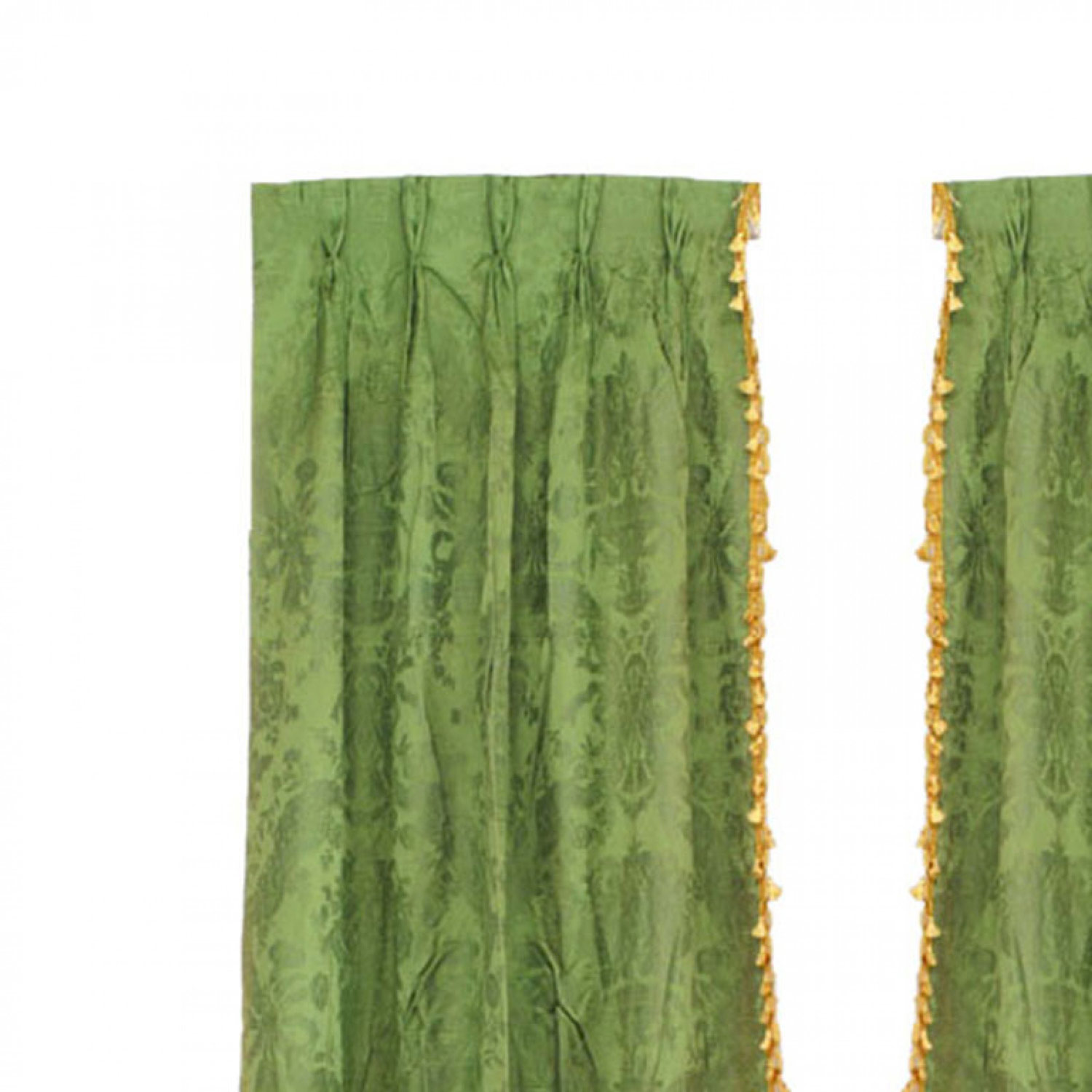 Pair of green damask drapes with gold tassel fringe (PRICED PER PAIR).