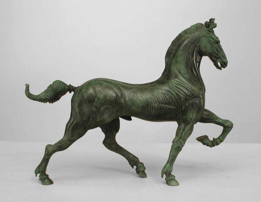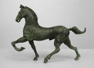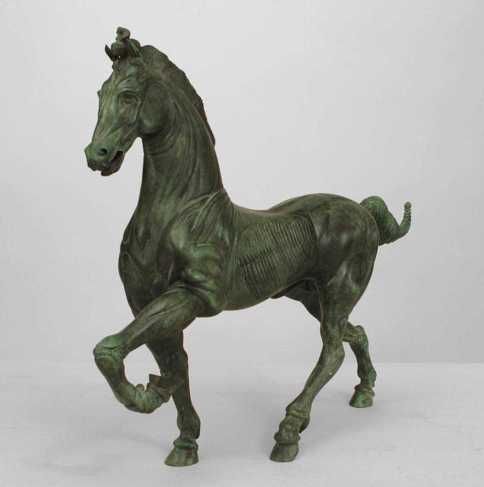 PAIR of Italian Renaissance style green patinated bronze figure of horse walking (from a series of 1,000 titled: "Cavalli di San Marco II", signed by LUDOVICO De LUIGI, 1979).