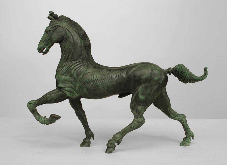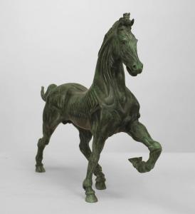 PAIR of Italian Renaissance style green patinated bronze figure of horse walking (from a series of 1,000 titled: "Cavalli di San Marco II", signed by LUDOVICO De LUIGI, 1979)