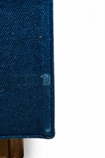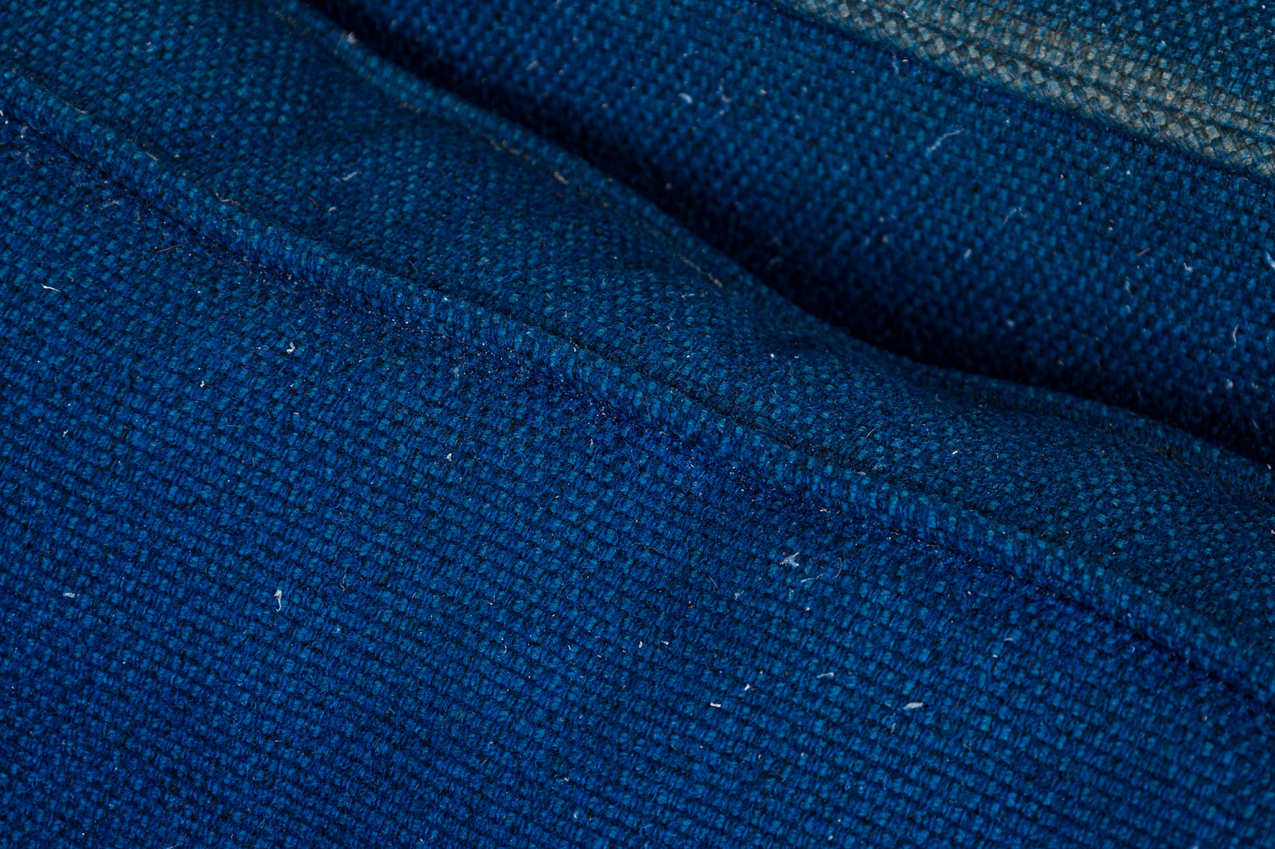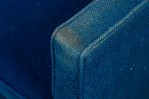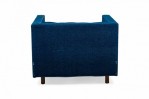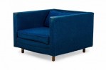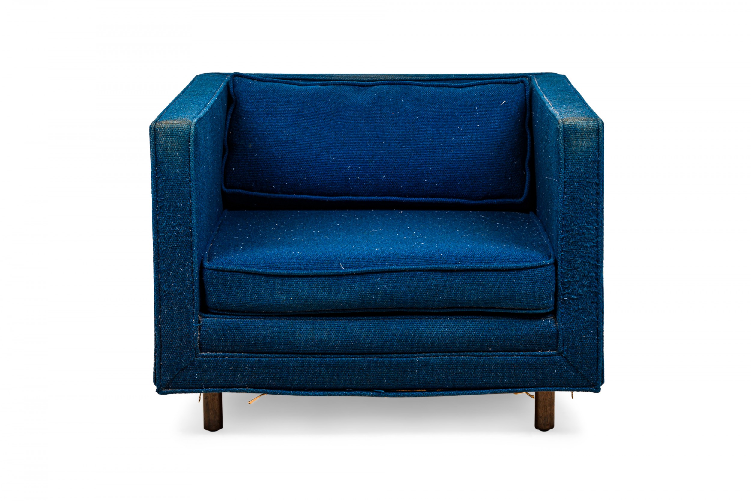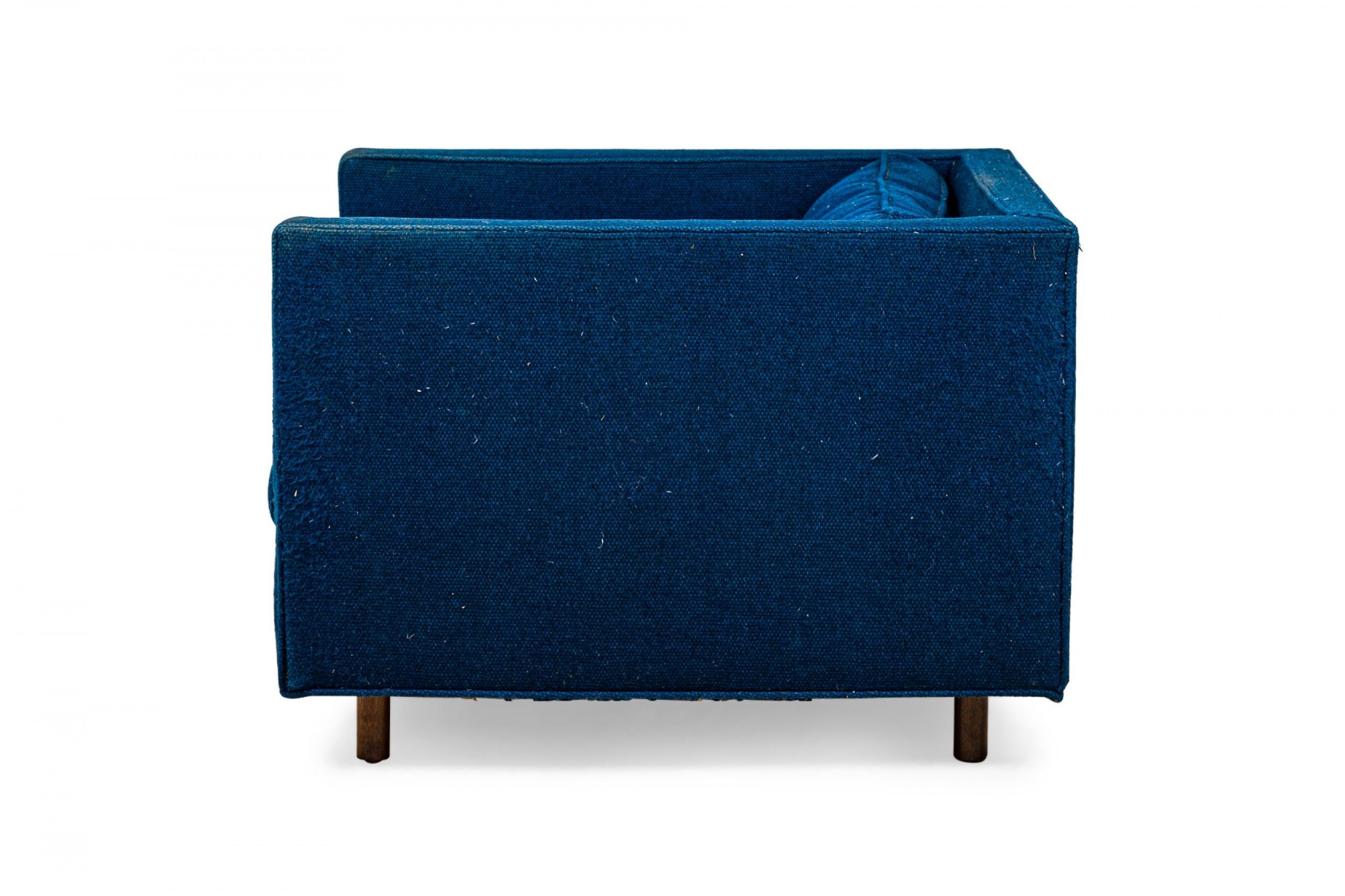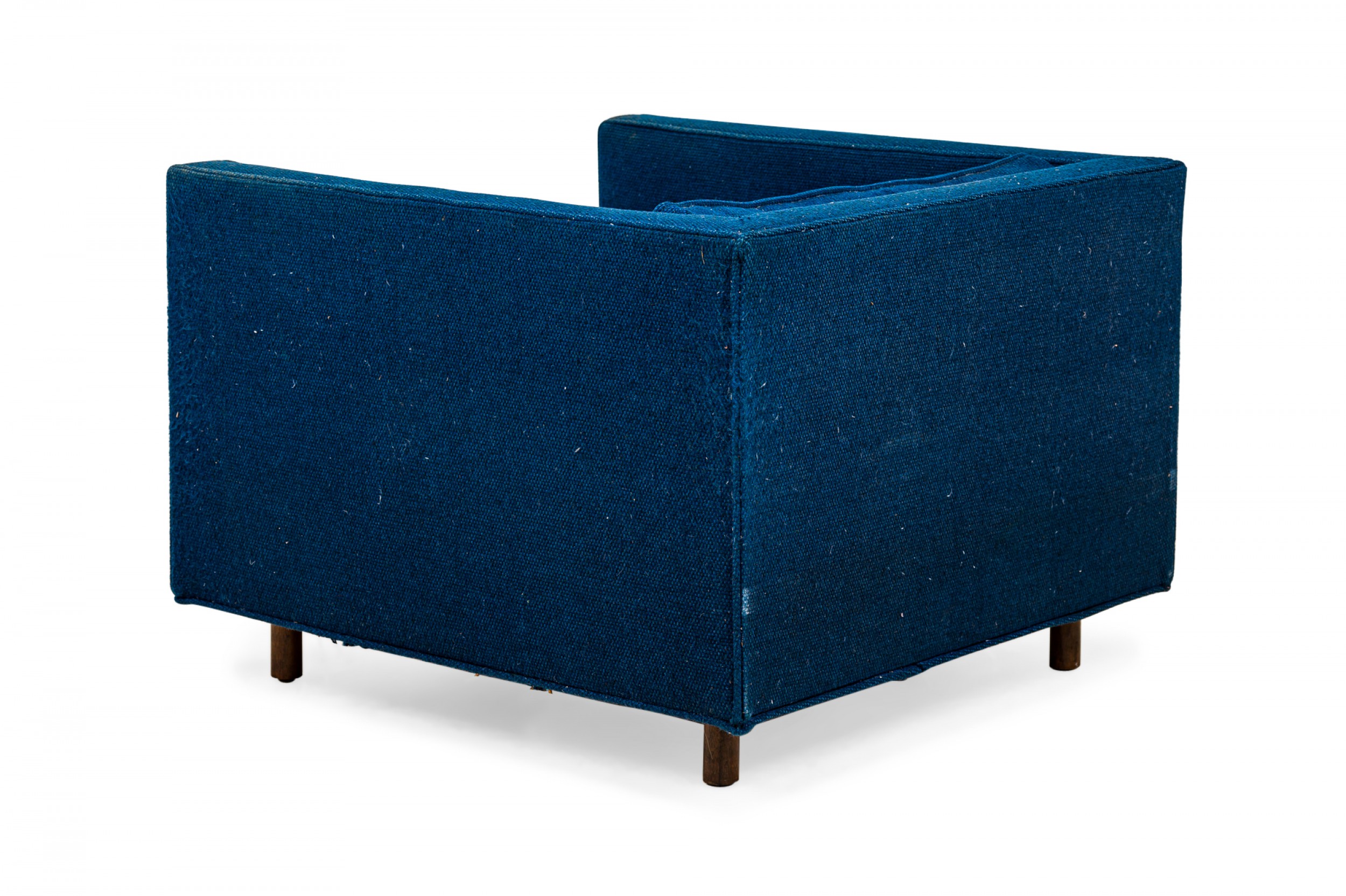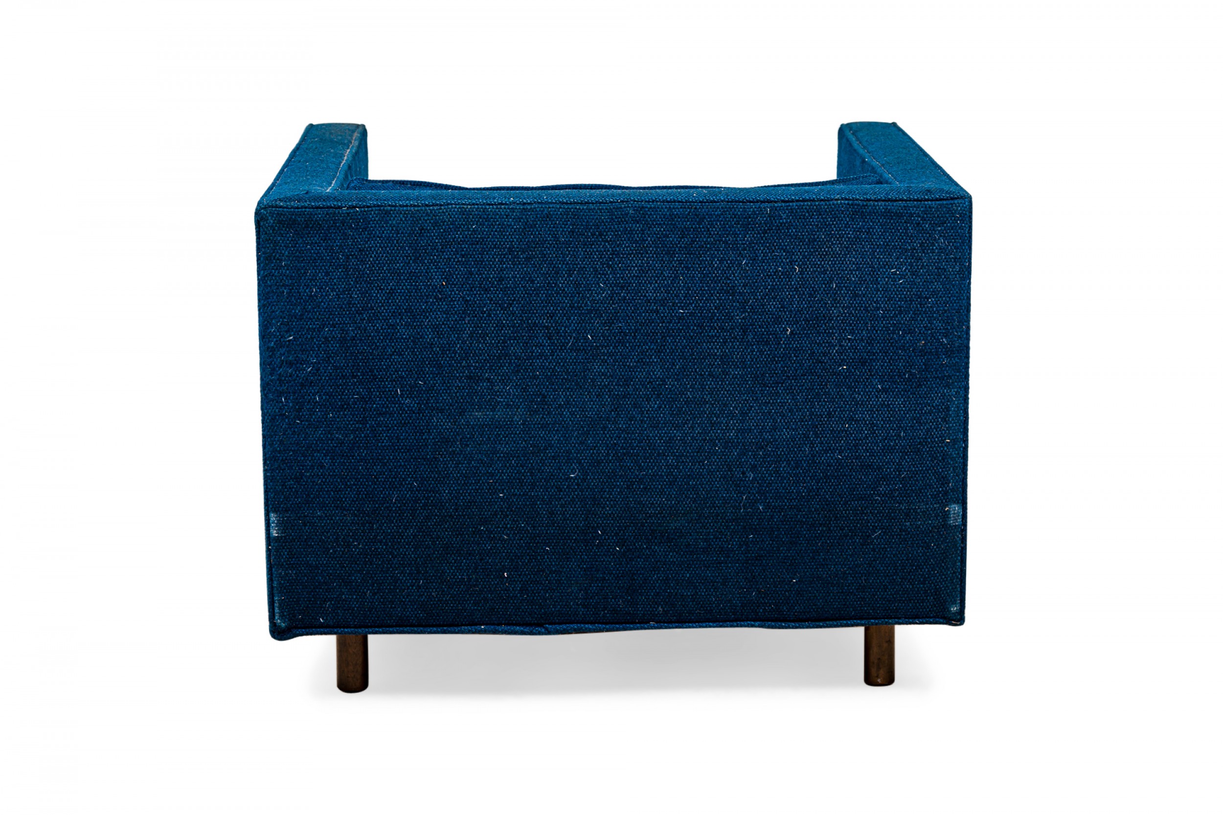 American Mid-Century cube form lounge / armchair with textured royal blue fabric upholstery and a matching removable back cushion. (HARVEY PROBBER)(Available in black: DUF0509B)