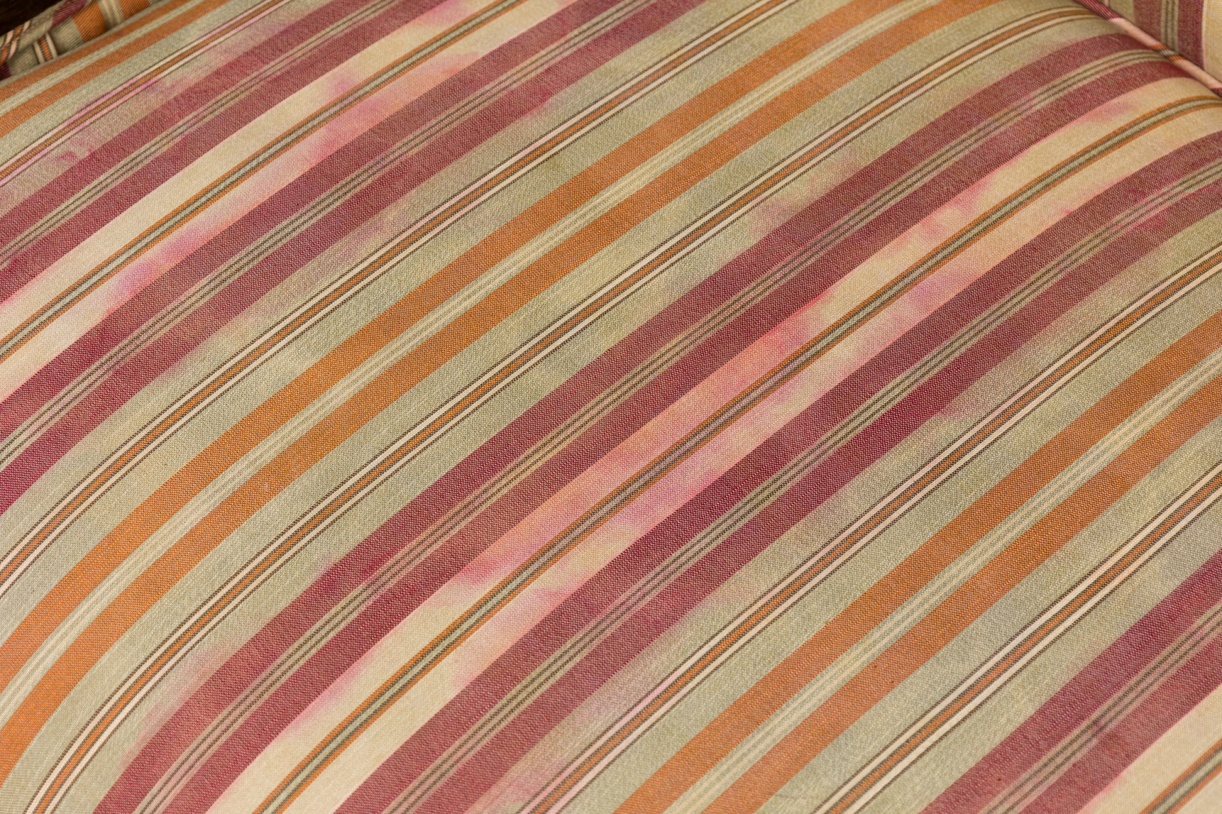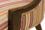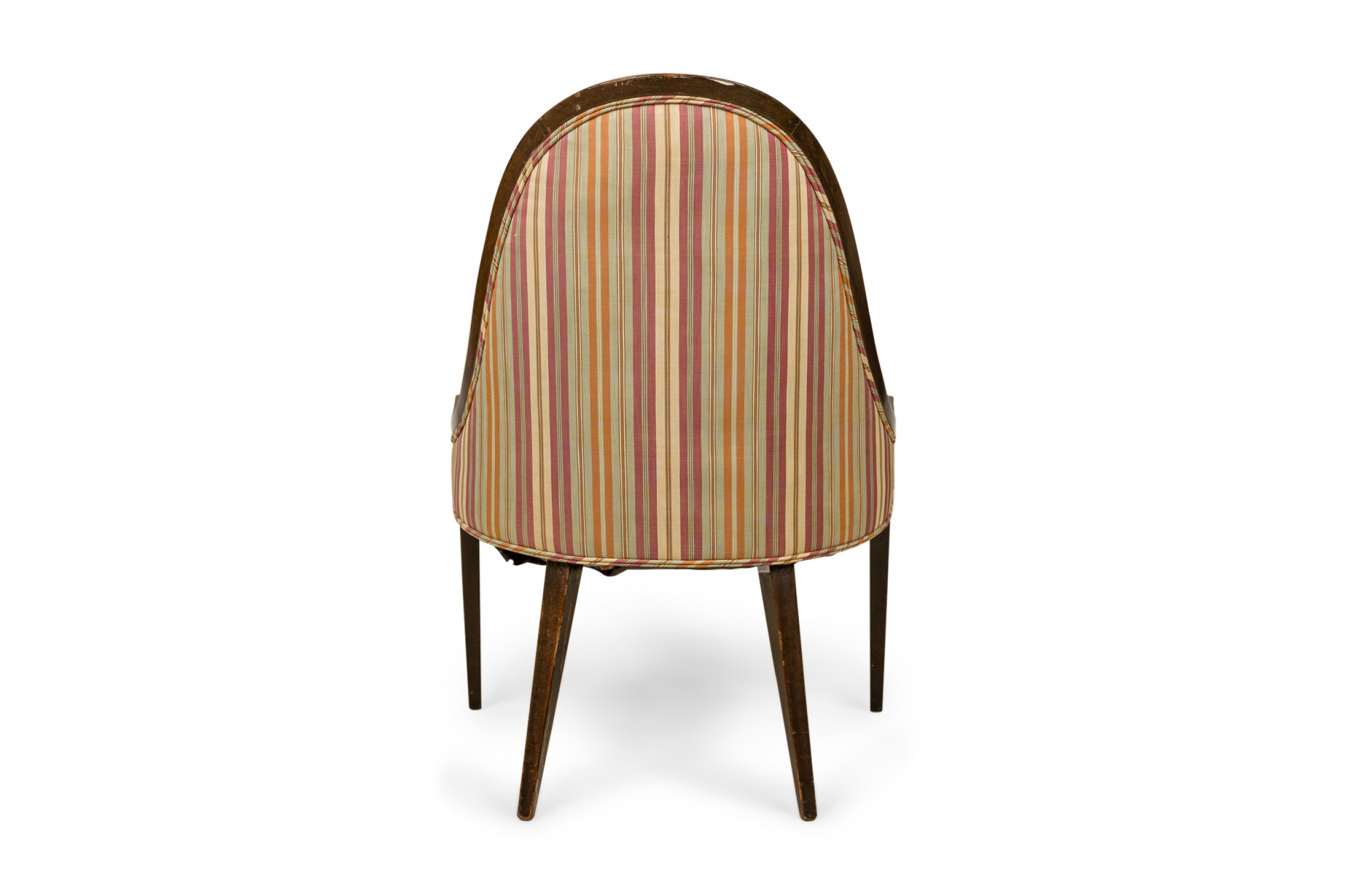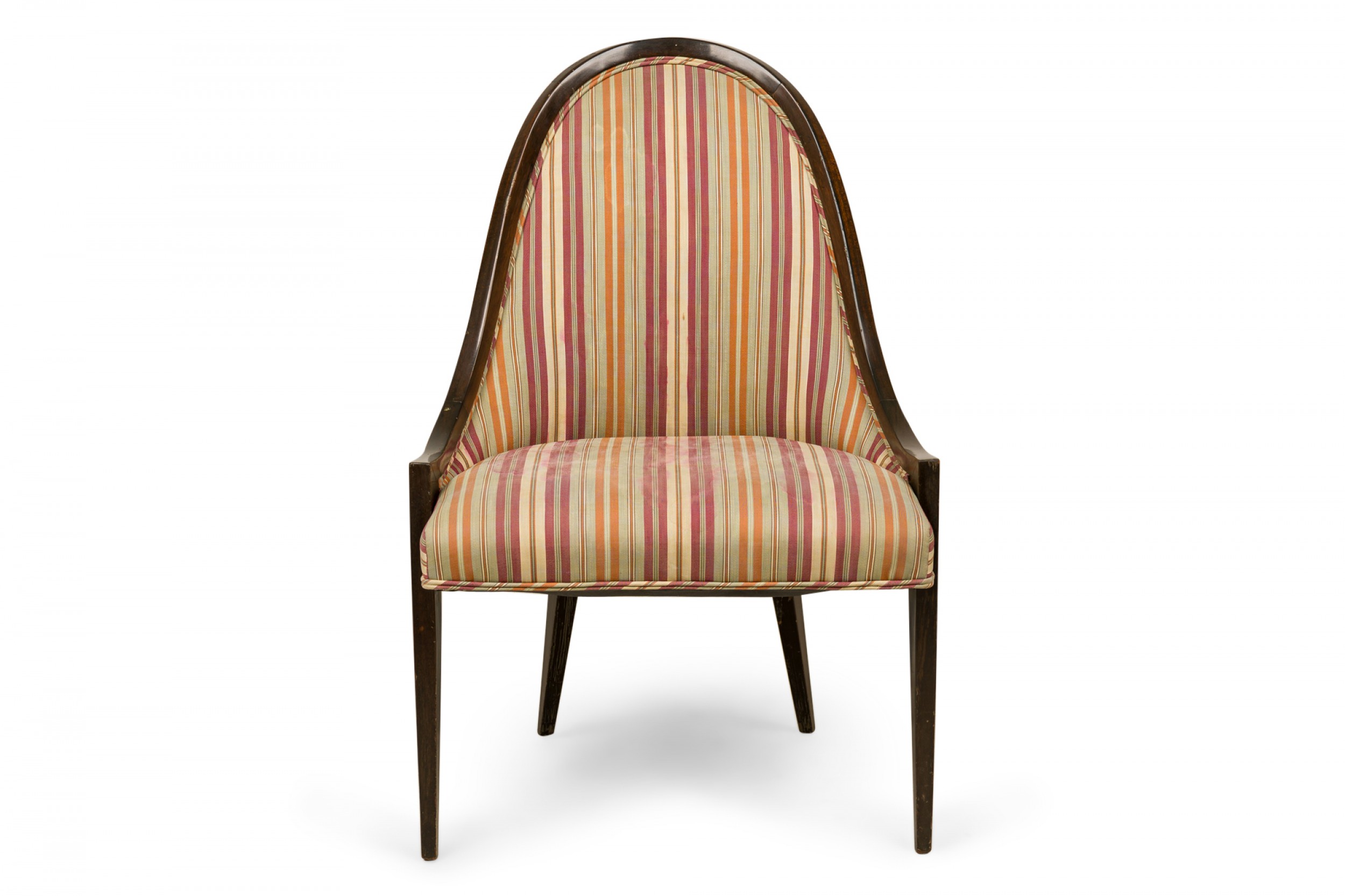 American Mid-Century 'Gondola' form chair with a curved dark stained wooden frame and muted pink, green, and beige vertically striped upholstered seat and back, resting on four tapered wooden legs. (HARVEY PROBBER)