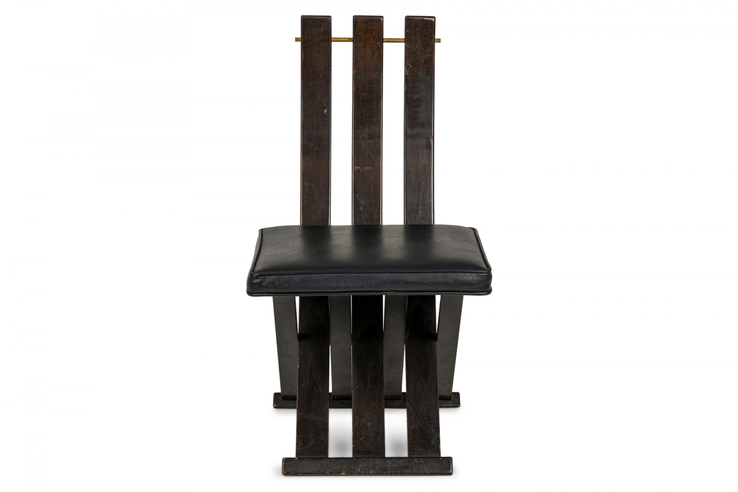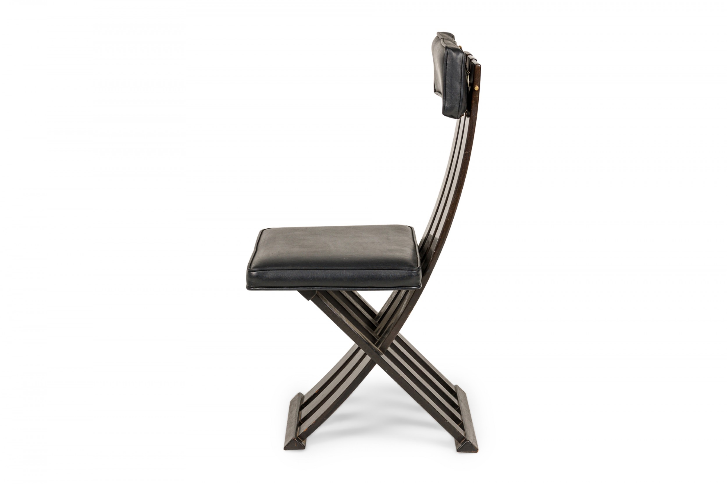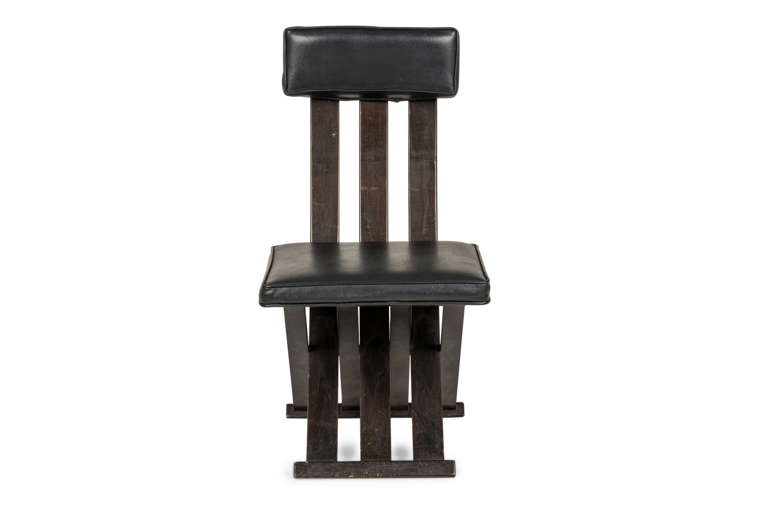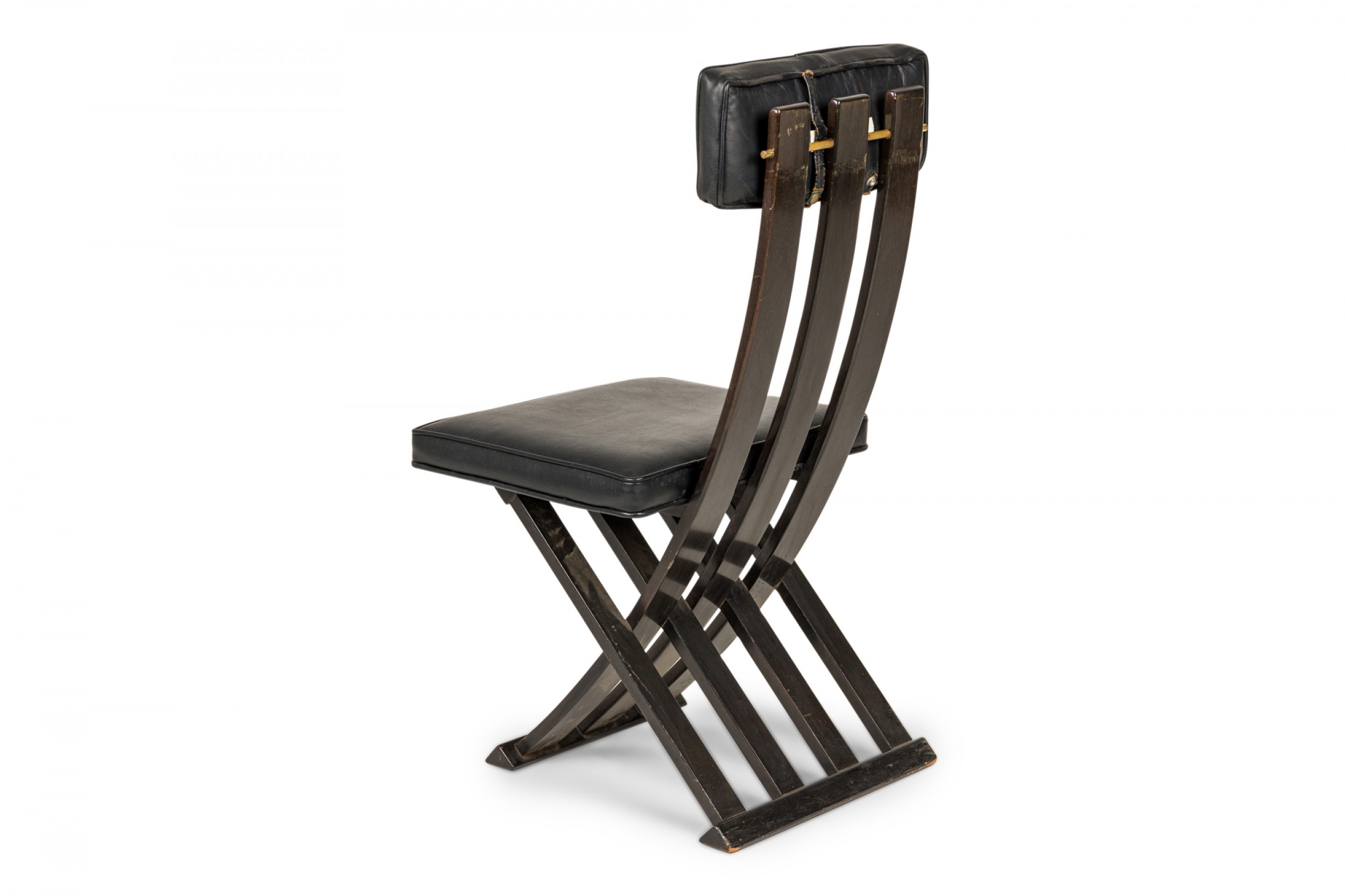 American Mid-Century scissor form dining / side chair with an ebonized wooden frame with a narrow back comprised of three vertical slats, with a black leather upholstered seat and small rectangular back cushion, resting on a three slat scissor-form base. (HARVEY PROBBER)