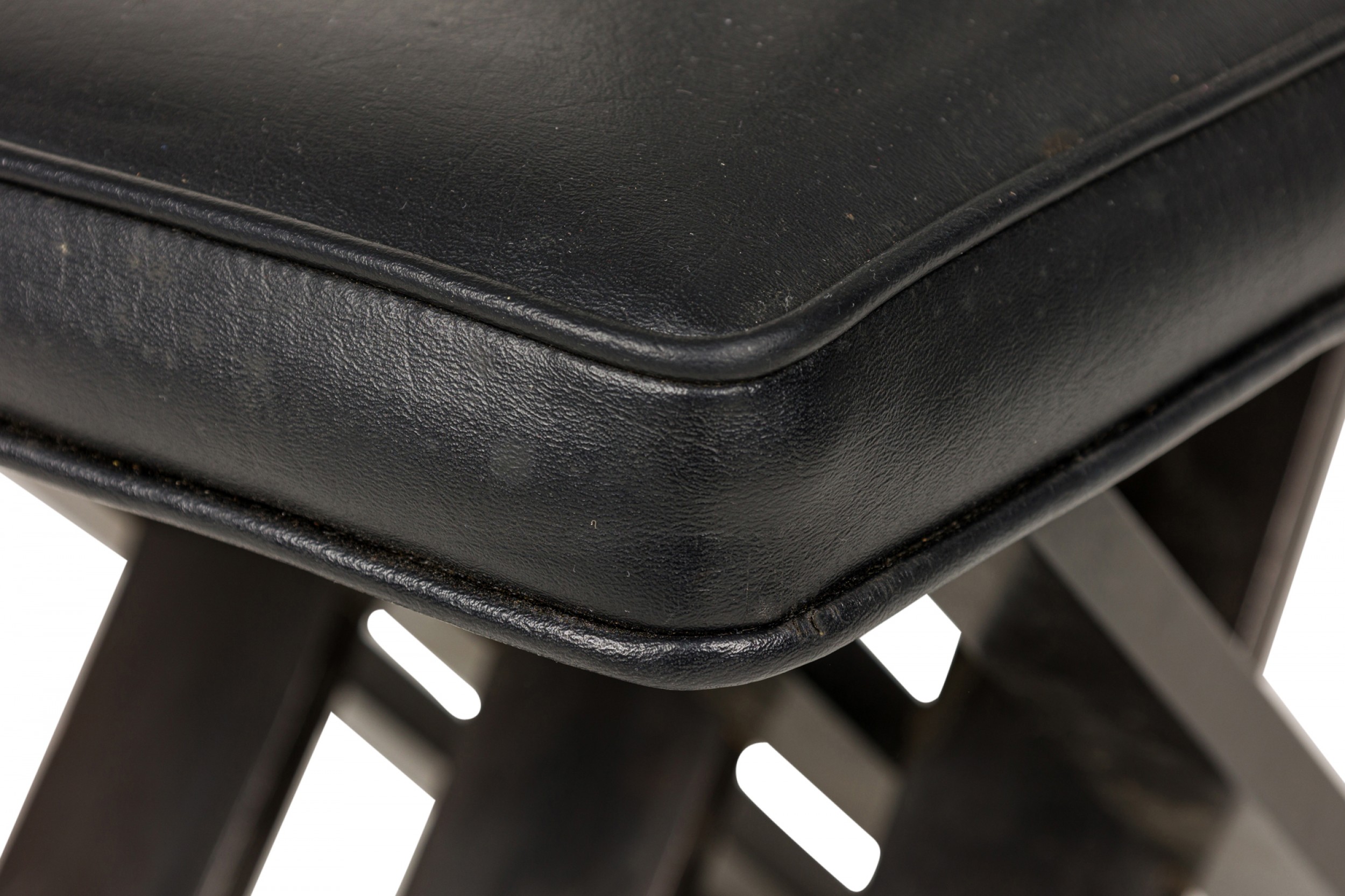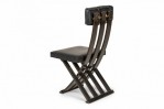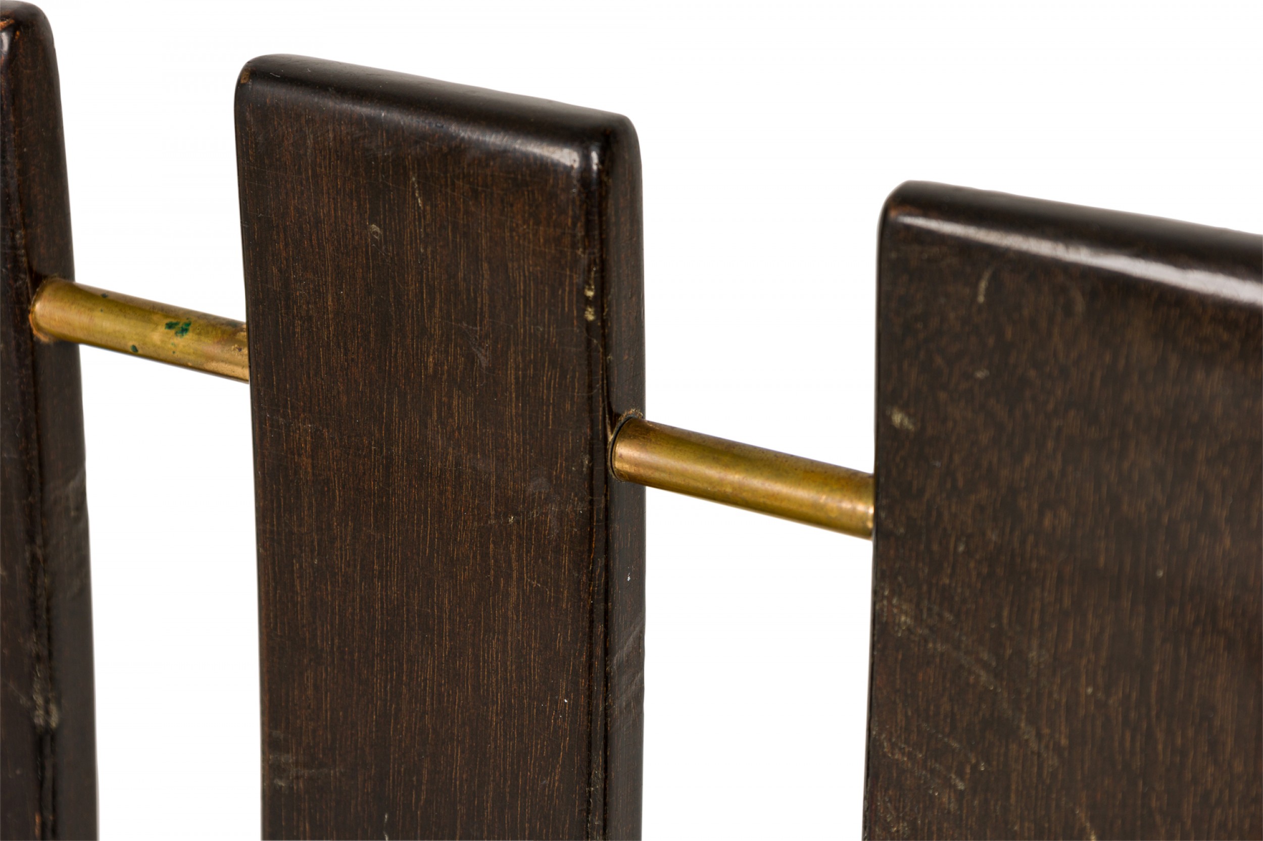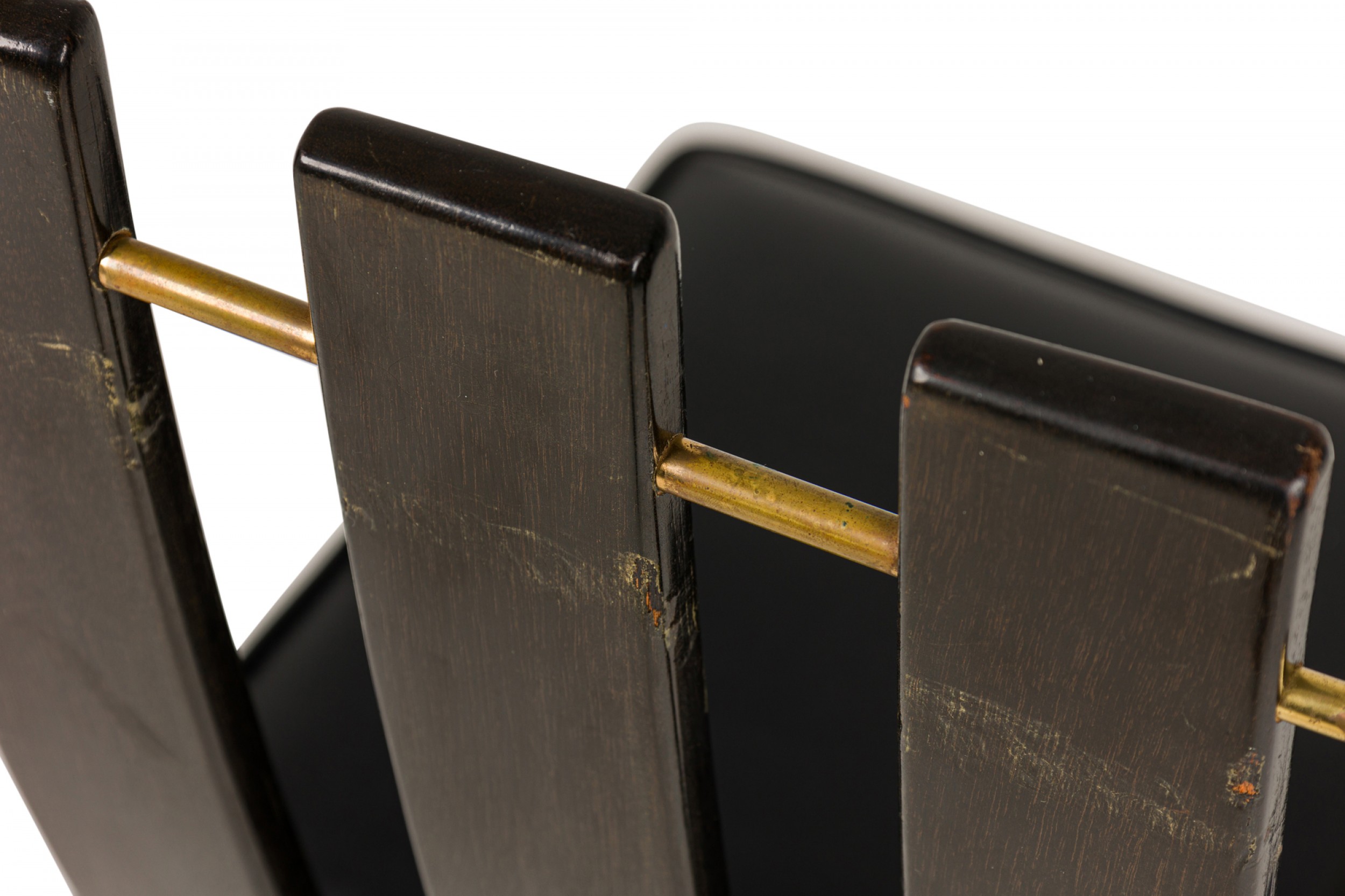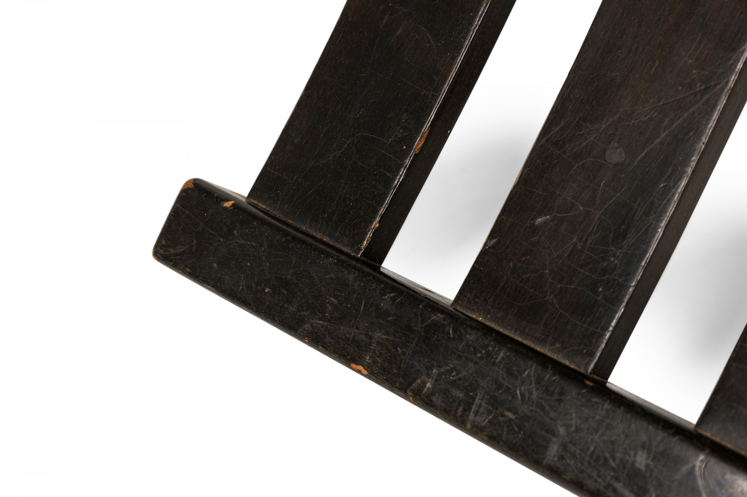 American Mid-Century scissor form dining / side chair with an ebonized wooden frame with a narrow back comprised of three vertical slats, with a black leather upholstered seat and small rectangular back cushion, resting on a three slat scissor-form base. (HARVEY PROBBER)
