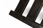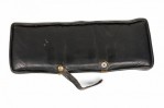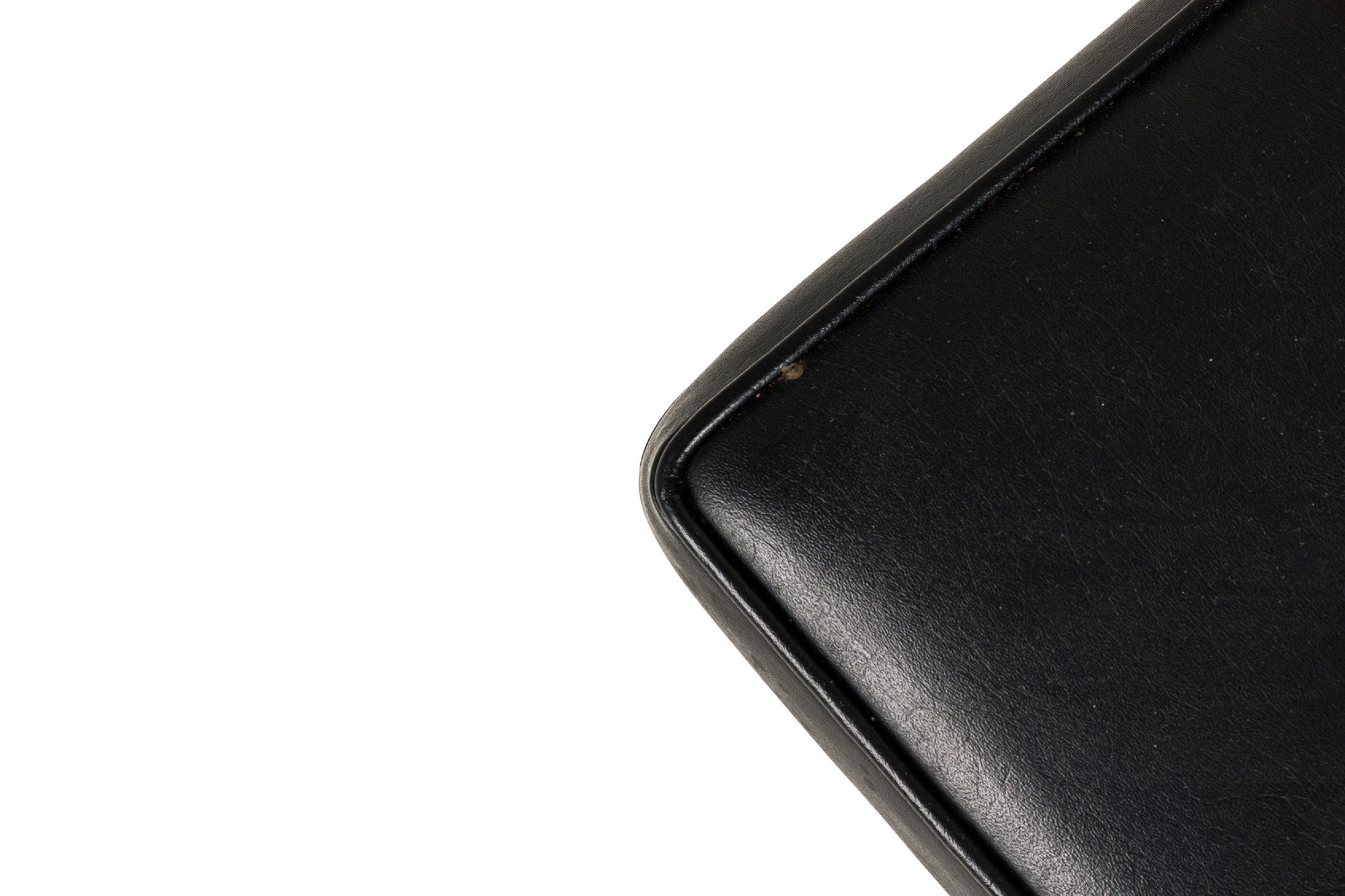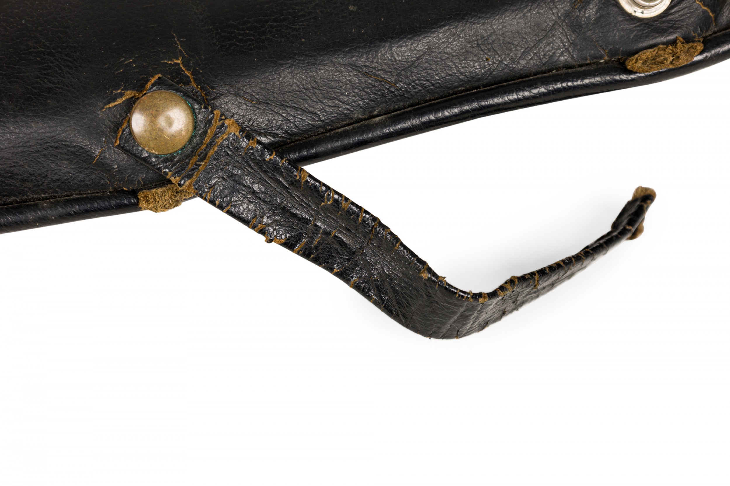 Style: Mid-Century Materials & Techniques: Ebonized, leather, upholstered, wood Category: Seating Condition: Leather strap on back pillow is damaged/broken. Good; Wear consistent with age and use