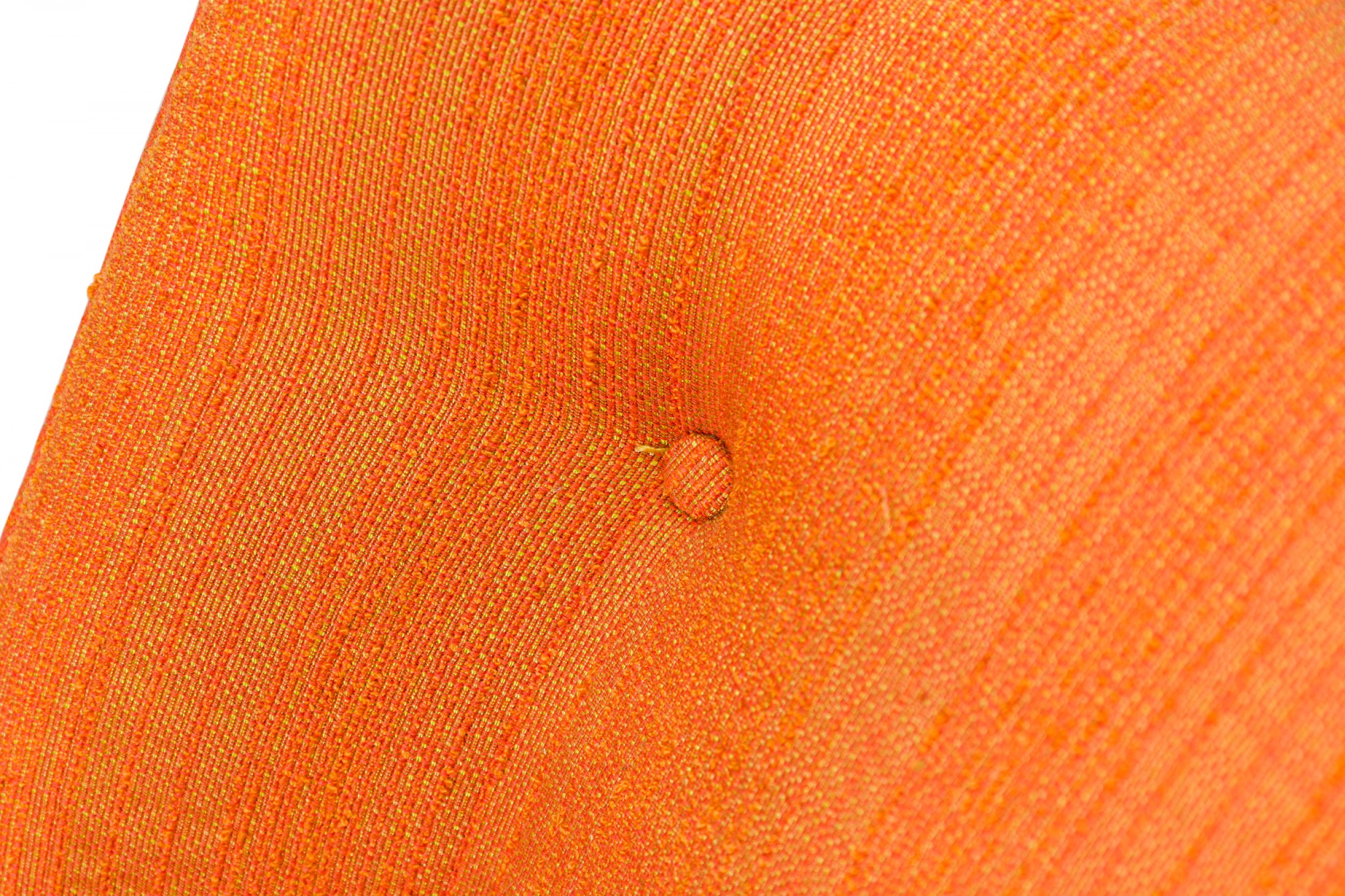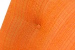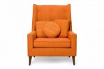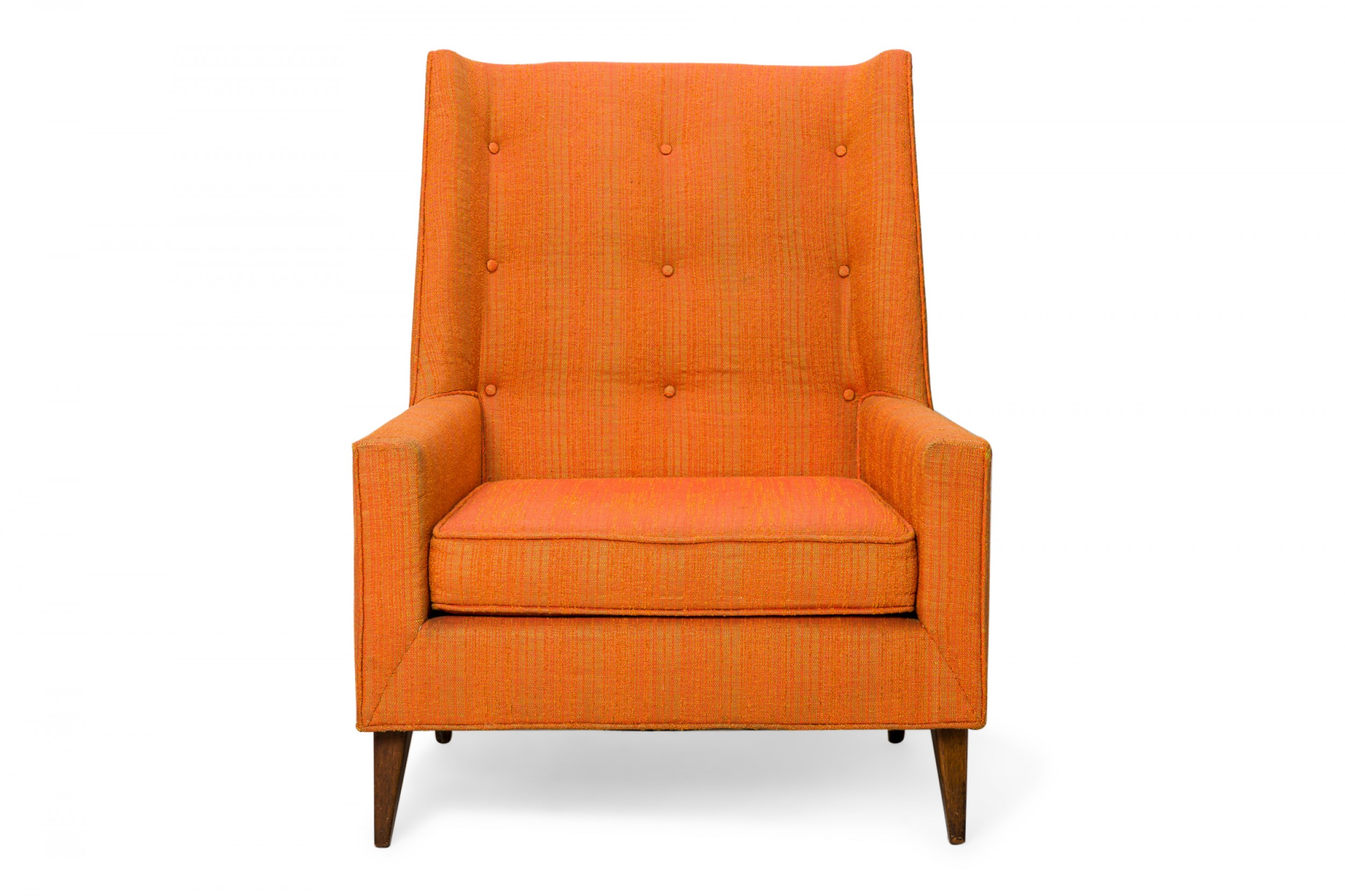 American Mid-Century arm / lounge chair with a tall back and button tufted textured orange upholstery, resting on four tapered wooden legs. (HARVEY PROBBER)
